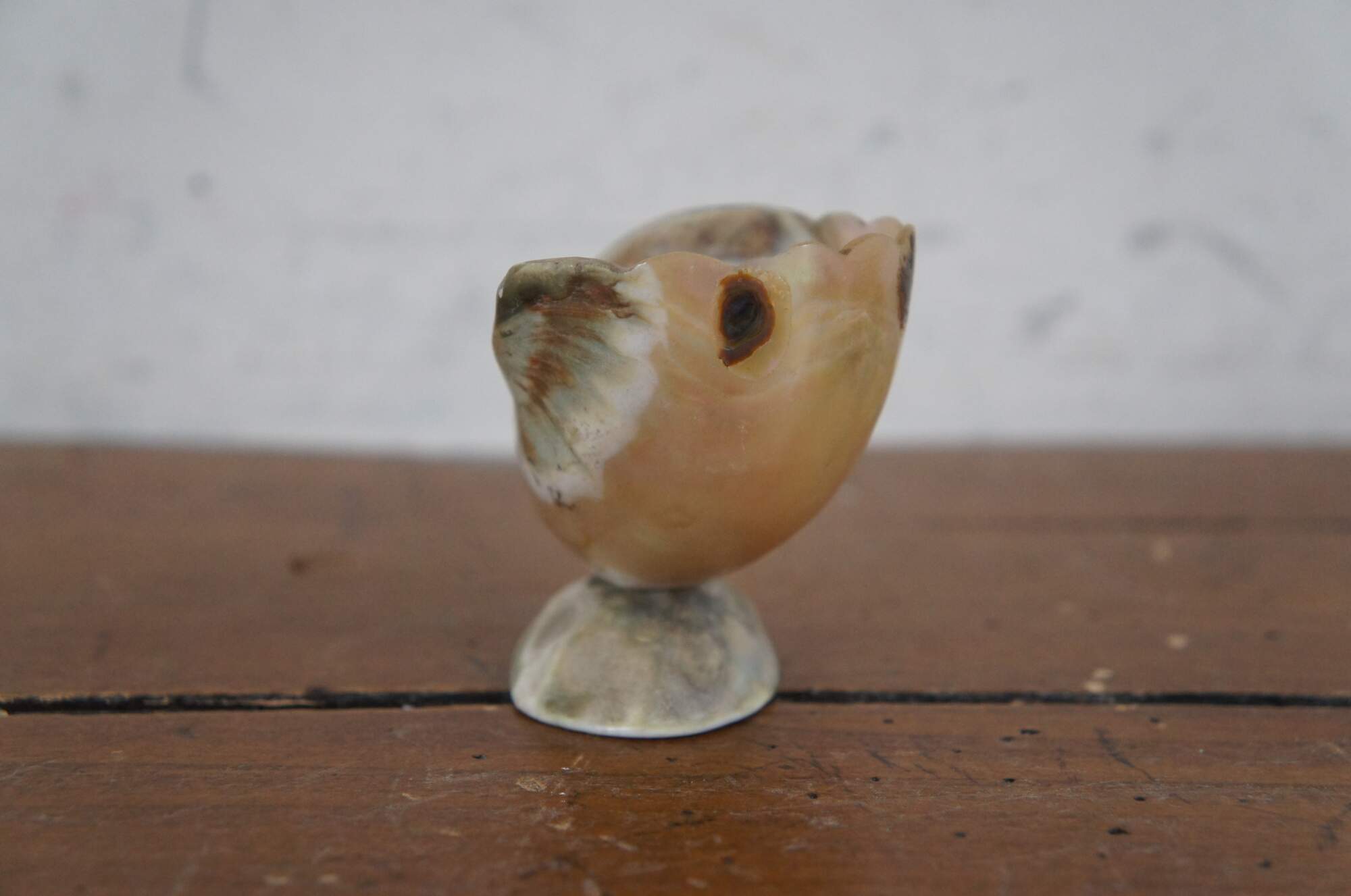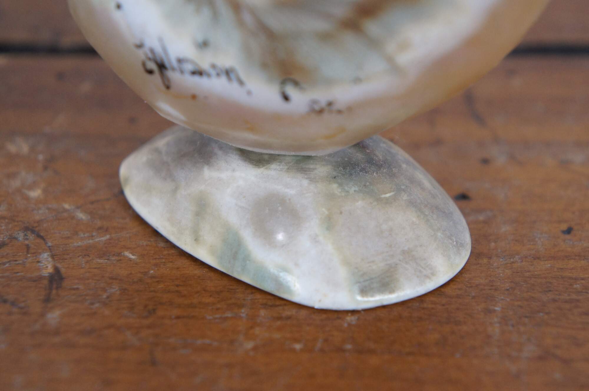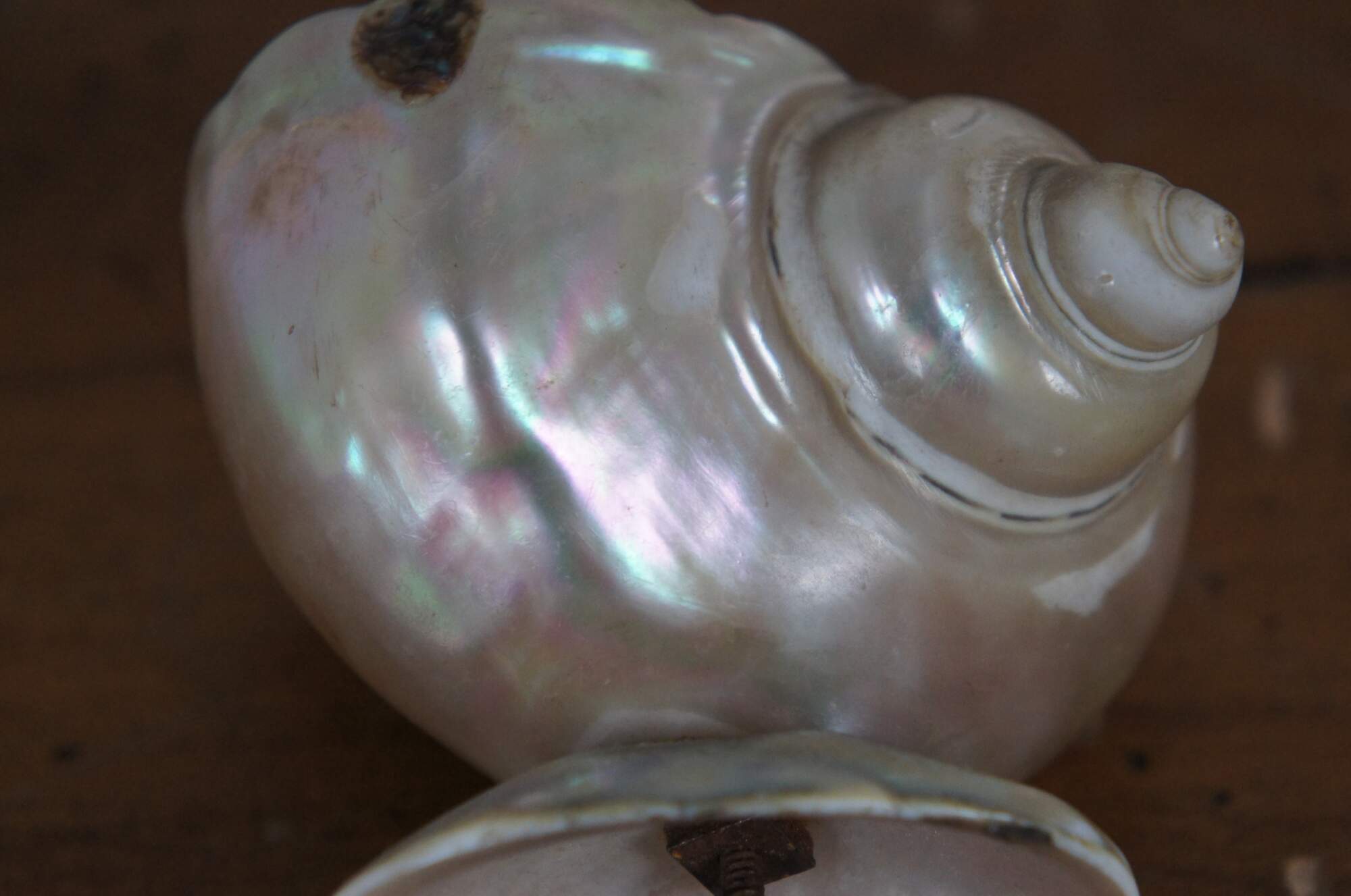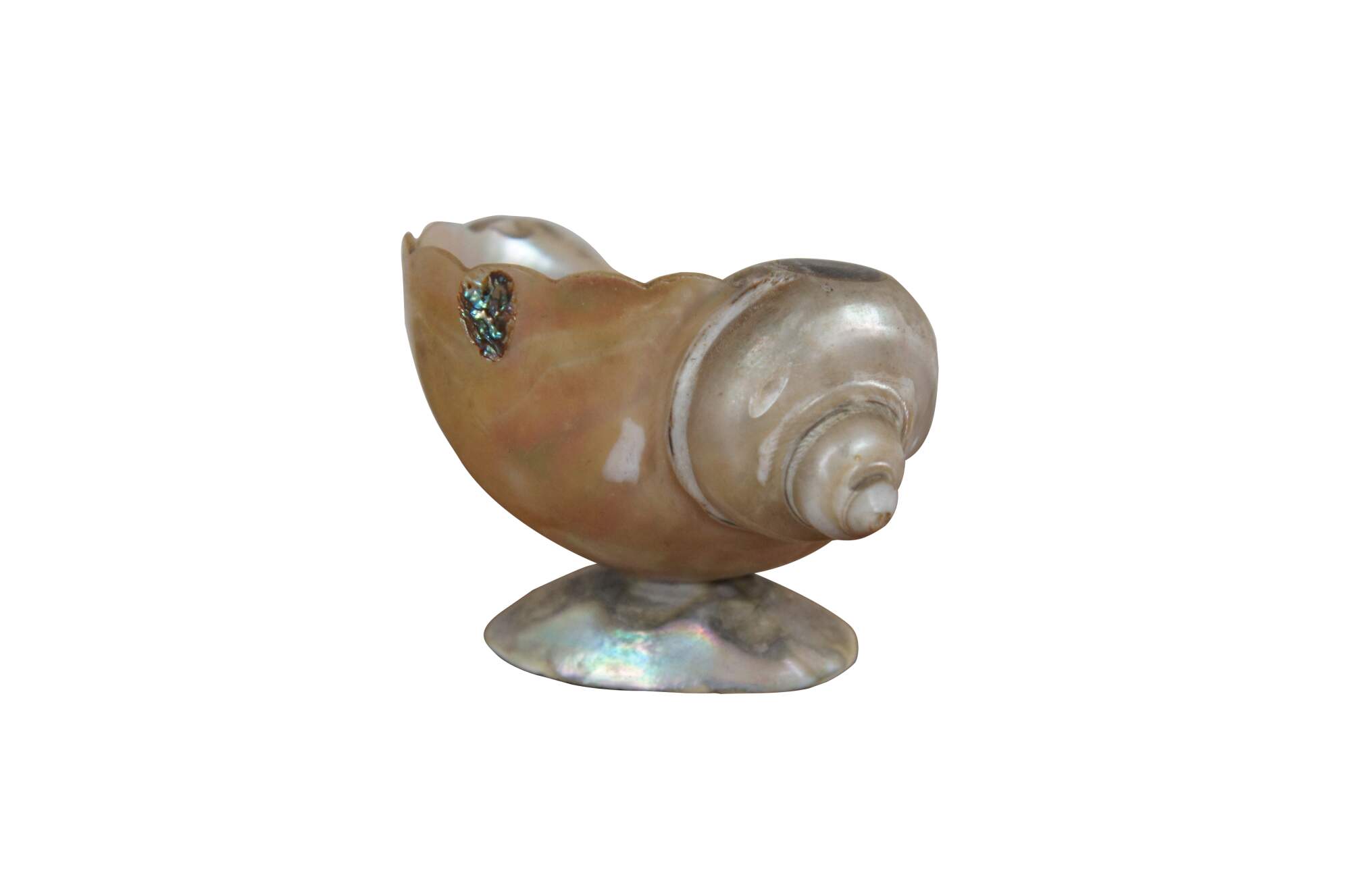 Antique polished mother or pearl spiral nautical sea shell with scalloped edge mounted to a matching base, painted with the worn name of the place it was from. Petite size perfect for use as a bud vase or ashtray / inkwell / petite compote.