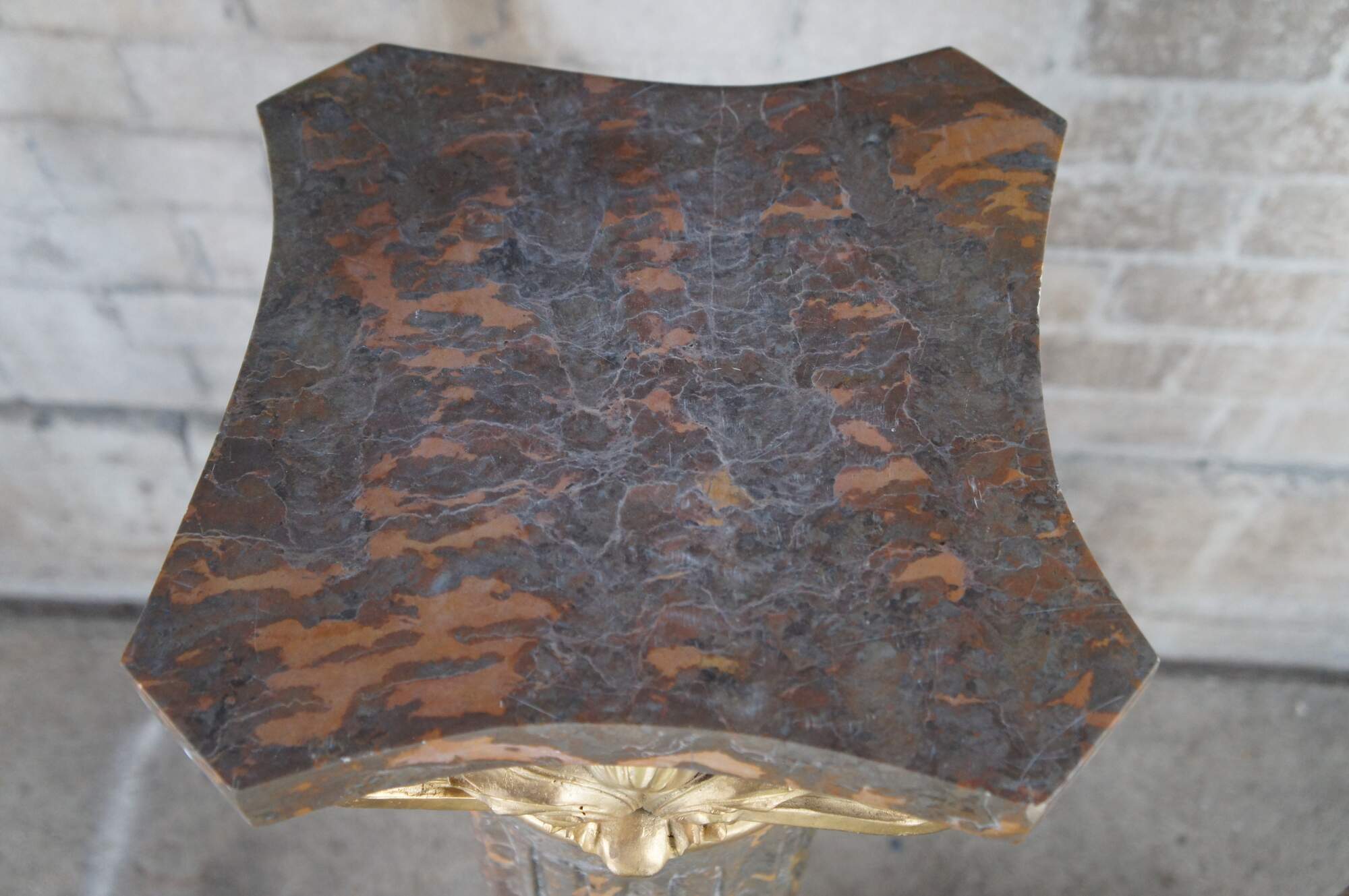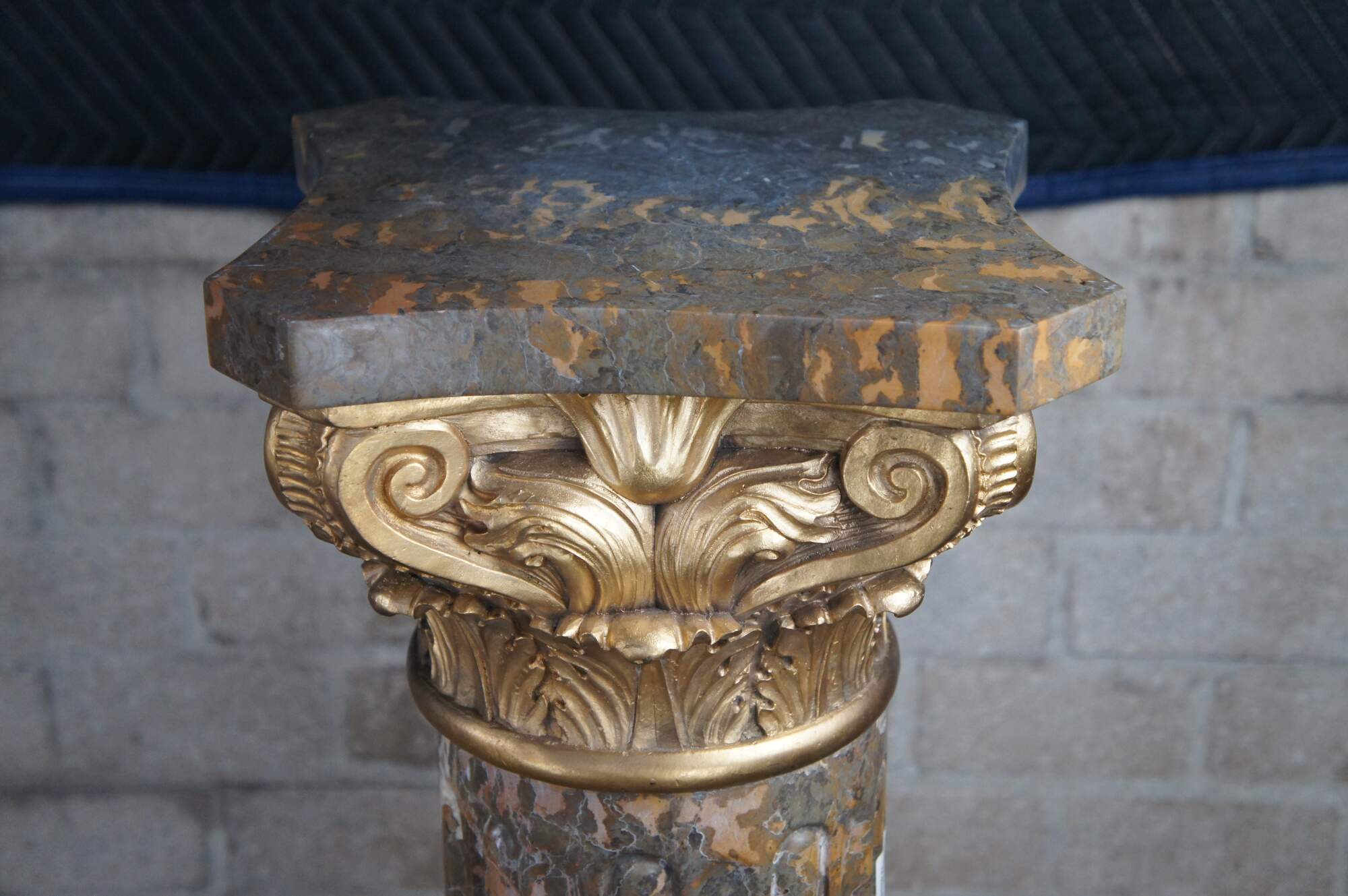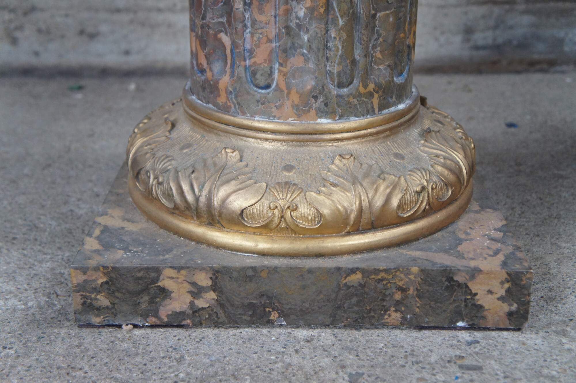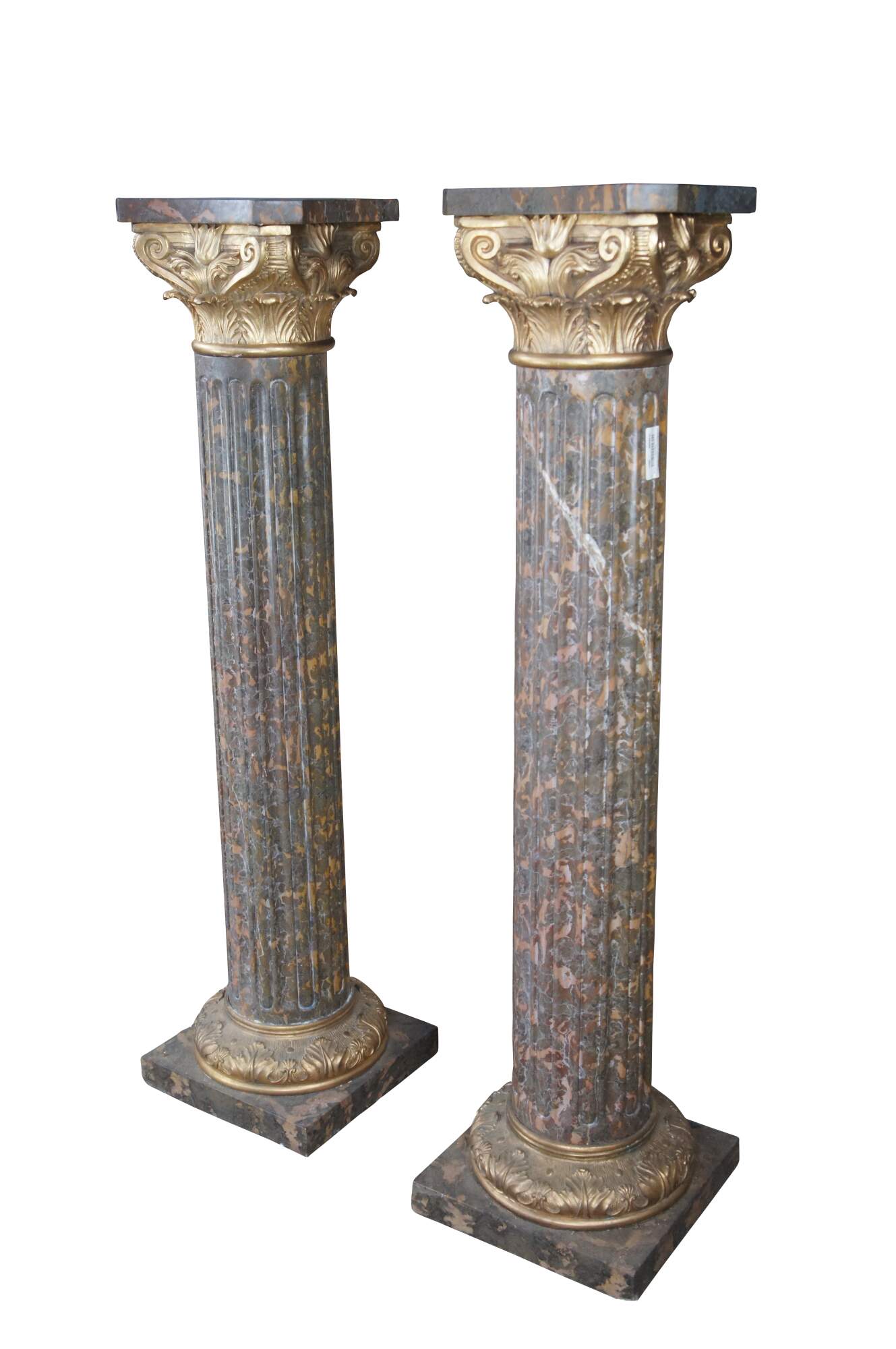 A large pair of Classical Column Napoleon III style Pedestals. Made from Tiger Gold Marble and Gilt Bronze. Features a shaped top with acanthus scrolled capital over a fluted center fitted to a square base with bronze foliate relief. These stands display perfectly and will make a stately addition to any space. Great for displaying sculptures, vases, clocks or otehr collectibles.