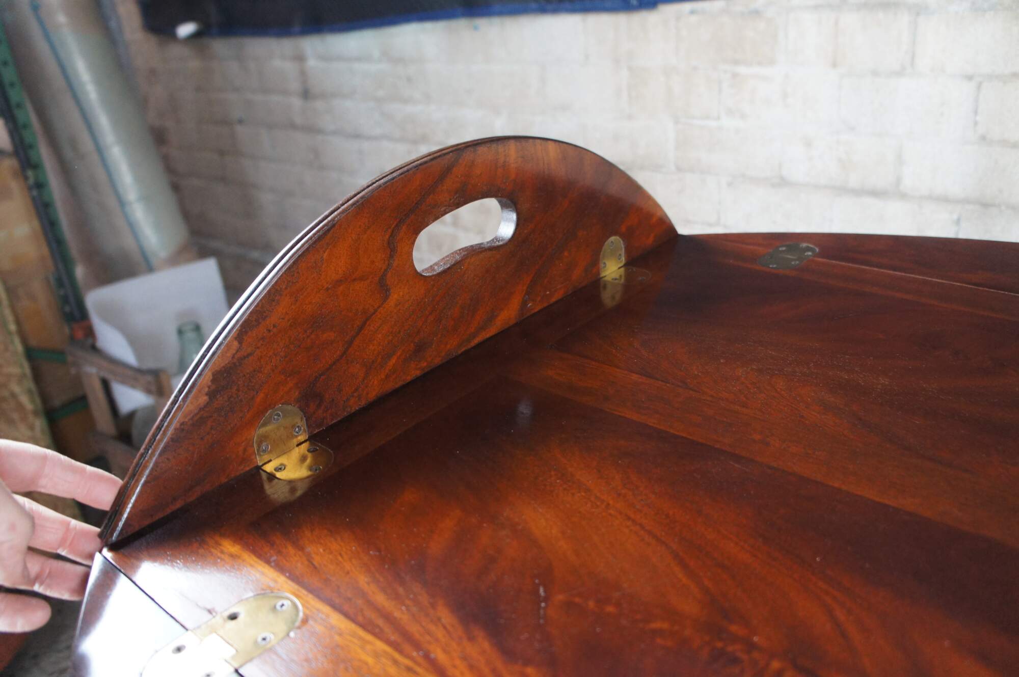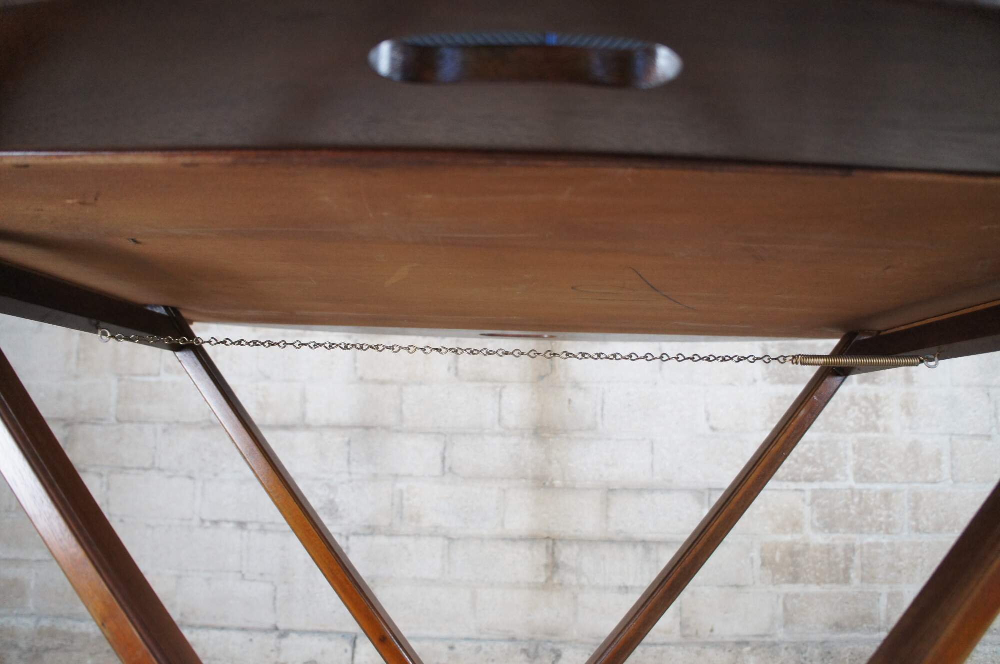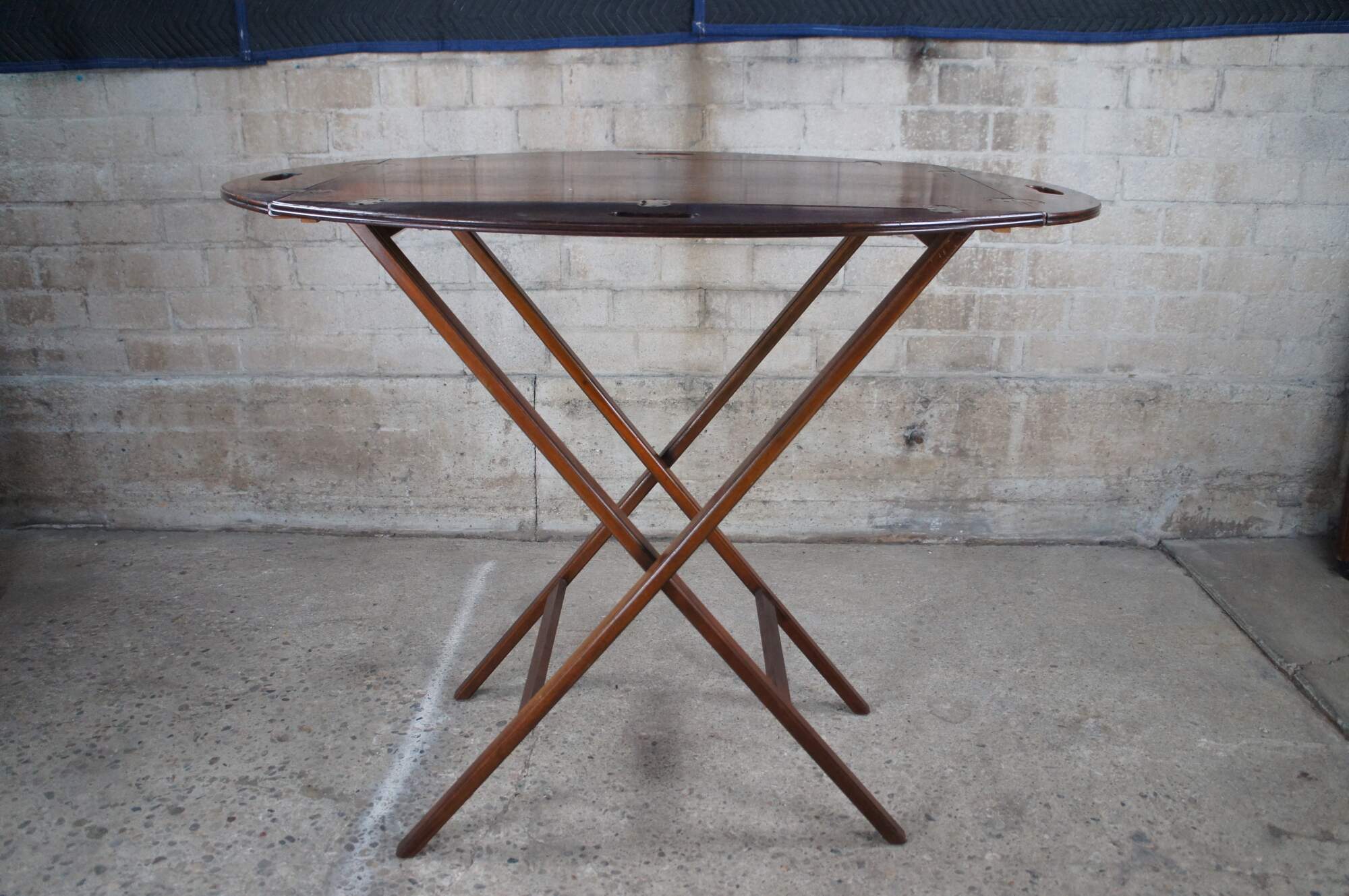 20th Century Georgian Mahogany Campaign Style Butlers Table. Features an oval removable tray with folding edges for carrying over a stand.