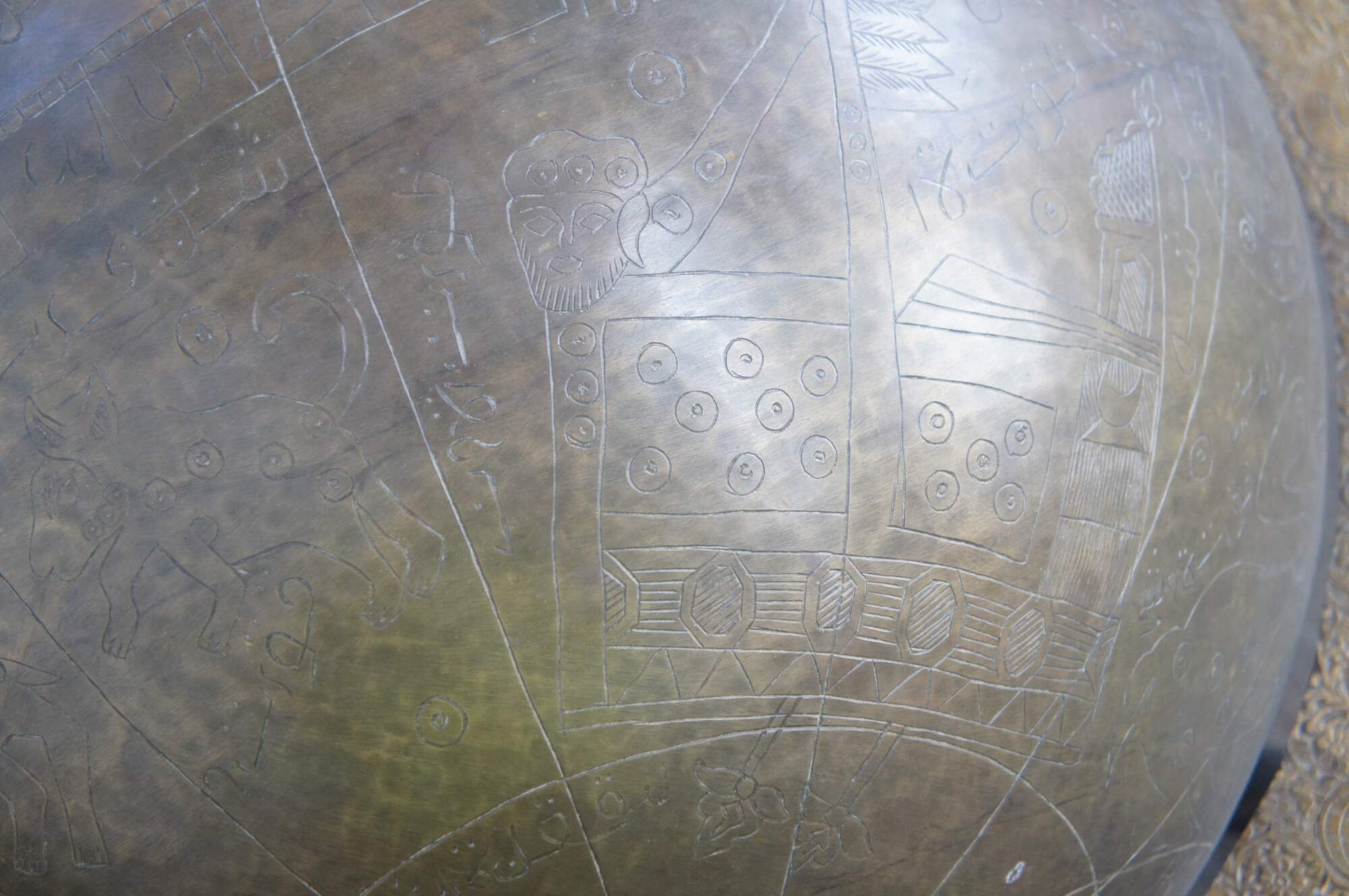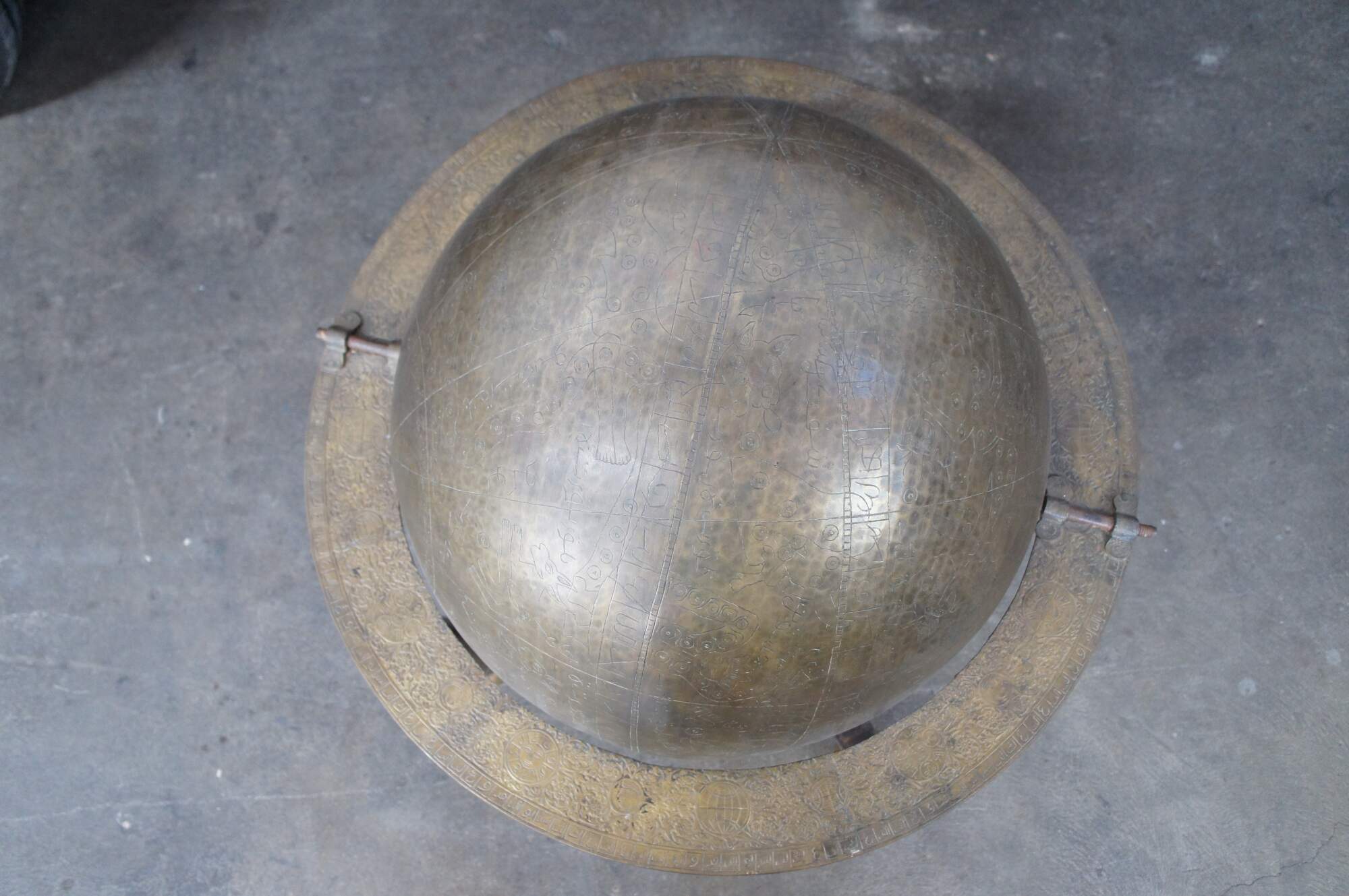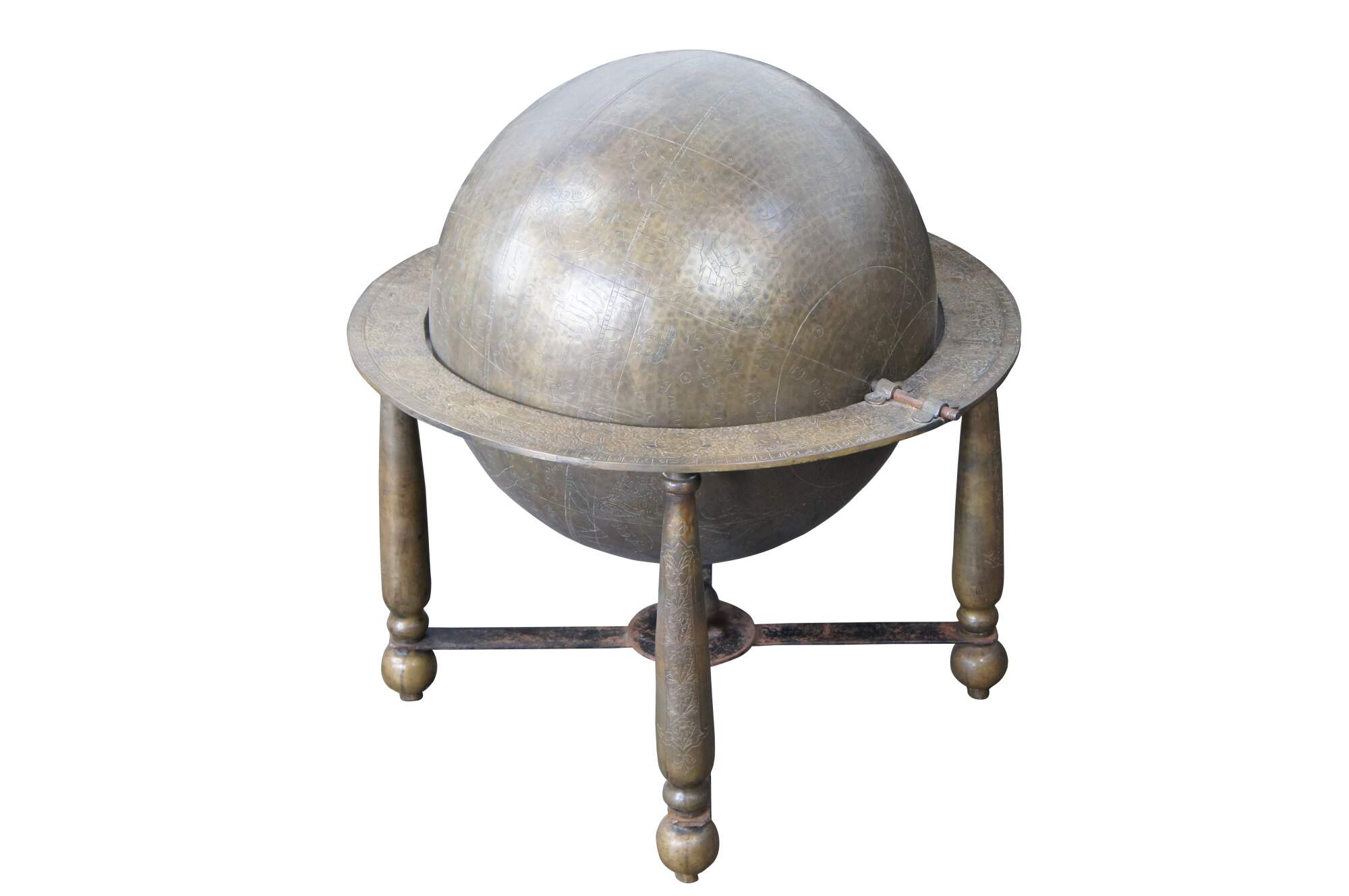 An exceptional large brass Islamic Celestial Globe. The hammered brass sphere constructed from two hemispheres with engraved scales and constellations, pivoted within horizontal ring engraved with the twelve signs of the zodiac, raised on four turned brass legs and stretcher with central finial,