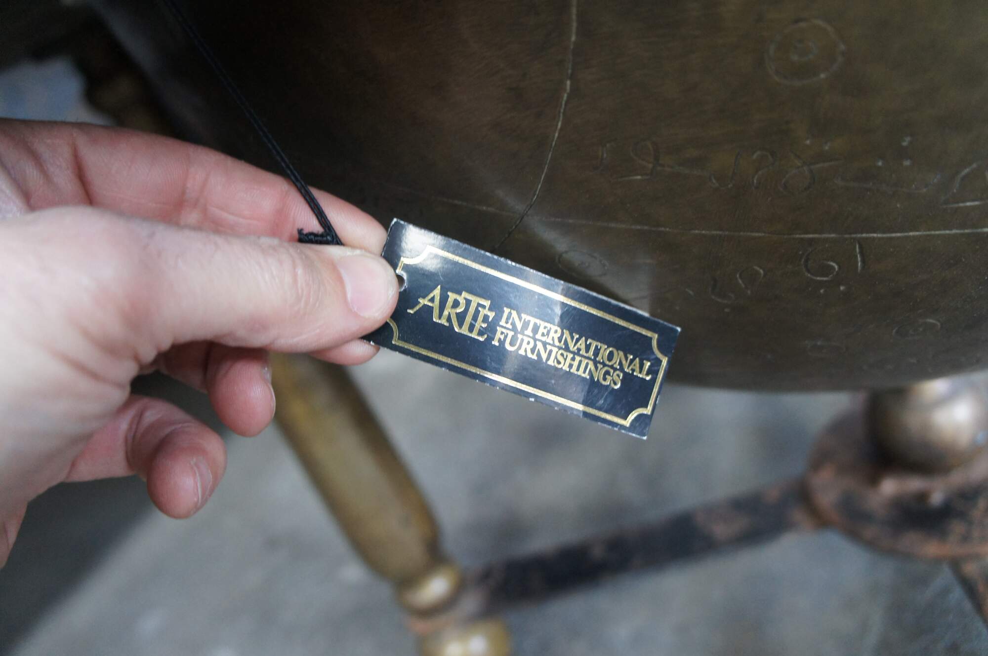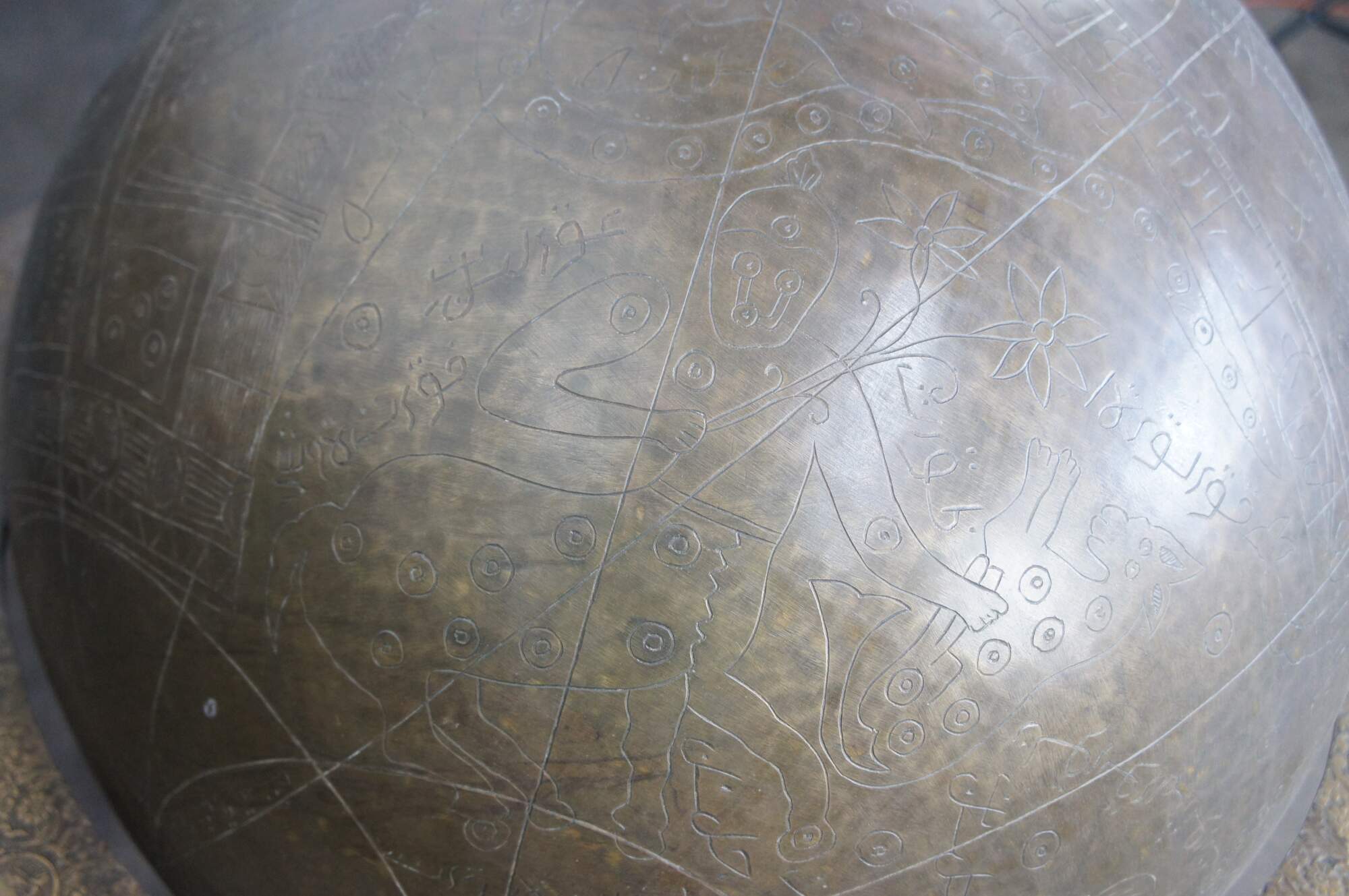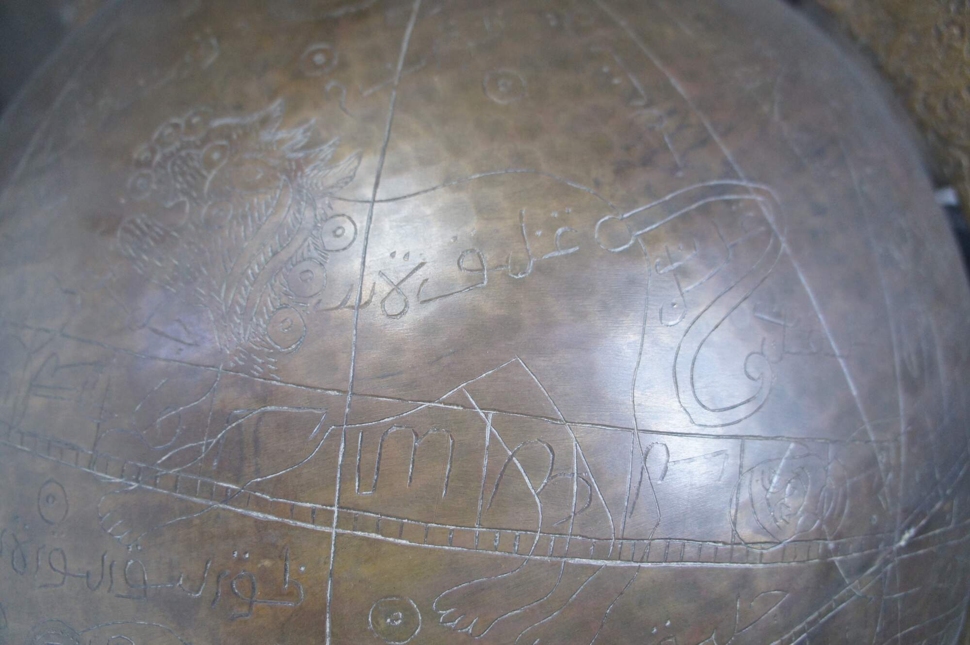 An exceptional large brass Islamic Celestial Globe. The hammered brass sphere constructed from two hemispheres with engraved scales and constellations, pivoted within horizontal ring engraved with the twelve signs of the zodiac, raised on four turned brass legs and stretcher with central finial,