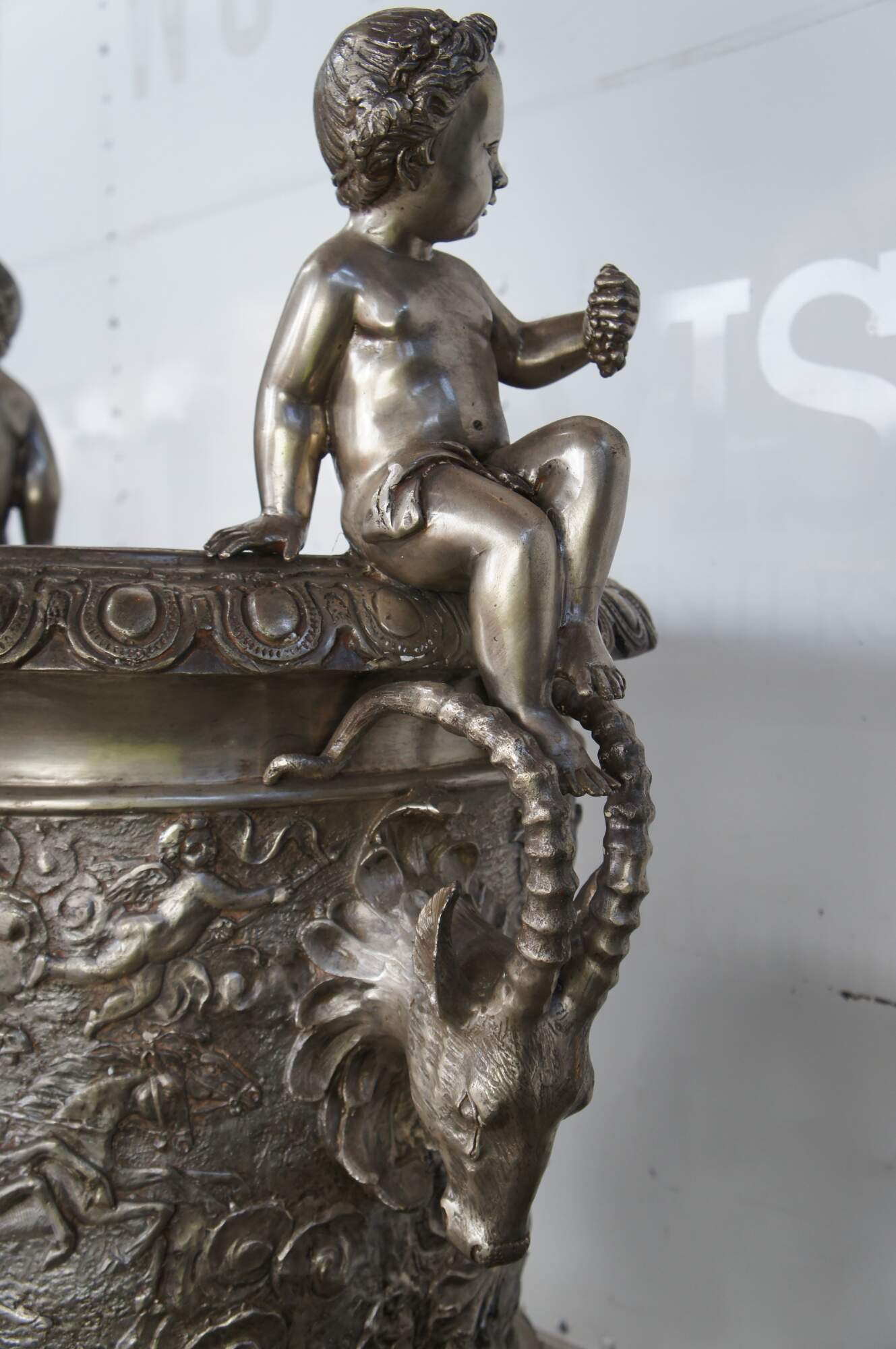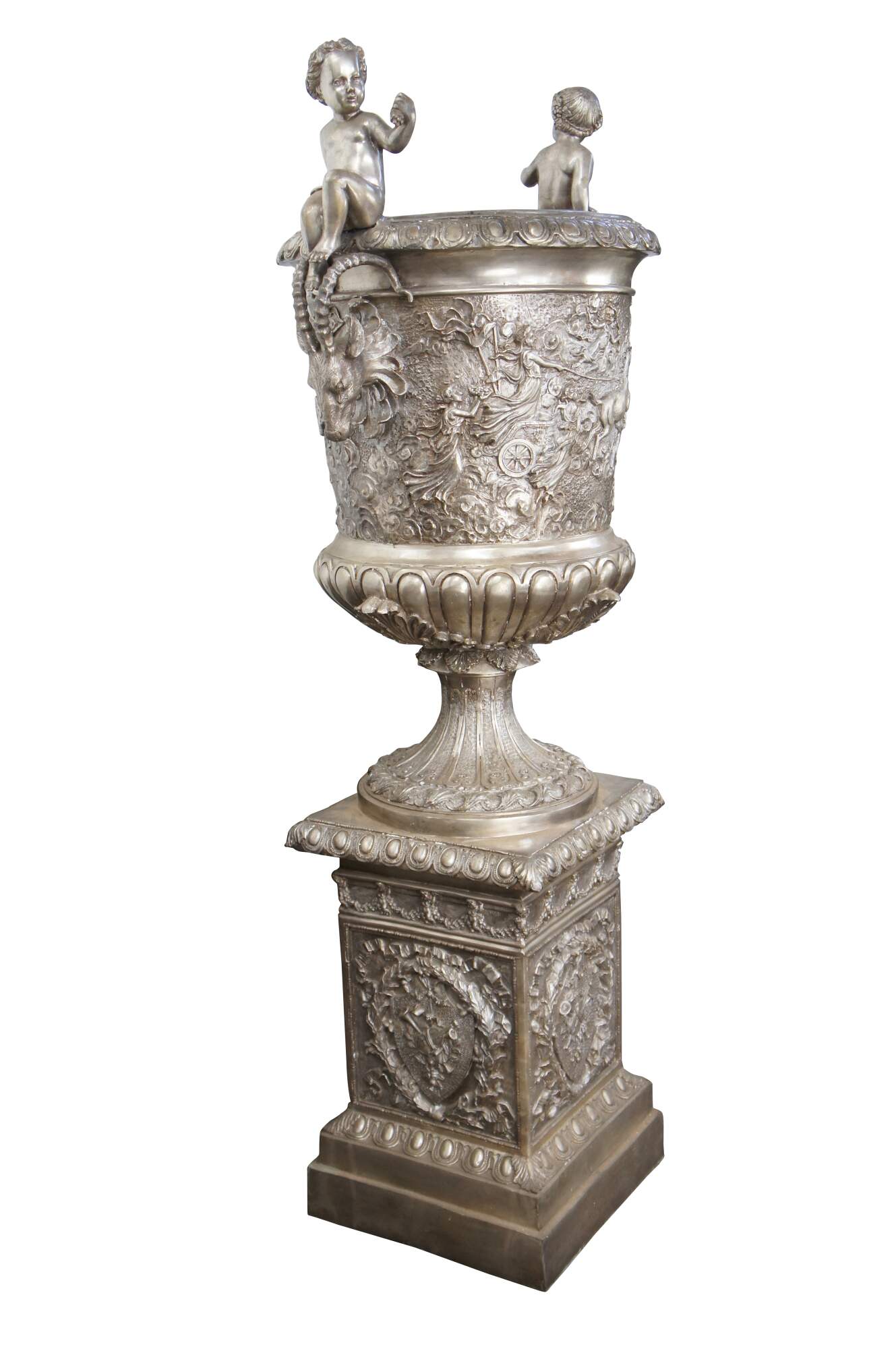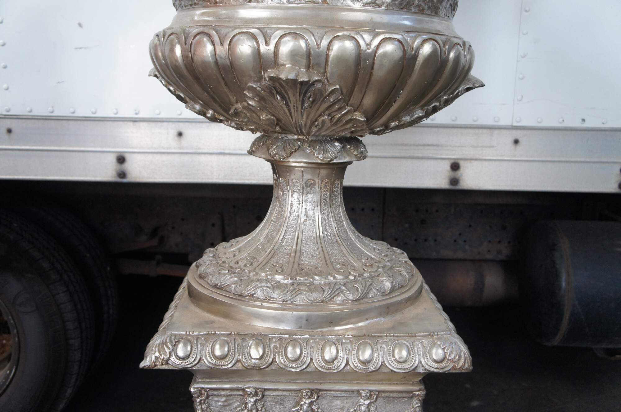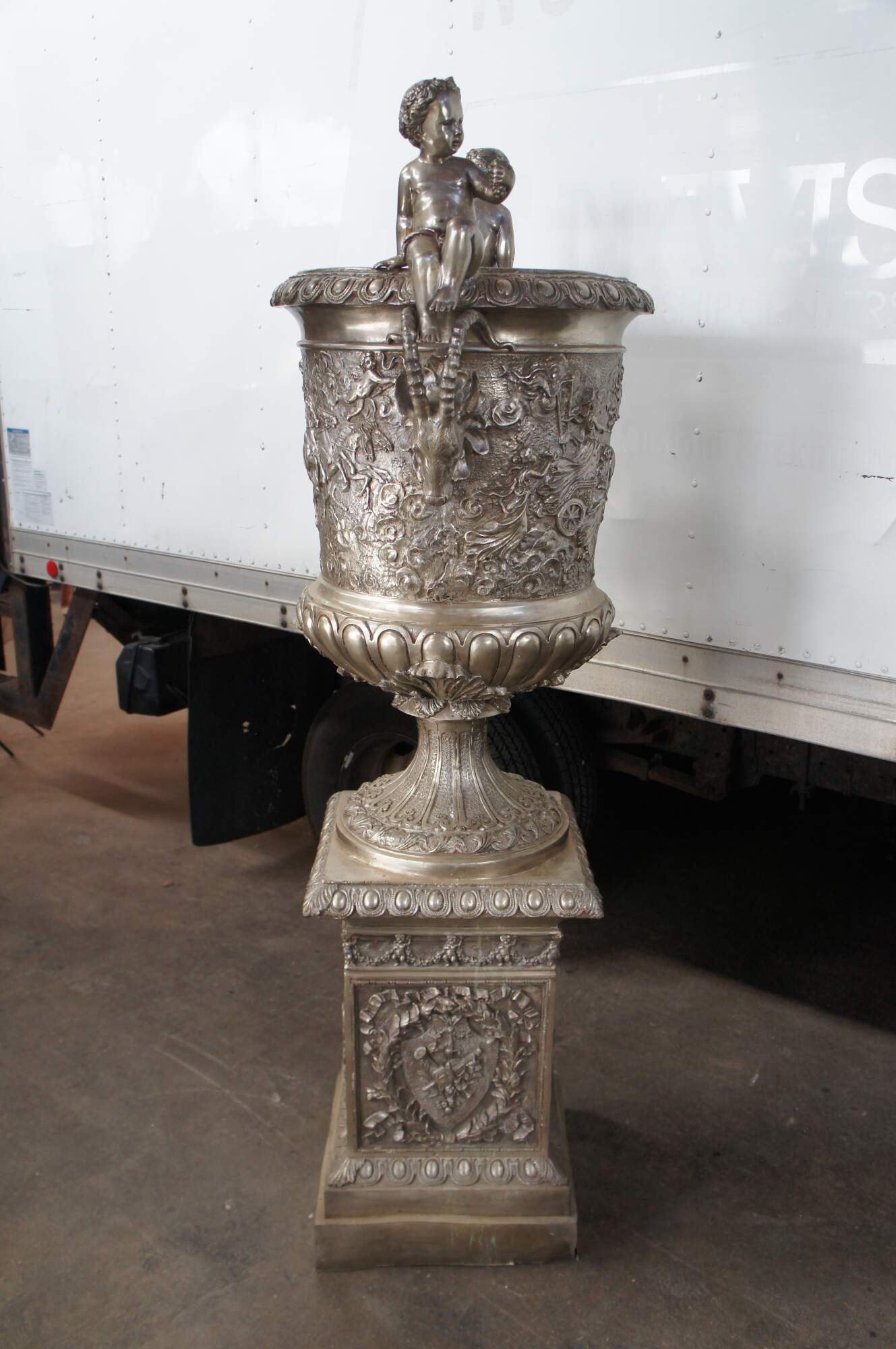 Monumental oversized French Classical figured bronze planters, circa last quarter 20th century. Perfect for display indoor or outdoor. Features figured stags on each side beneath seated cherubs with grapes. The mouth of the urn showcases an egg and dart molding. This is set over a low relief Grecian scene with maidens, horses and cherubs. Lower side of the vase shows gadrooning with acanthus and foliate designs. The urn is mounted to a large square plinth with cherubs, shields. instruments and neoclassical motifs. A true work of art that will bring grandeur and warmth to any setting.