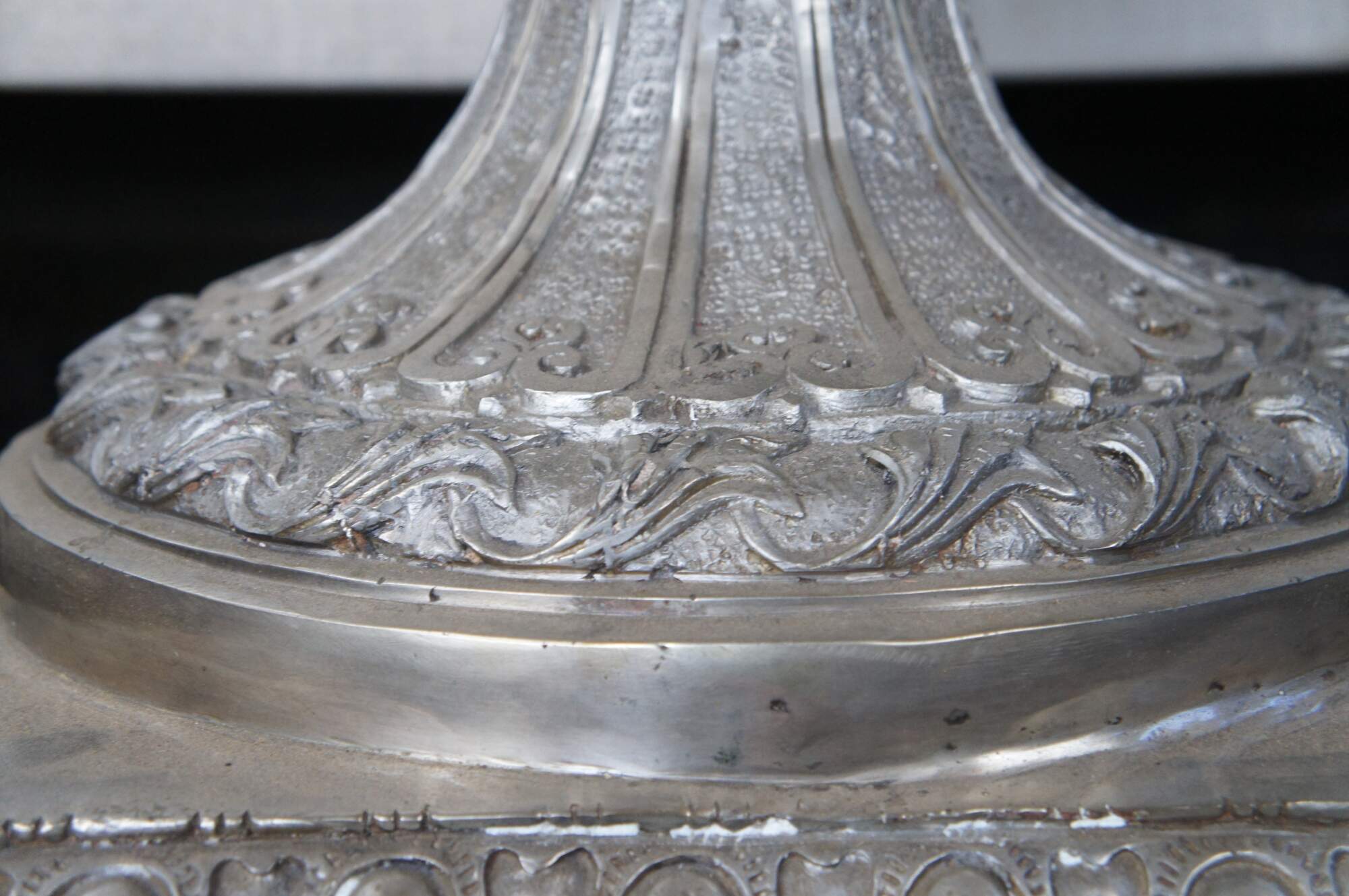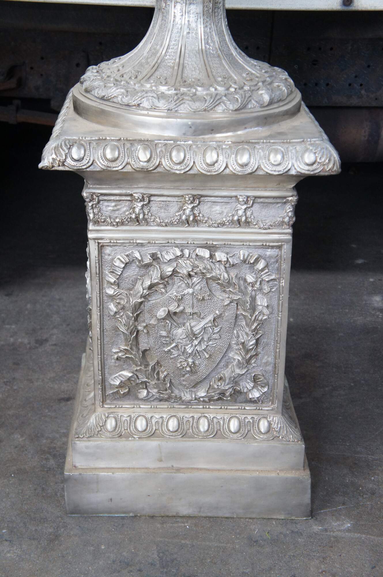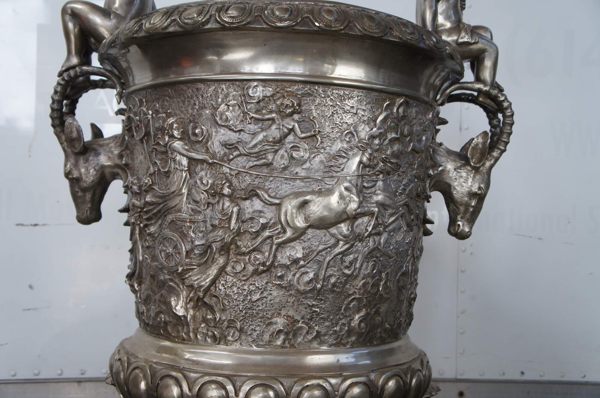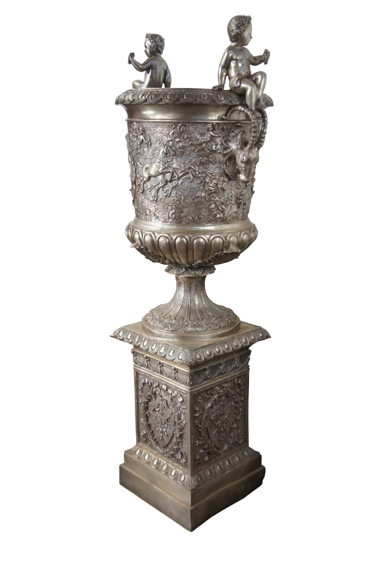 Monumental oversized French Classical figured bronze planters, circa last quarter 20th century. Perfect for display indoor or outdoor. Features figured stags on each side beneath seated cherubs with grapes. The mouth of the urn showcases an egg and dart molding. This is set over a low relief Grecian scene with maidens, horses and cherubs. Lower side of the vase shows gadrooning with acanthus and foliate designs. The urn is mounted to a large square plinth with cherubs, shields. instruments and neoclassical motifs. A true work of art that will bring grandeur and warmth to any setting.
