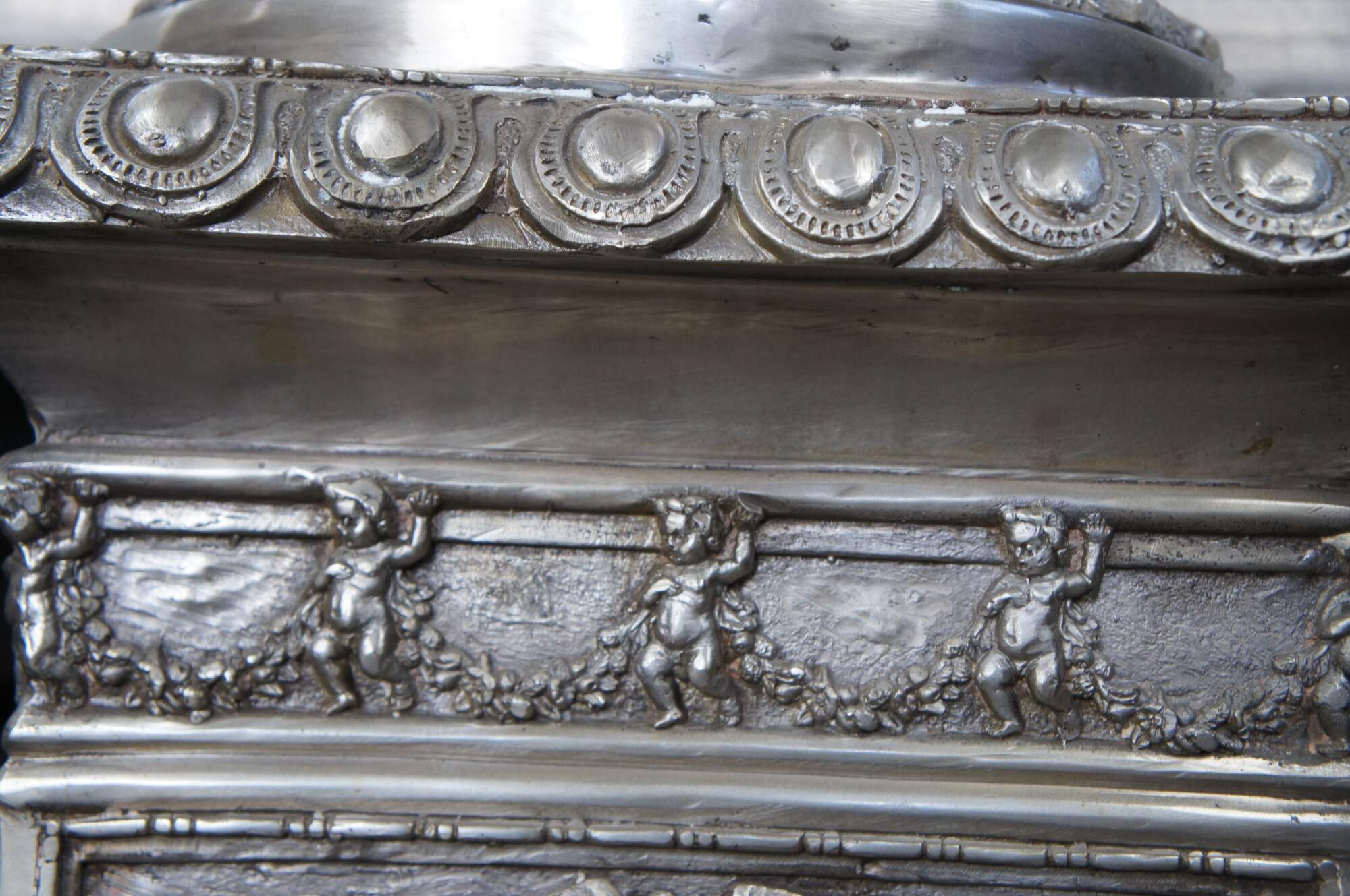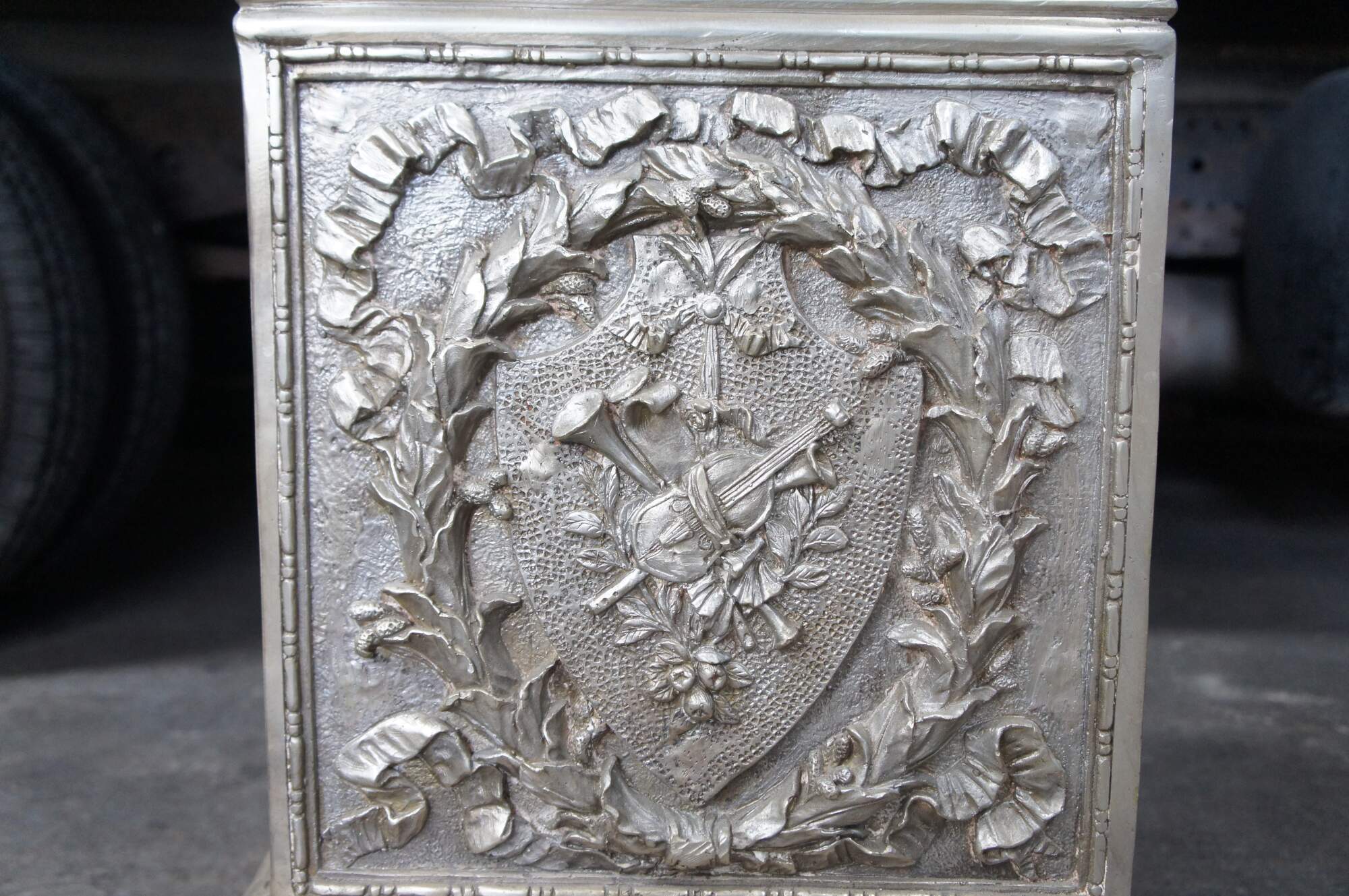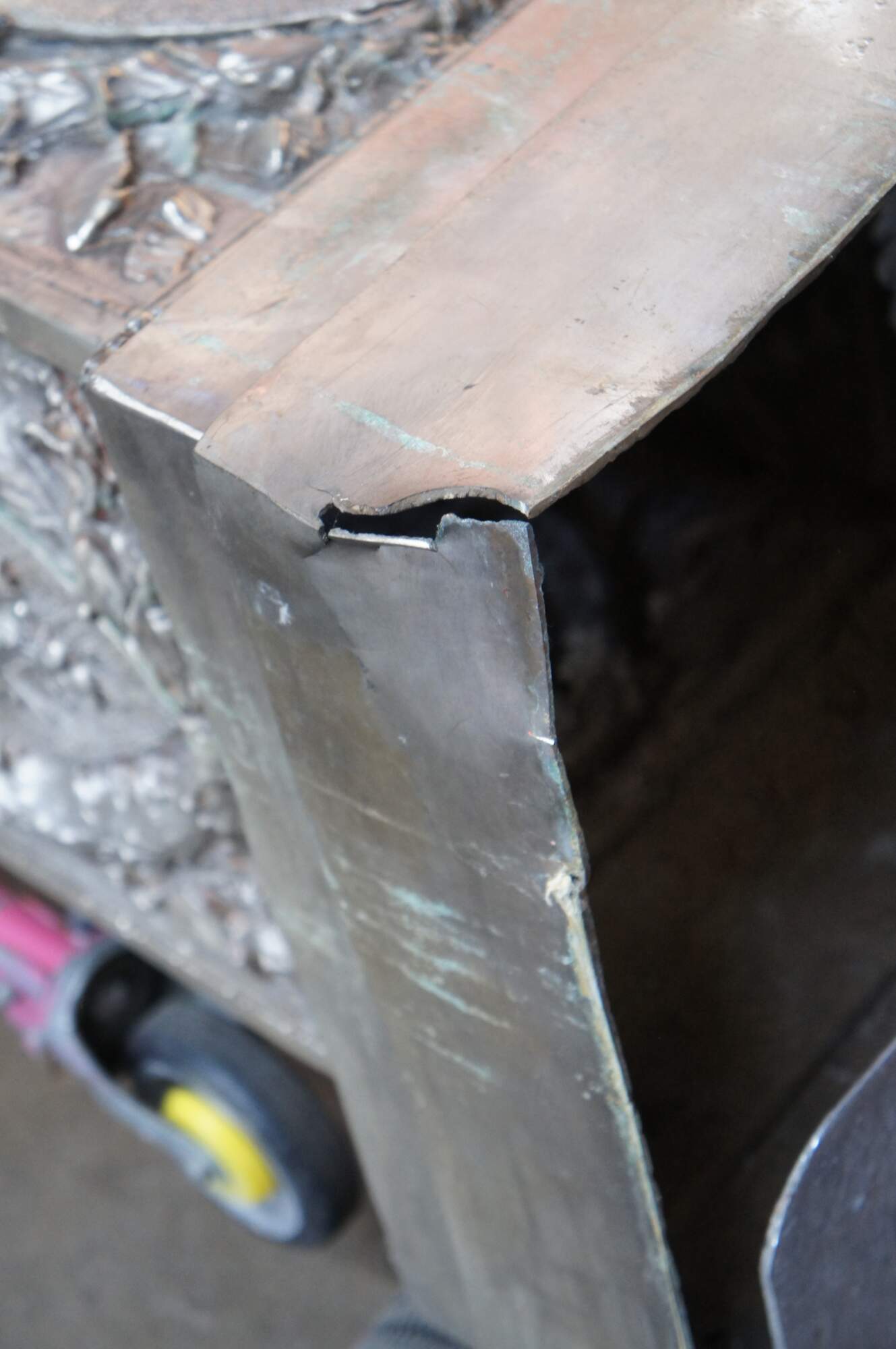 This urn is in great condition; there is a split / crack and bend at the seam of one of the corners along the base