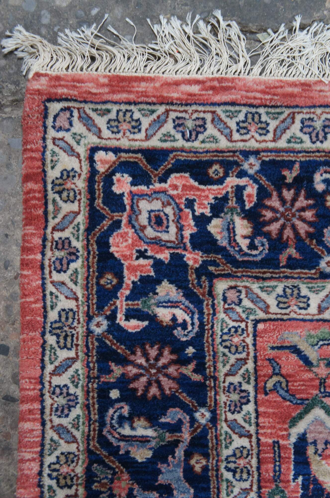 Vintage Pande Cameron of New York Oriental area rug or carpet. Made of wool featuring a Royal Jahan design with star medallion with florals, vines and leaves. Reds, blues, pinks, greens, brown. Royal Jahan is a style of handwoven Indian rug that features a star medallion on a red background. The medallion can include ivory, black, shades of green, ruby, and pale blue. Made in India.