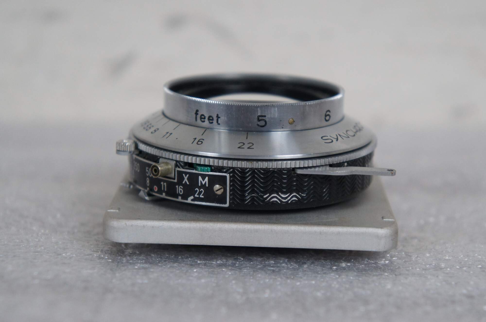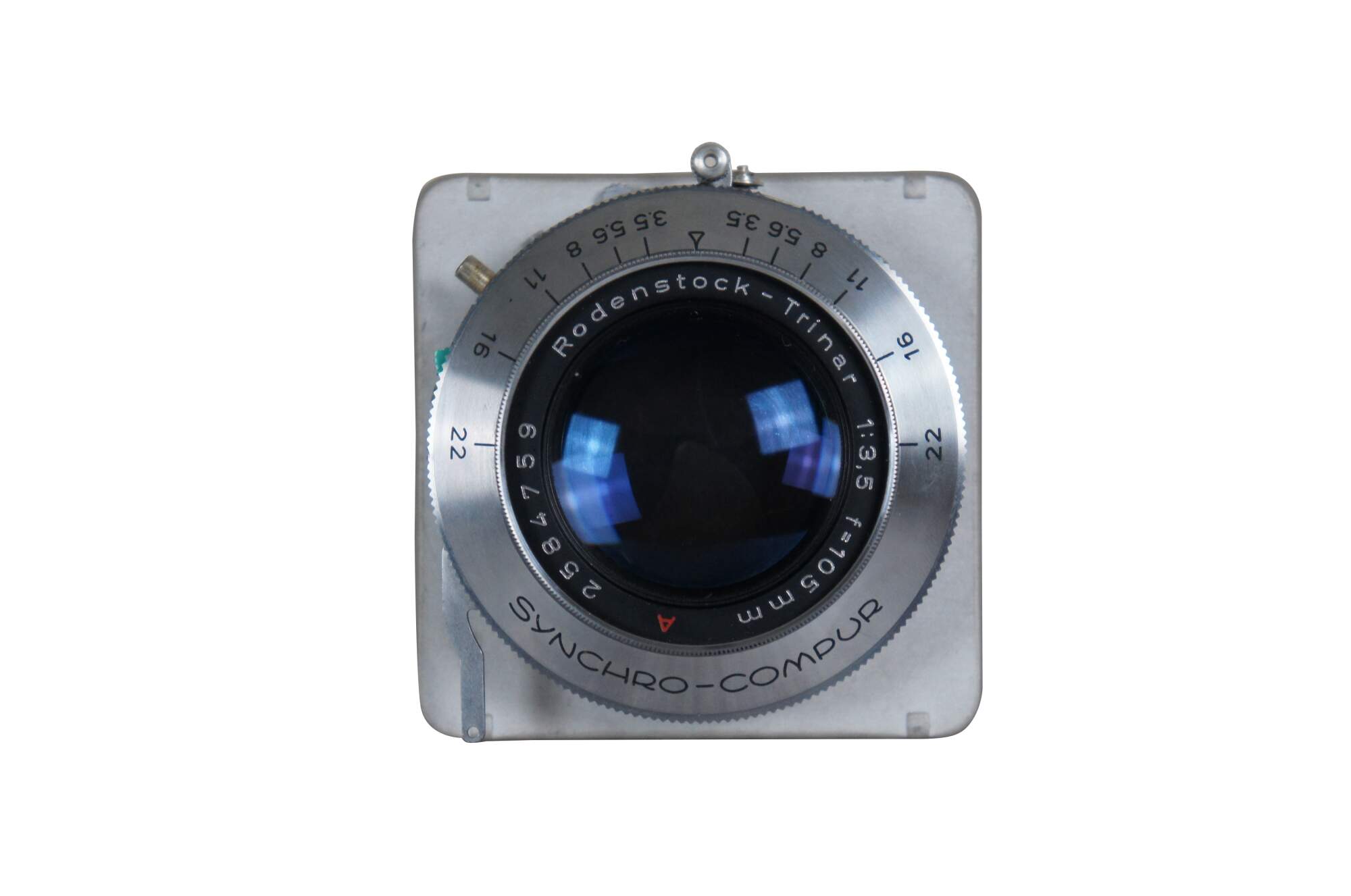 Rodenstock-Trinar camera lens (1:3,5 - f=105mm - Red A - 2584759) and Synchro-Compur camera shutter attached to metal mounting board. Shutter numbered 8056281.