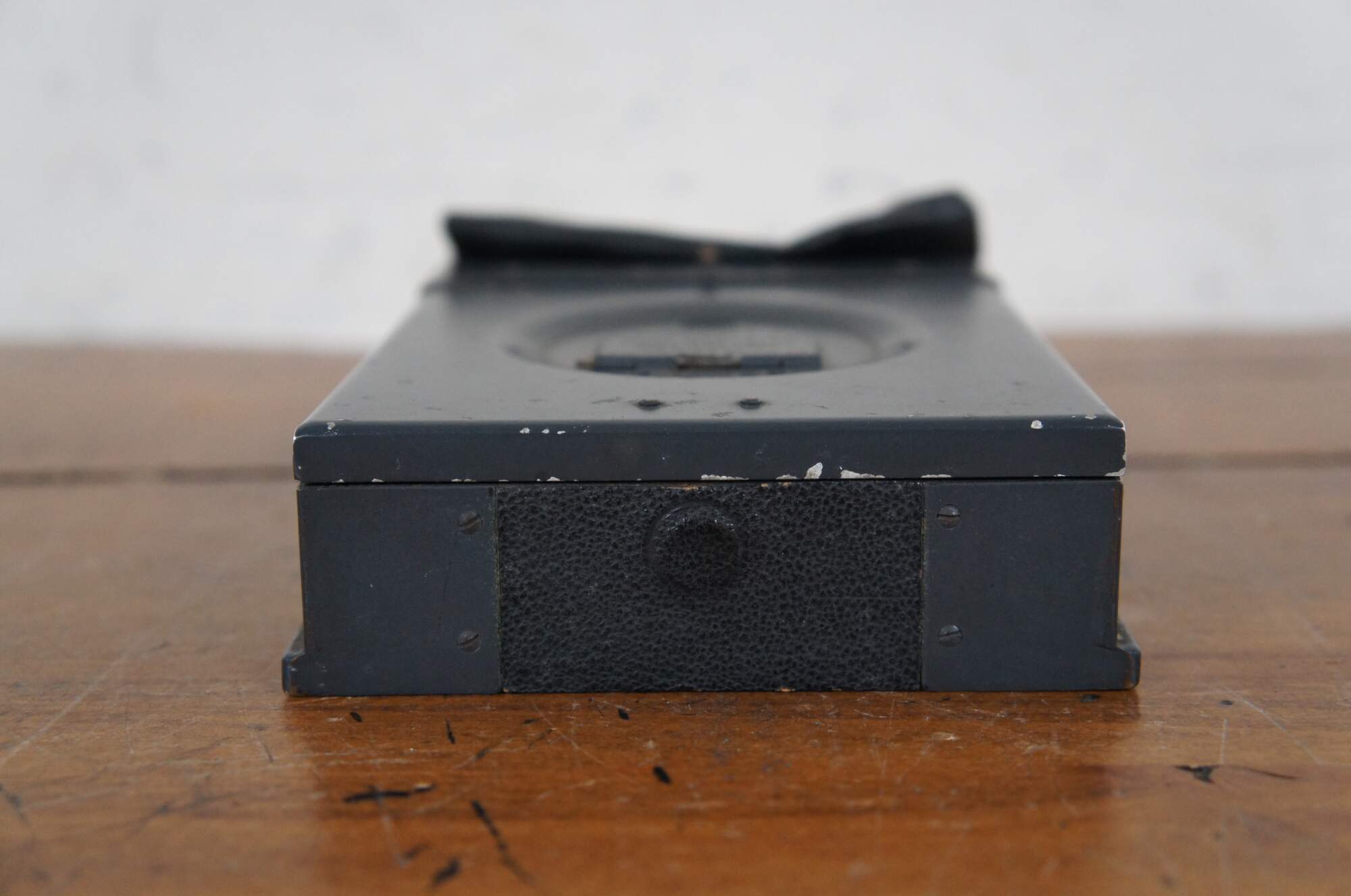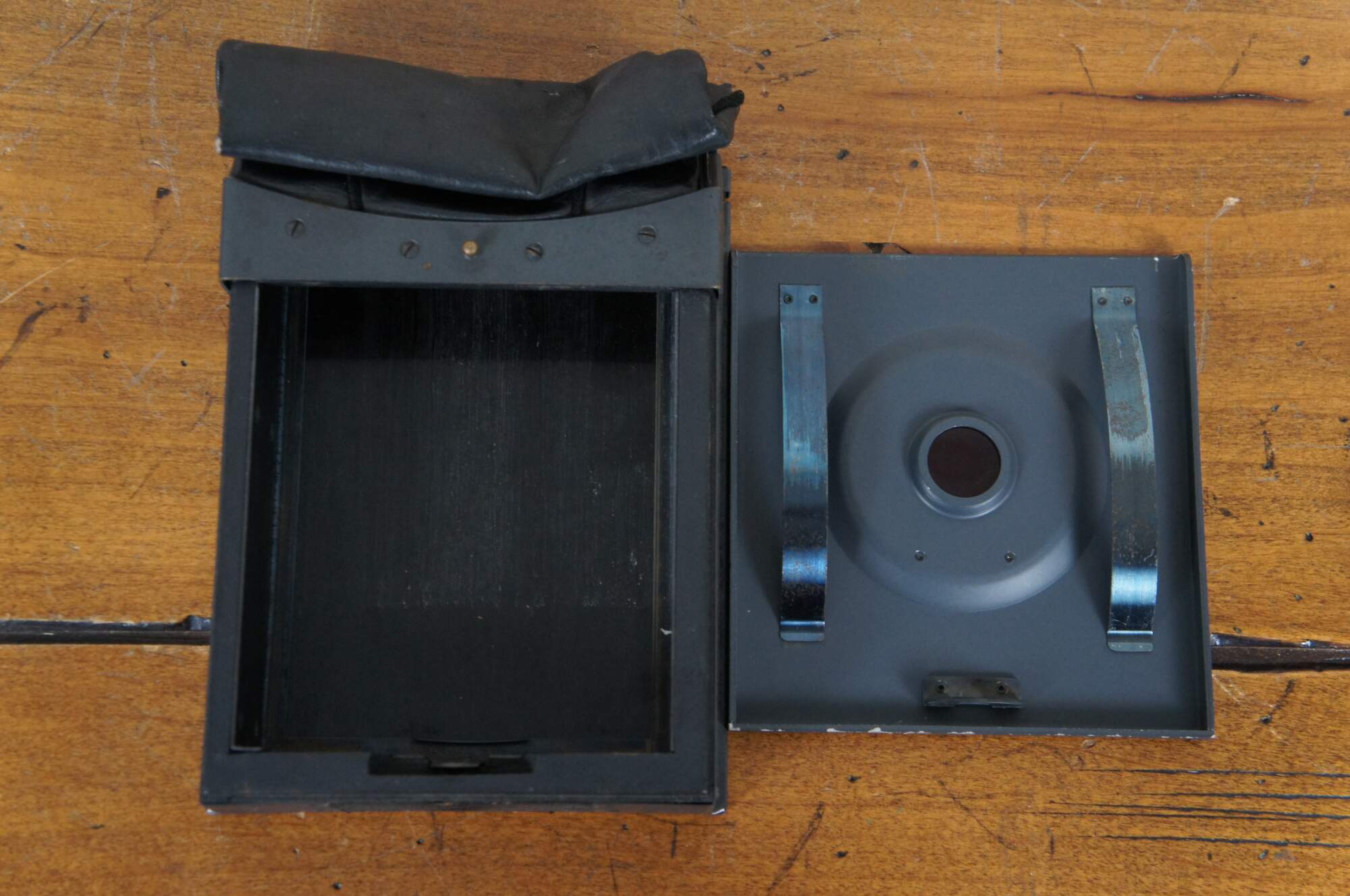 Early to mid 20th century Graflex Cut Film Magazine. Black metal body with black leather changing bag, ruby red view window under front flap, protective slide on back, built in sliding rod, and 12 metal septums numbered with white painted Arabic numerals. Manufactured by the Folmer Graflex Corporation, circa 1928-1946. Includes original box.