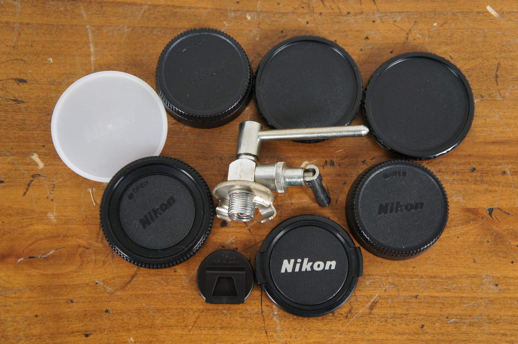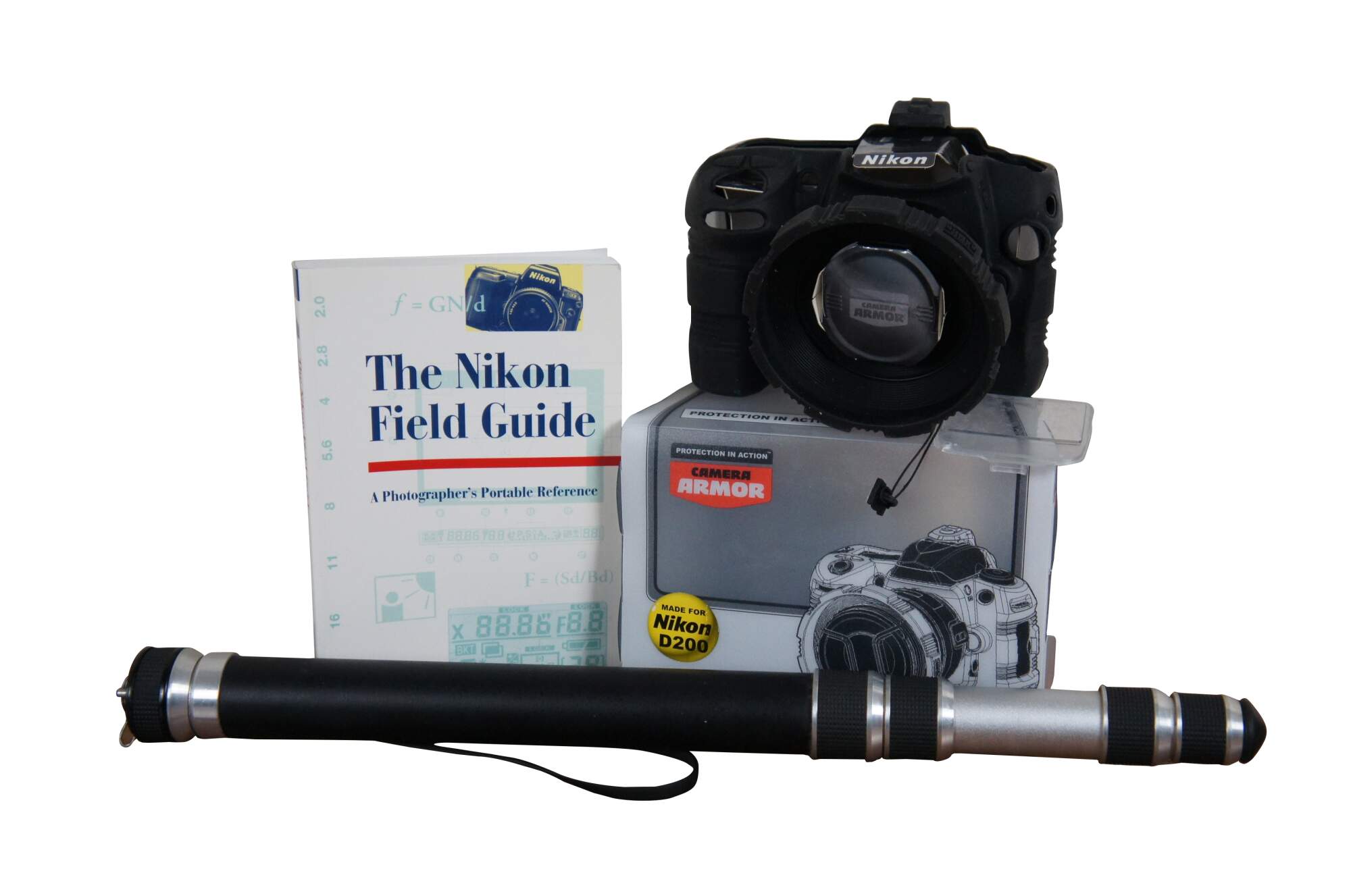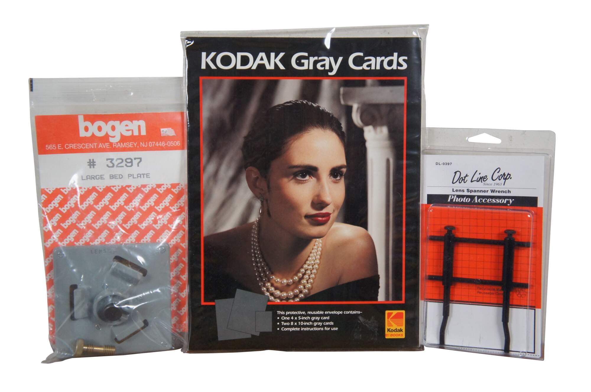 Lot of mid to late 20th century photography / camera accessories. Lot includes: Bogen #3297 Large Bed Plate, un-opened package of Kodak Gray Cards, un-opened Dot Line Corp Lens Spanner Wrench, "The Nikon Field Guide: a Photographer's Portable Reference (First Edition 1998 - Published in the United States of America by Silver Pixel Press - Copyright 1998 by Thom Hogan - Printed in Belgium - ISBN: 1-883403-44-8), Nikon D200 Camera Armor in black with original packaging, Accura 5 Sec Zoompod monopod, 3 camera straps, Nikon CL-43A lens storage hard case, Nikon SS-24 lens storage bag, Argus Pre-Viewer III, 1946 Lawrence Engineering Service Flashrule with original envelope, 2 small black square wooden covers for somethng, piece of gray ridged foam board, XPS lens cloth, 3 packs Kodak Lens Cleaning Paper / Lens Tissue, one pack medium and 2 packs small Nega File envelopes for negatives, 2 un-opened packages Kalt Moisture Dry Desi Pak desicant packs, circular tripod ring collar mount, 8 assorted lens caps, and one darkroom compressed air can valve.
