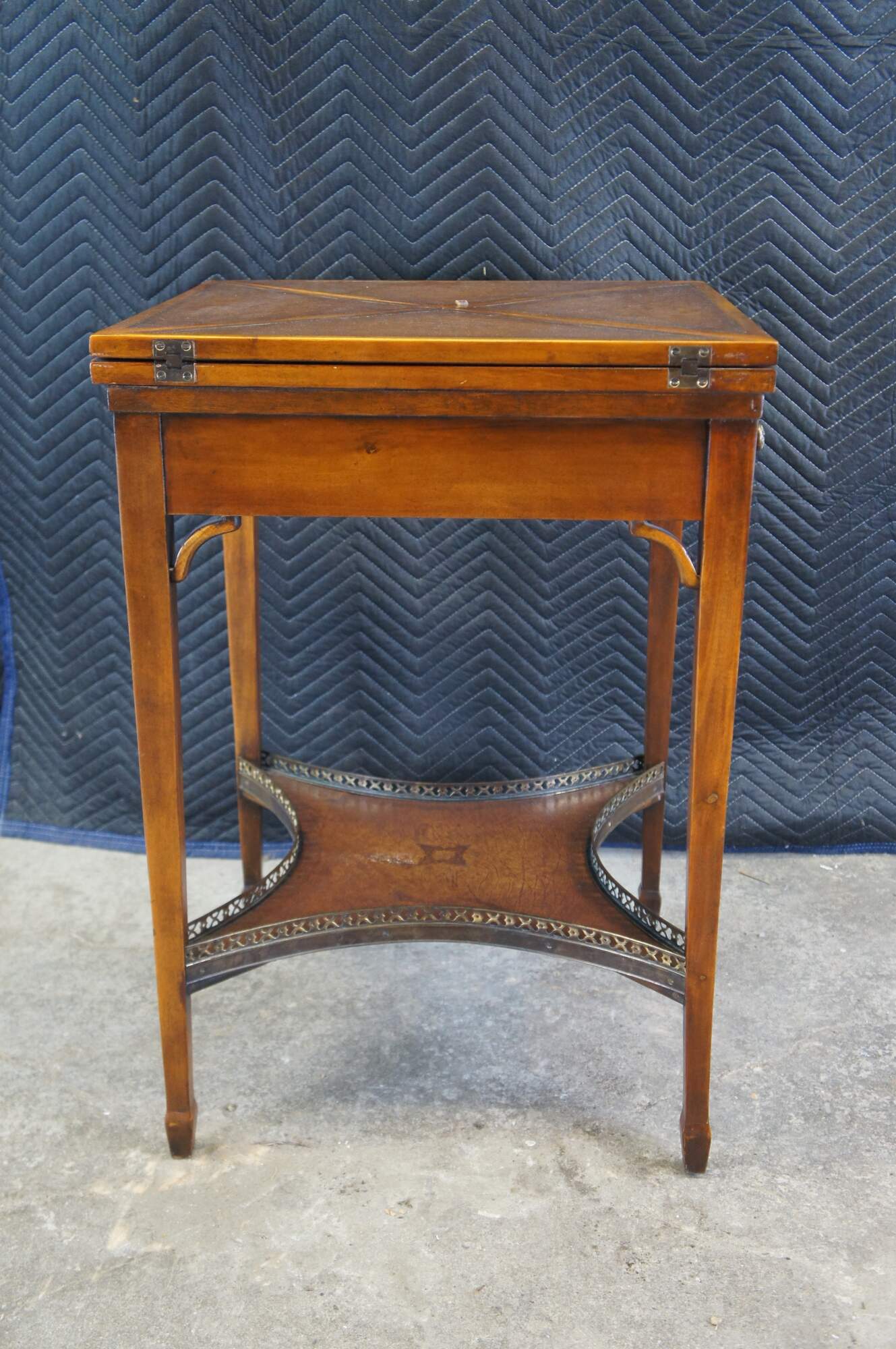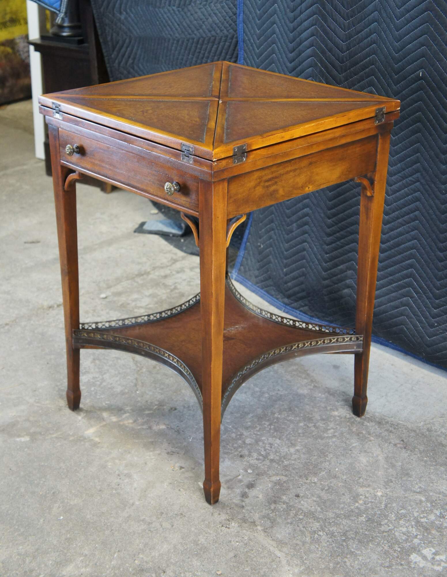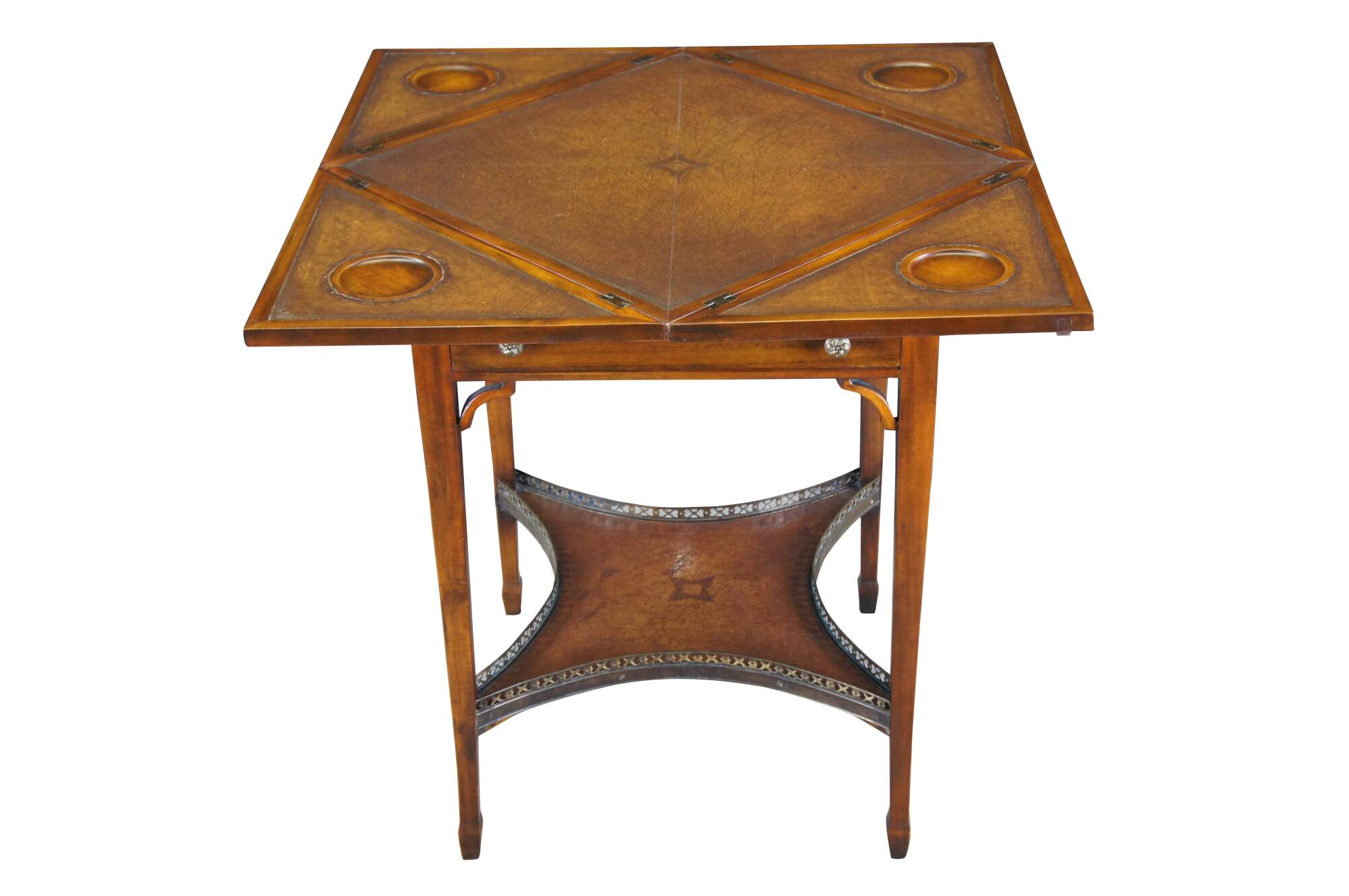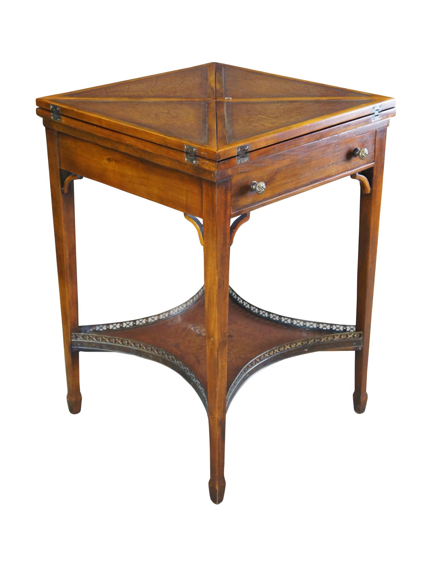 Vintage Theodore Alexander handkerchief card / game / accent / side table. Made of mahognay and tooled leather featuring a tiered design with fold out top over lower gallery supported by tapered legs.