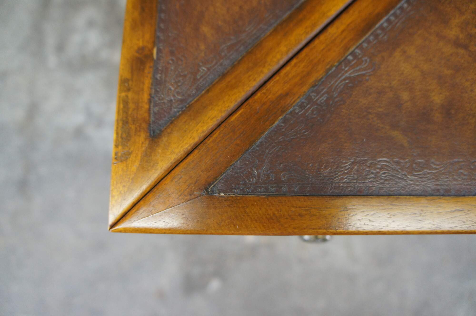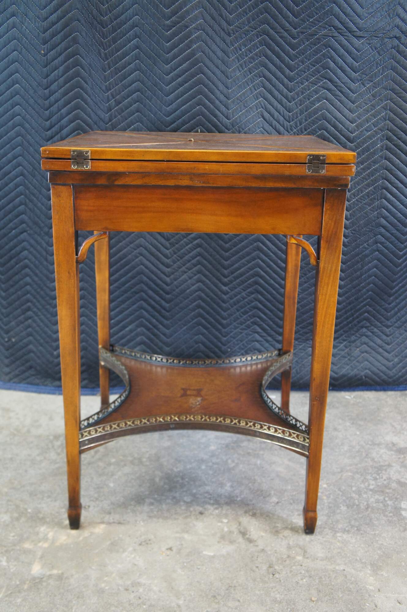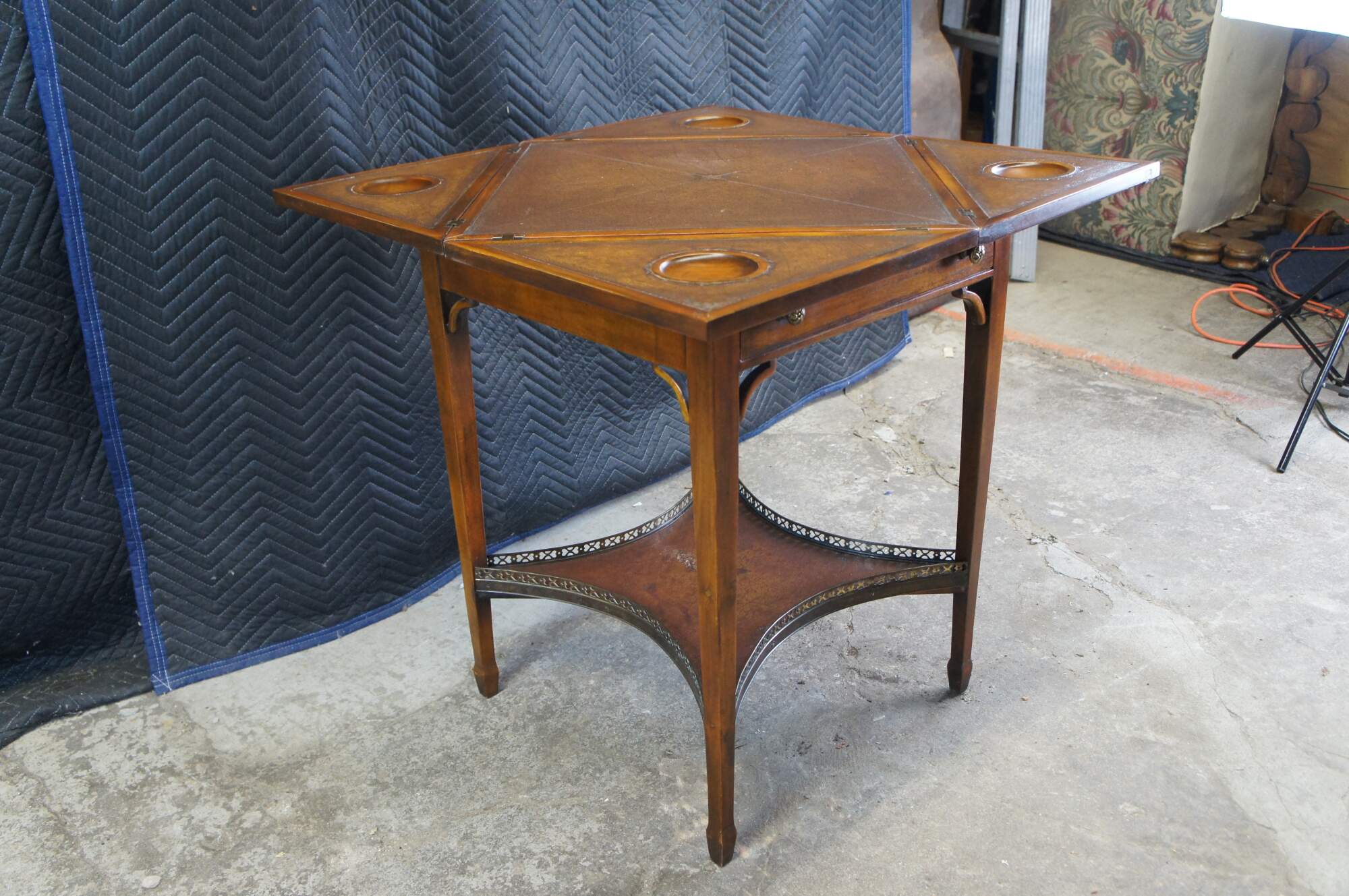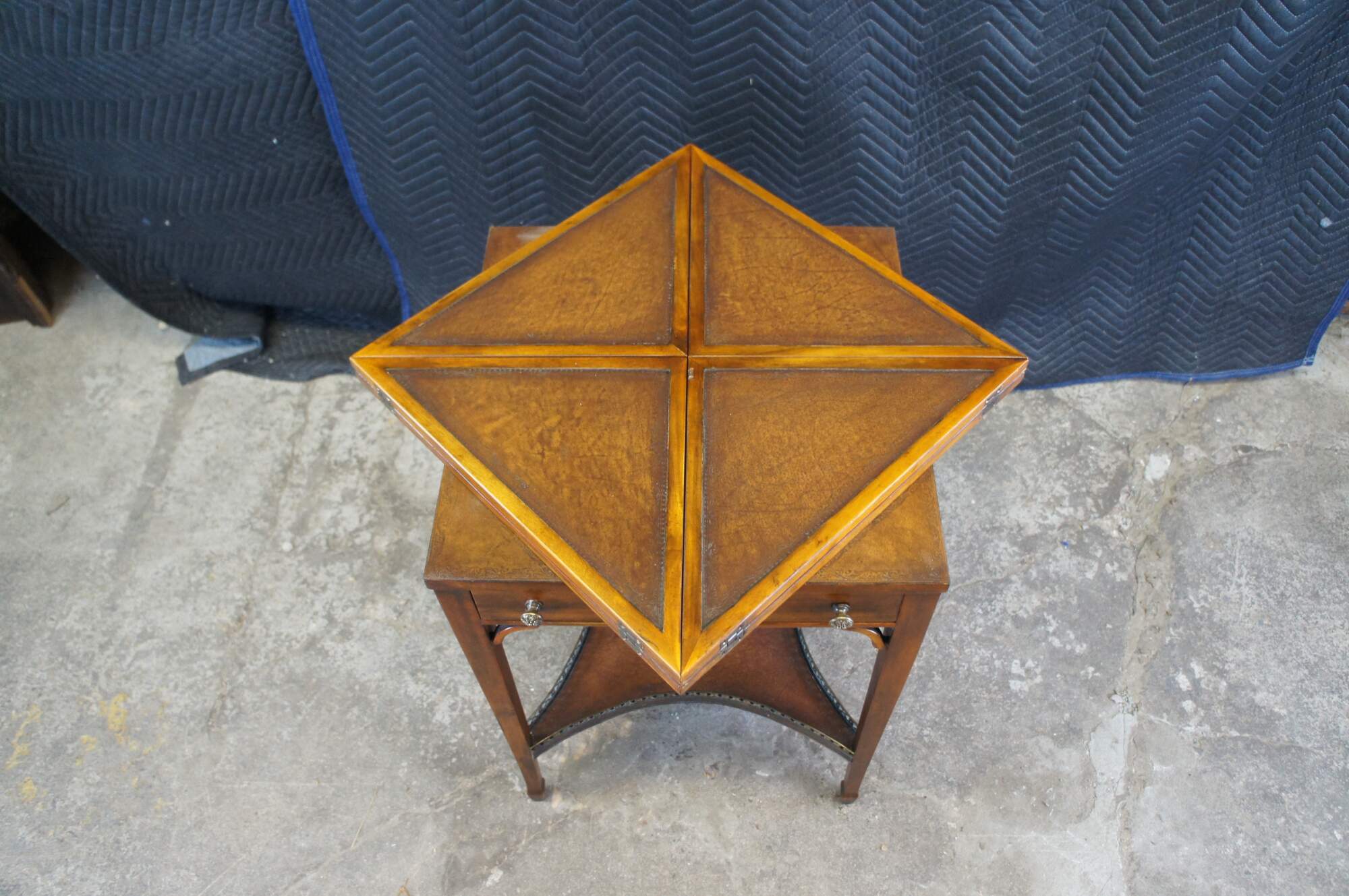 Vintage Theodore Alexander handkerchief card / game / accent / side table. Made of mahognay and tooled leather featuring a tiered design with fold out top over lower gallery supported by tapered legs.