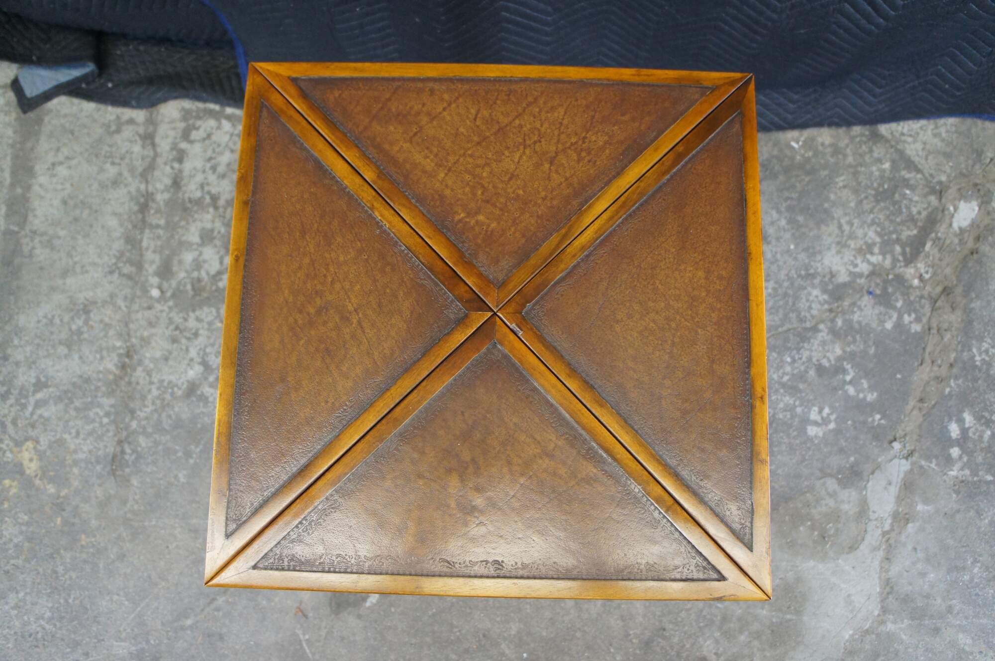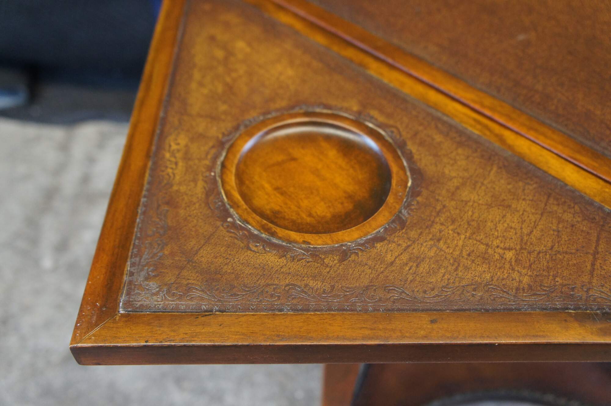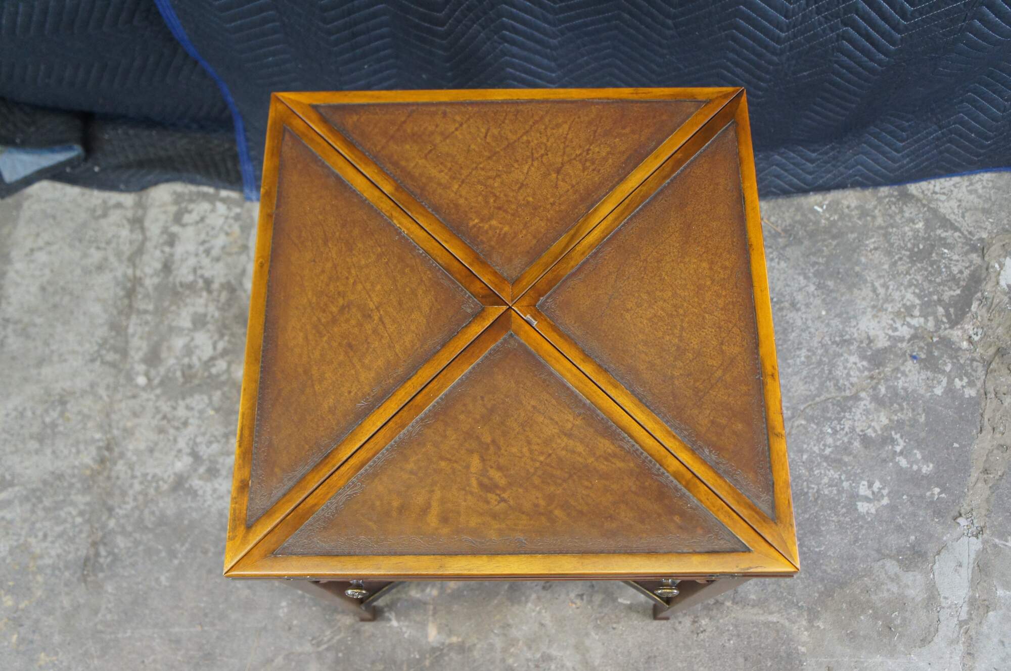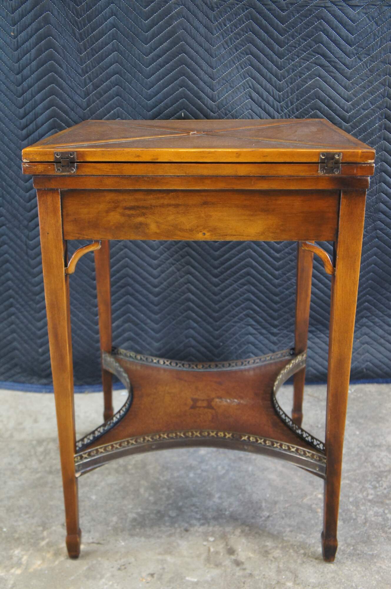 Vintage Theodore Alexander handkerchief card / game / accent / side table. Made of mahognay and tooled leather featuring a tiered design with fold out top over lower gallery supported by tapered legs.