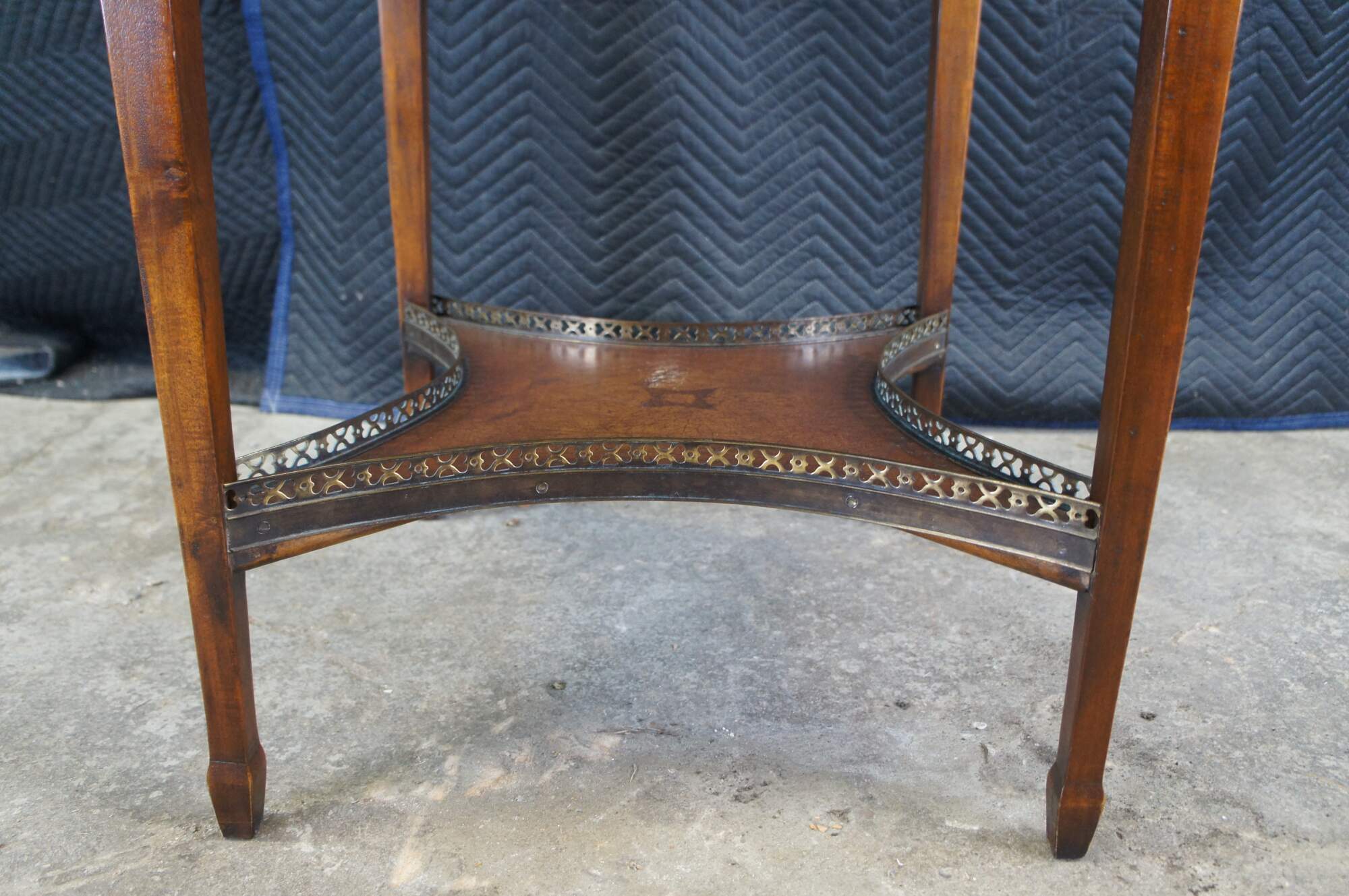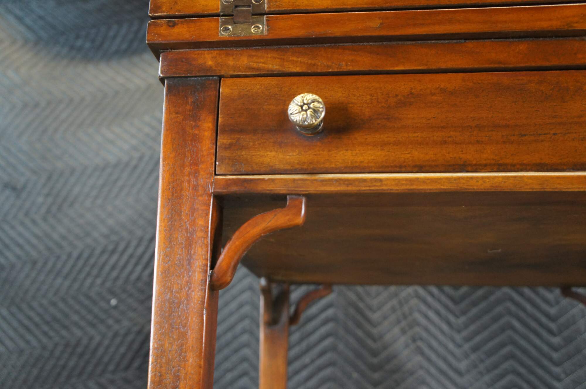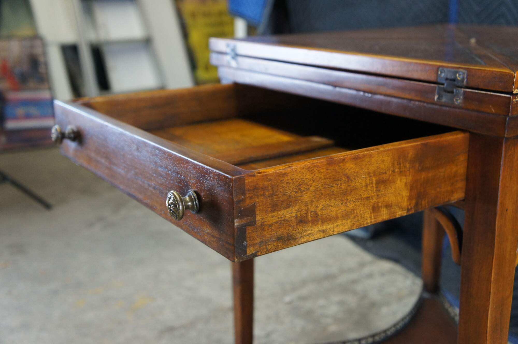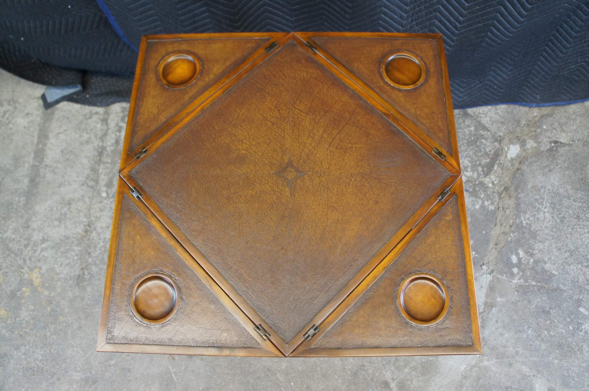 Vintage Theodore Alexander handkerchief card / game / accent / side table. Made of mahognay and tooled leather featuring a tiered design with fold out top over lower gallery supported by tapered legs.