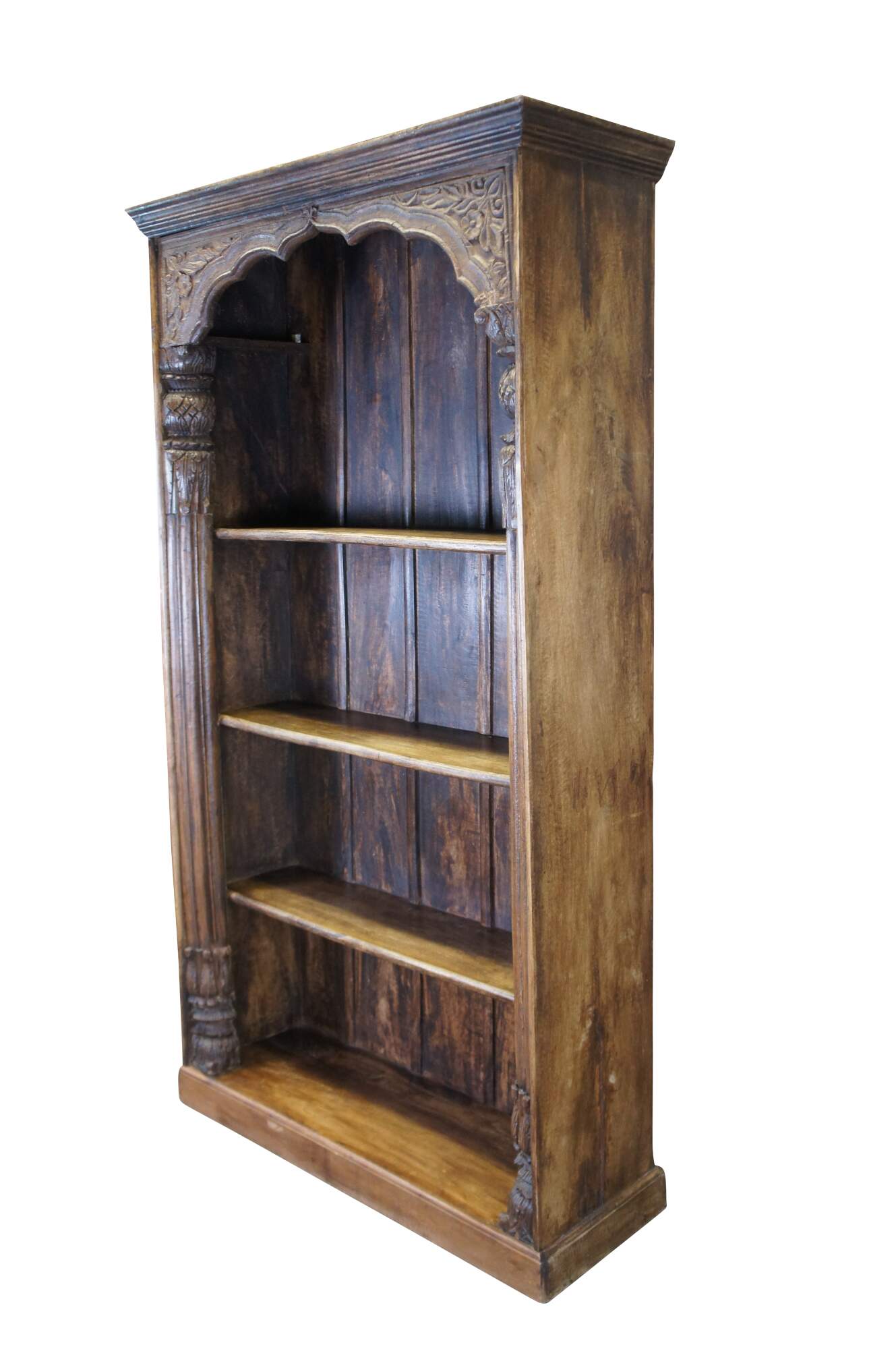 Antique Indonesian / Indian reclaimed library / farmhouse bookshelf or bookcase. Made of teak featuring a doorway or archway design with corinthian columns and floral acanthus carvings.