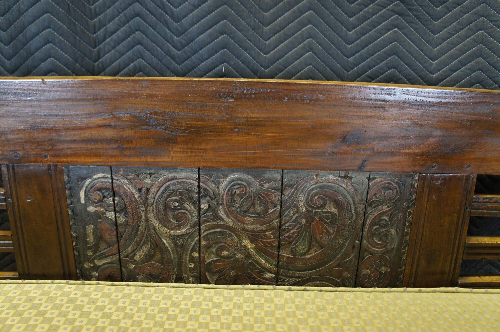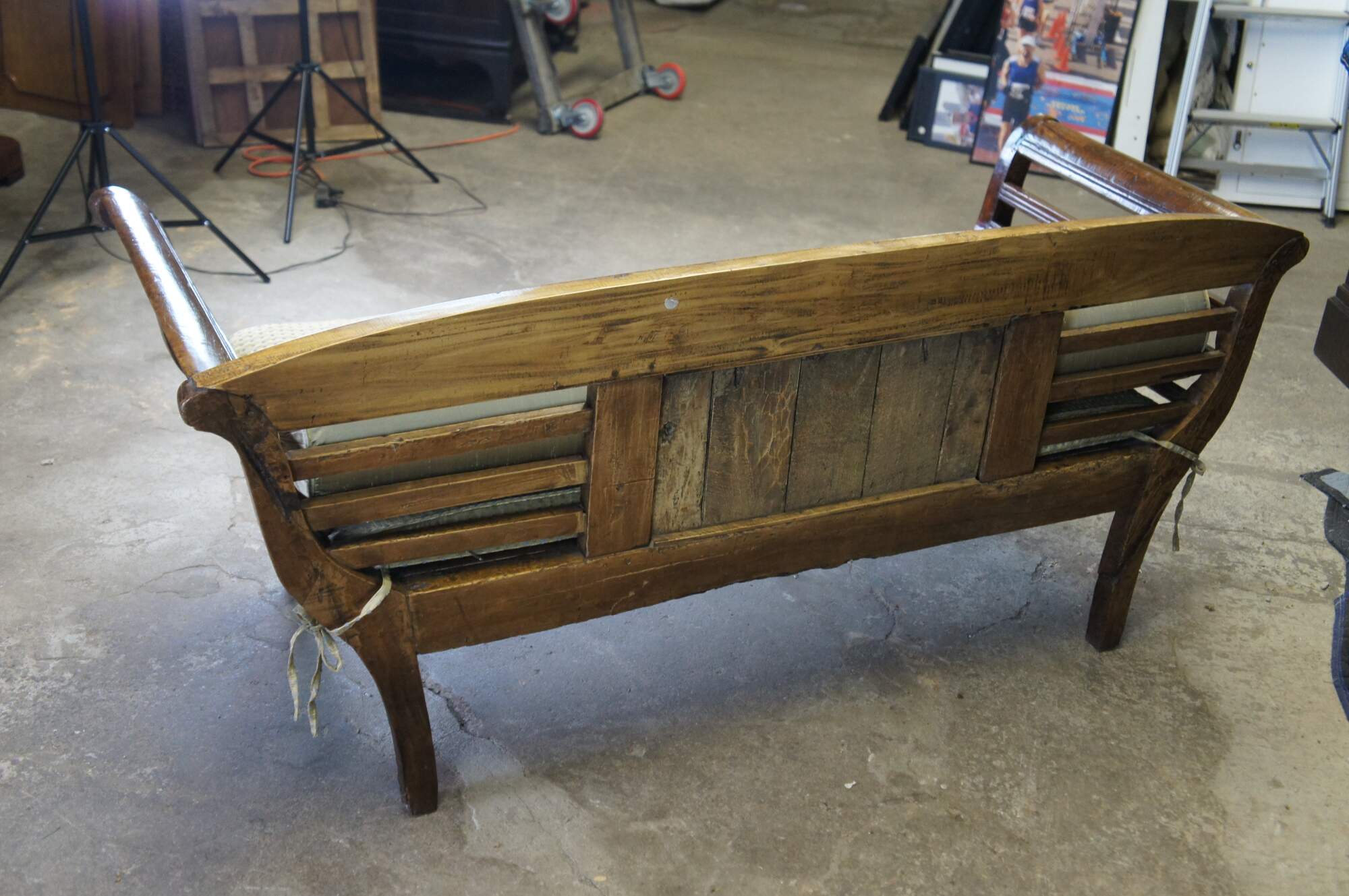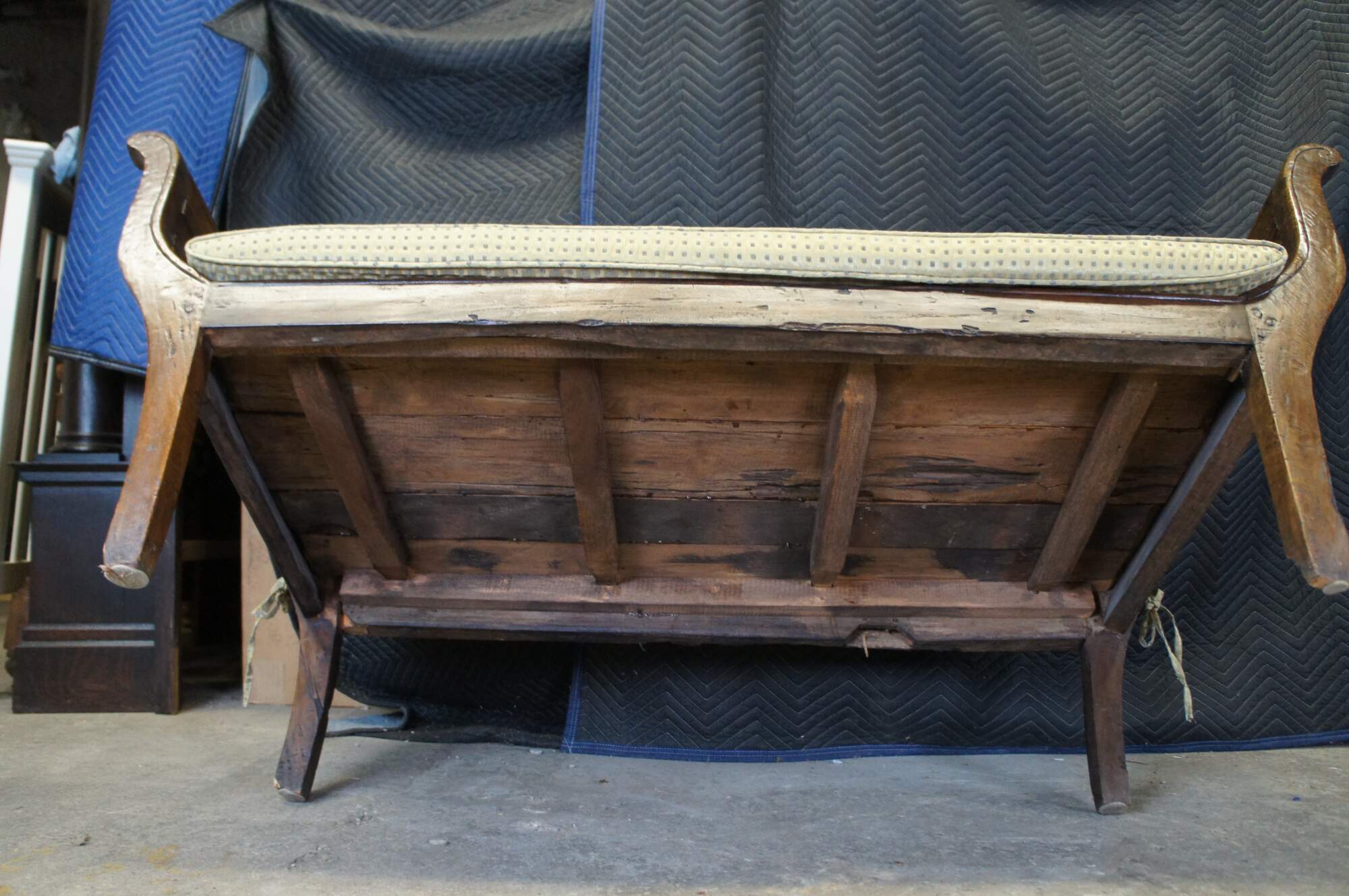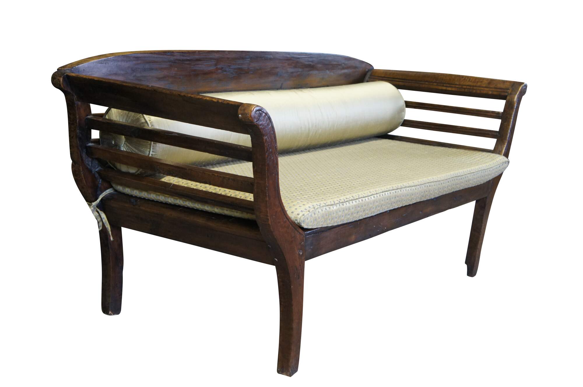Antique primitive Indonesian / Indian country / farmhouse / colonial bench seat or settee. Made of teak featuring ladderback design with carved floral acanthus paneled back and Jim Thompson silk upholstered cushions.