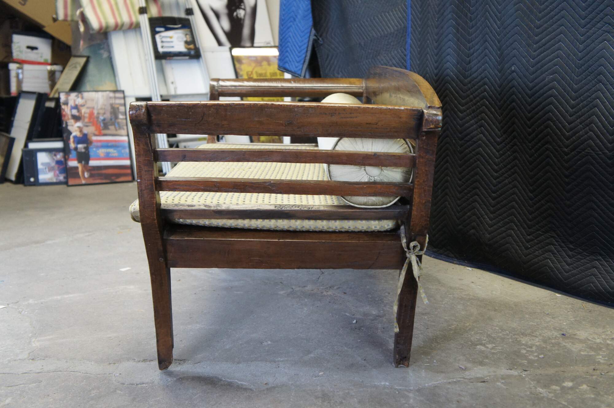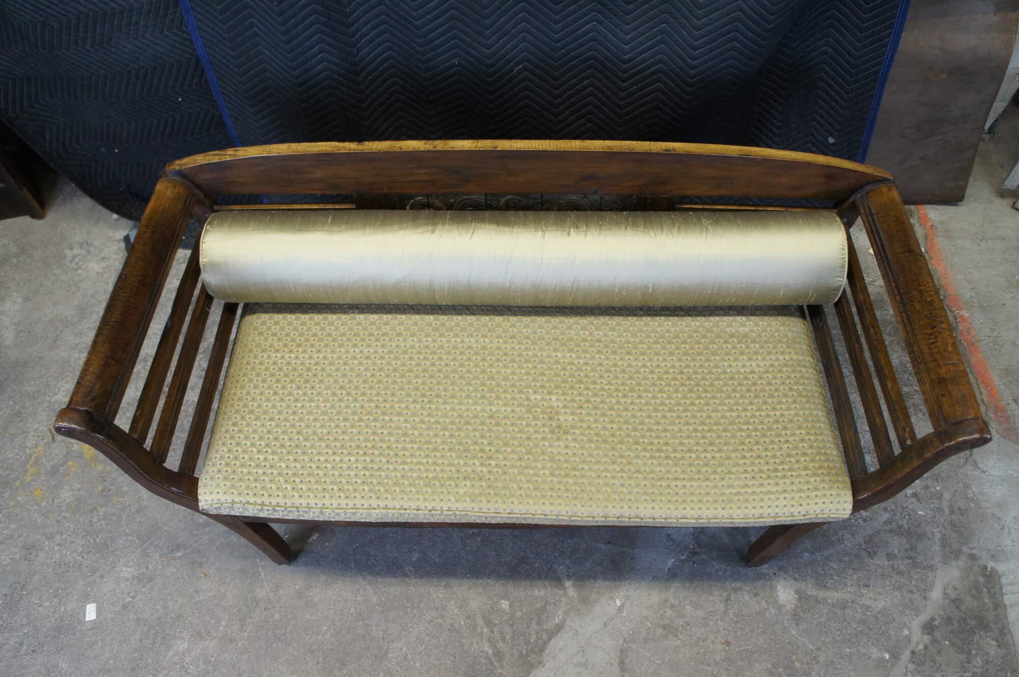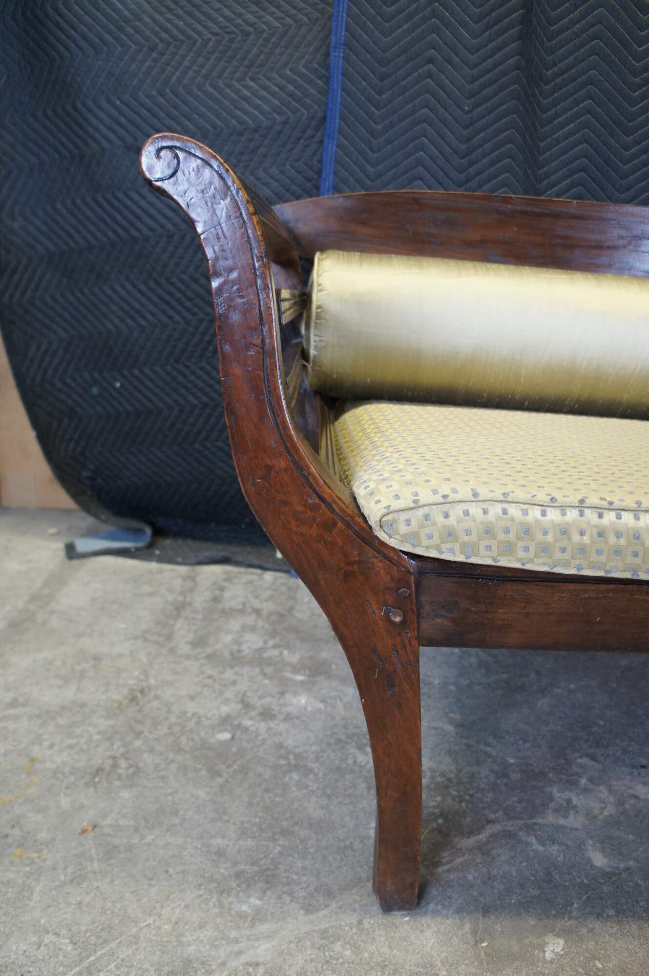 Antique primitive Indonesian / Indian country / farmhouse / colonial bench seat or settee. Made of teak featuring ladderback design with carved floral acanthus paneled back and Jim Thompson silk upholstered cushions.