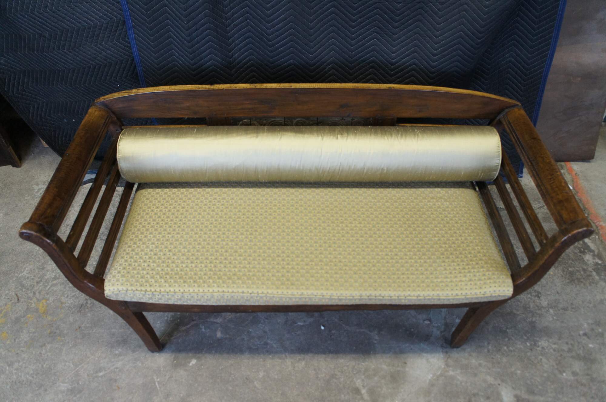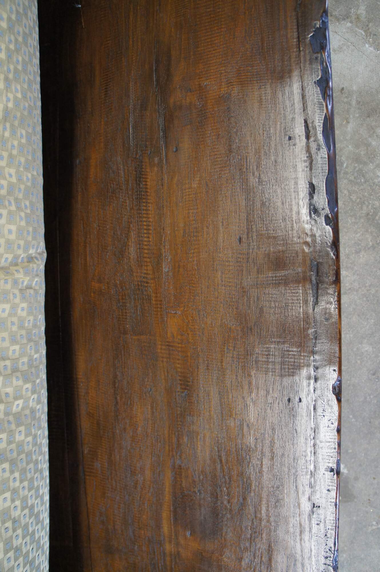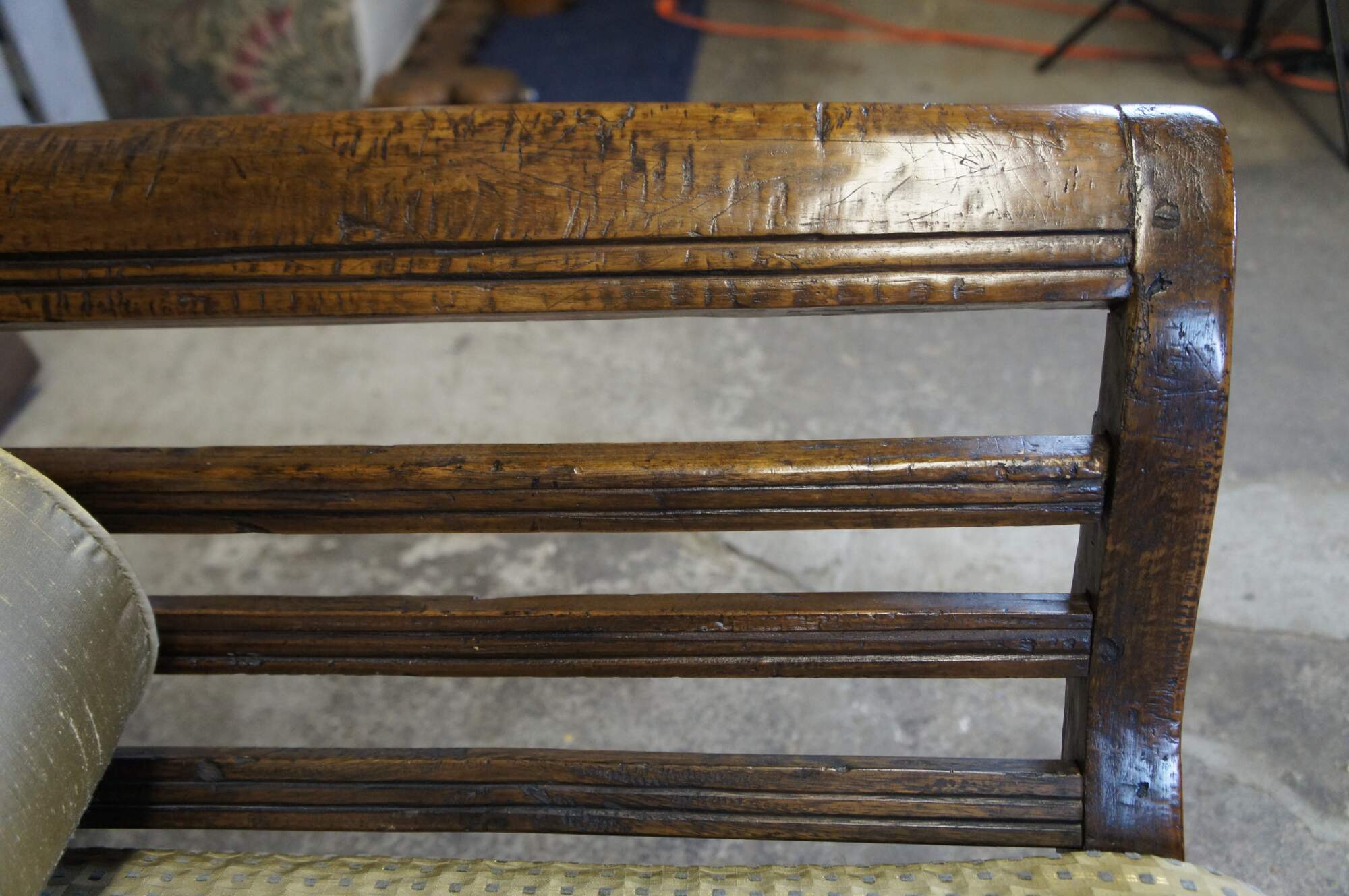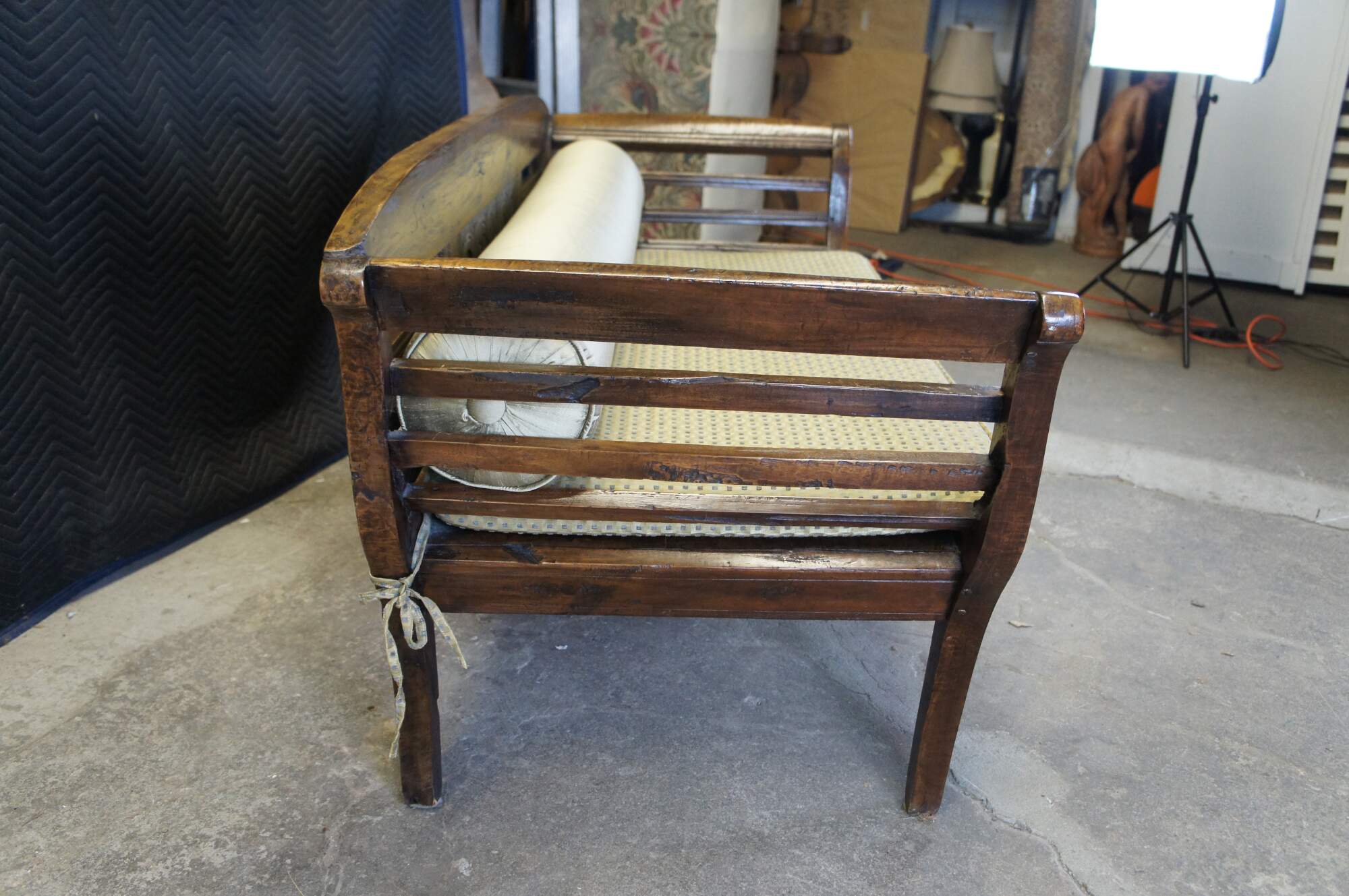 Antique primitive Indonesian / Indian country / farmhouse / colonial bench seat or settee. Made of teak featuring ladderback design with carved floral acanthus paneled back and Jim Thompson silk upholstered cushions.
