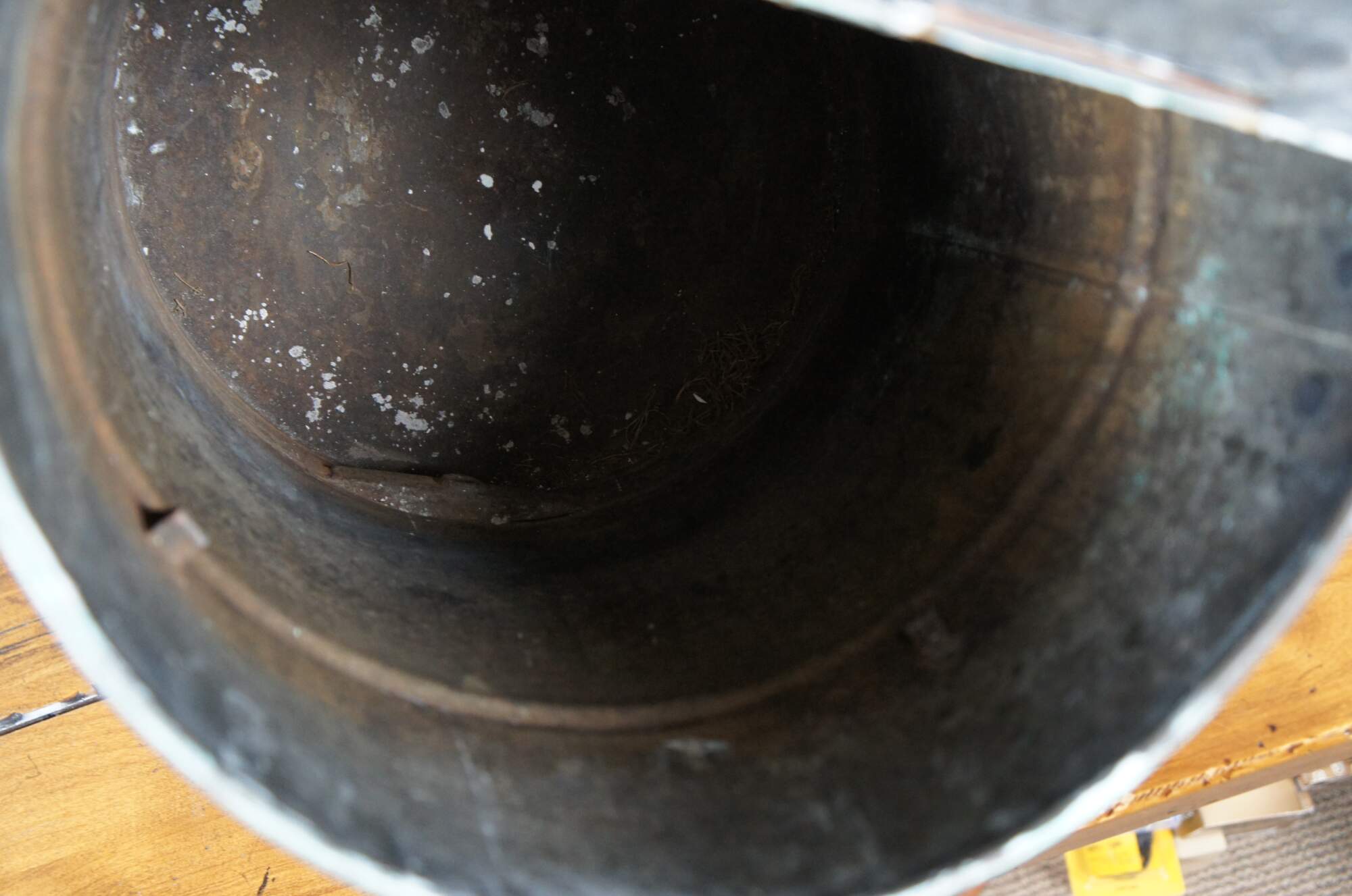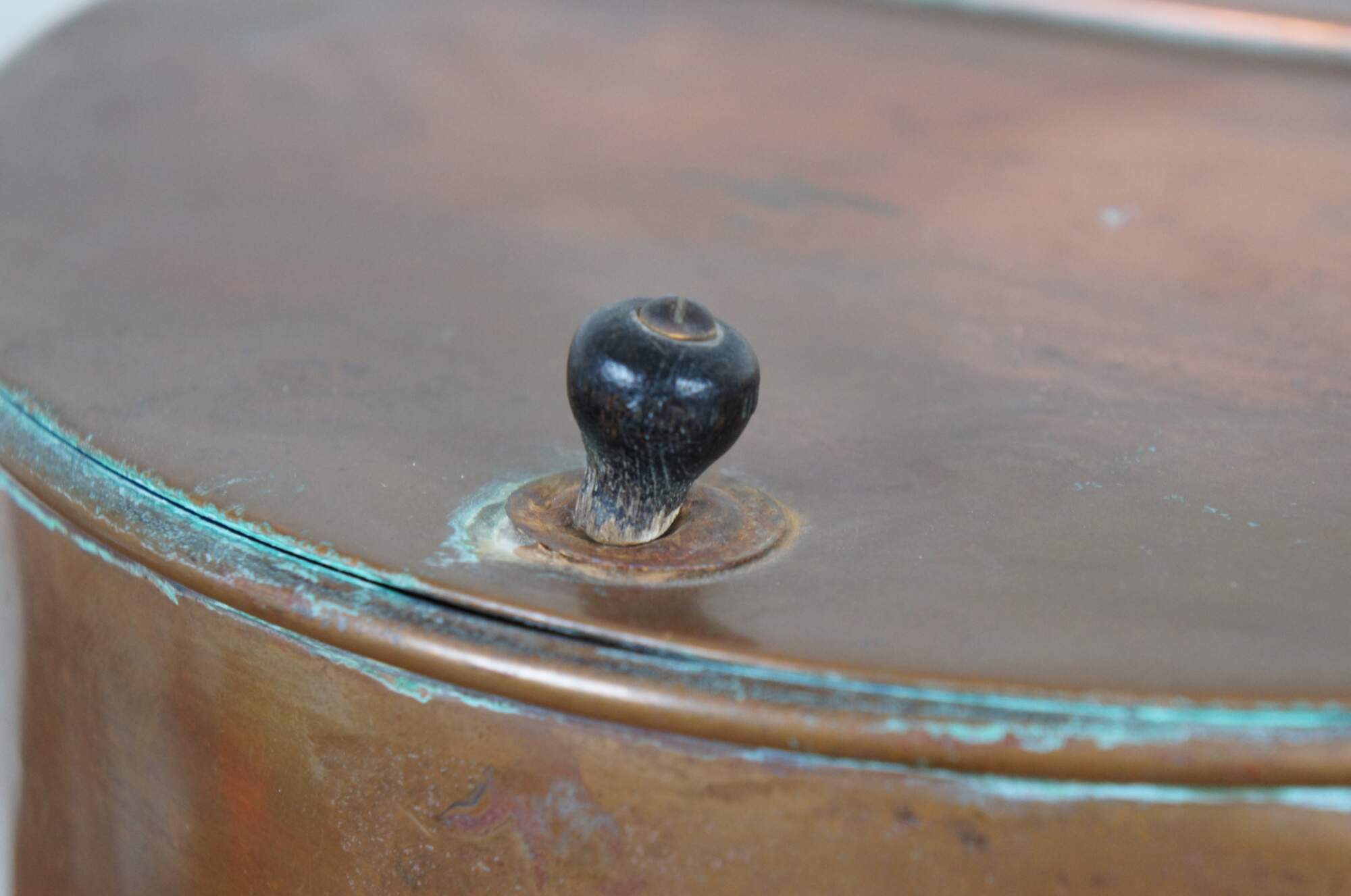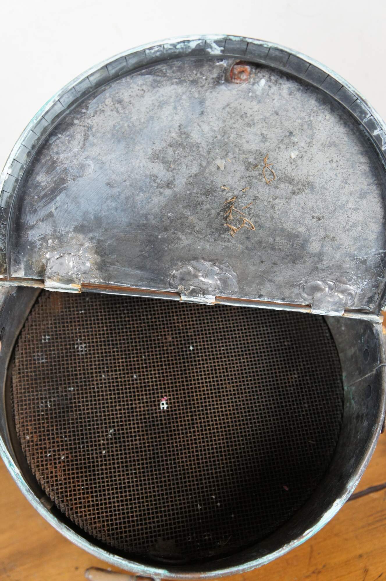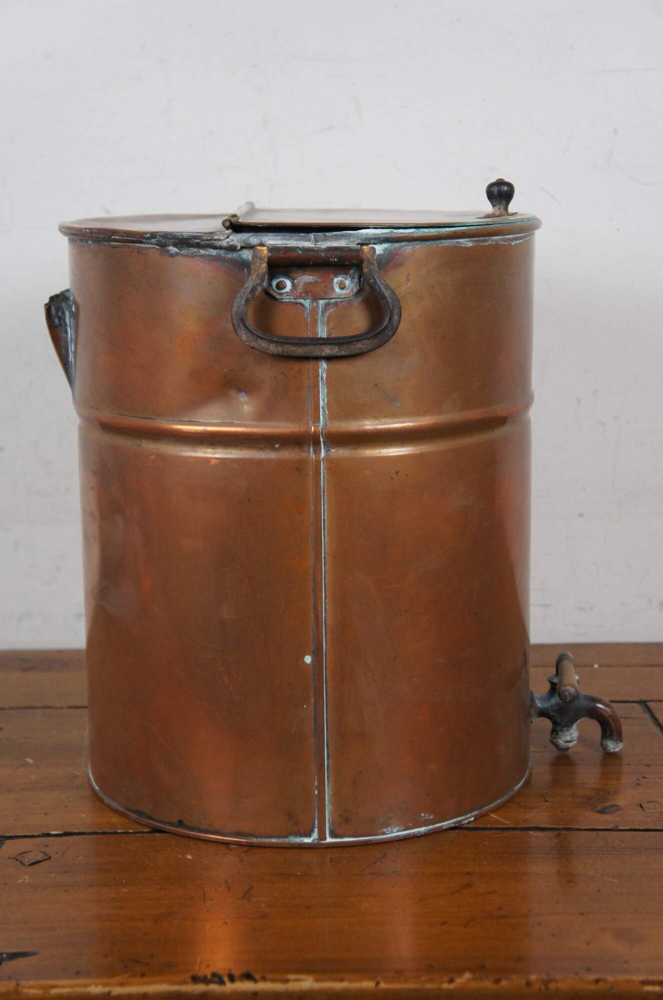 Antique primitive copper farmhouse tea coffee samovar urn / pot / water cooler / boiler / beverage dispenser. Cylindrical copper body, wooden handle on the spigot and lid; rotating bail handles; includes mesh screen that sits just inside top.
