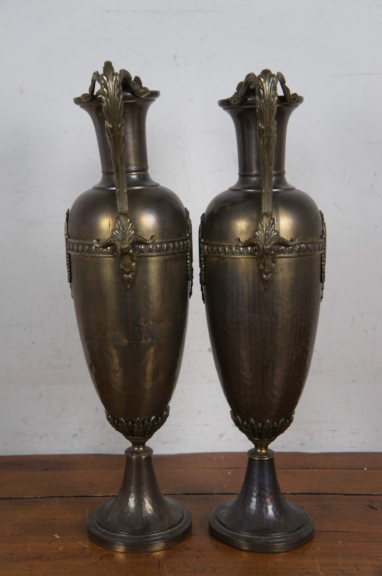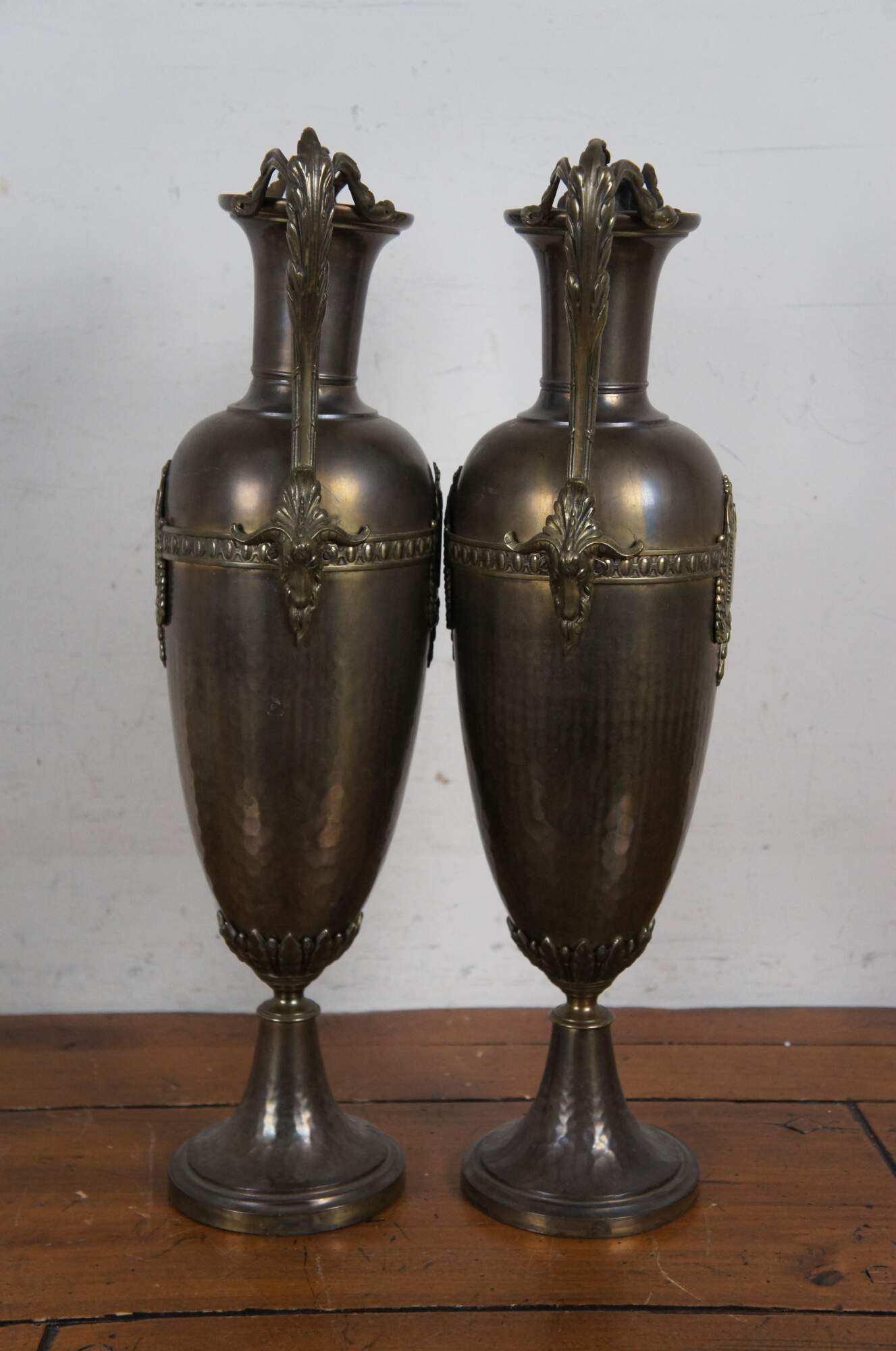 Pair of antique hammered brass mantel vases / trophy urns. Made of brass featuring Neoclassical and Louis XVI styling with round pedestal bases, double scrolled foliate handles, acanthus leaves, framed shields, and rams heads.