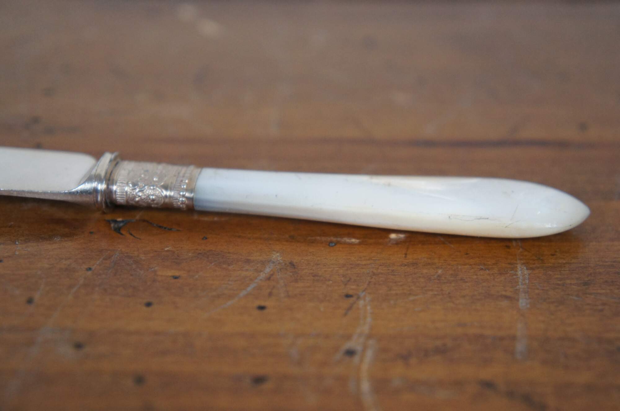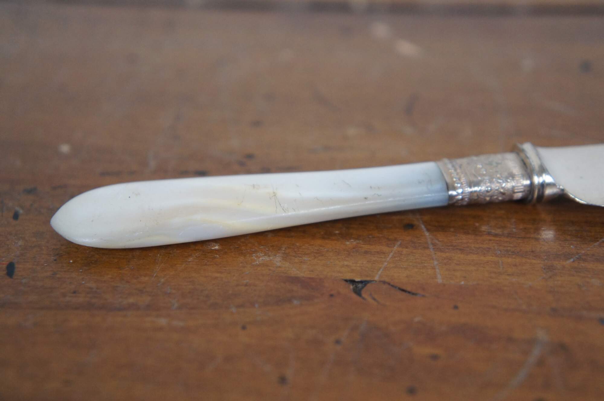 Set of 12 mother of pearl handled table knives by Meriden Cutlery Co. Blades marked with number 12. Beaded and floral repousse silver collars. Includes felt wrapper (not original to knives).