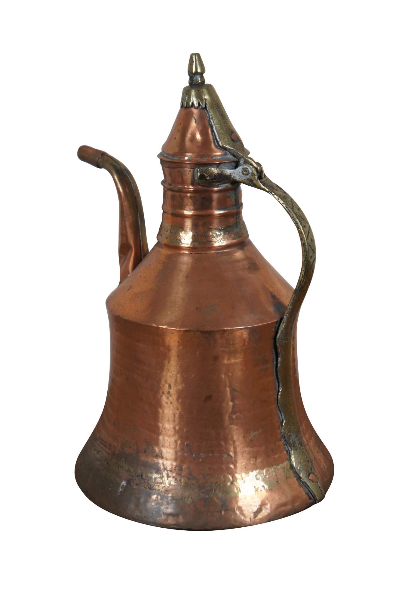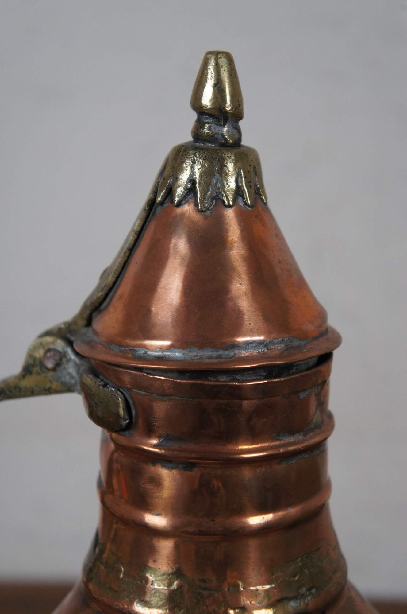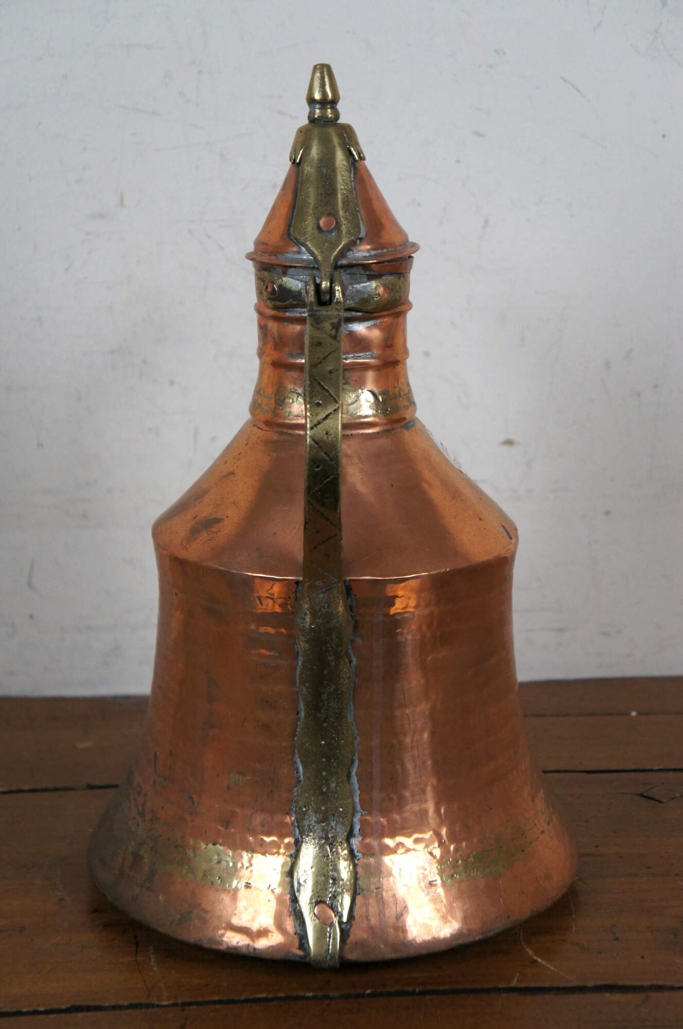Early 20th century primitive hammered copper and brass Turkish style farmhouse coffee pot / kettle / lidded jug / pitcher / samovar. Round cinched waist body with brass bands, gooseneck spout, fixed brass handle and finial / cap on lid.