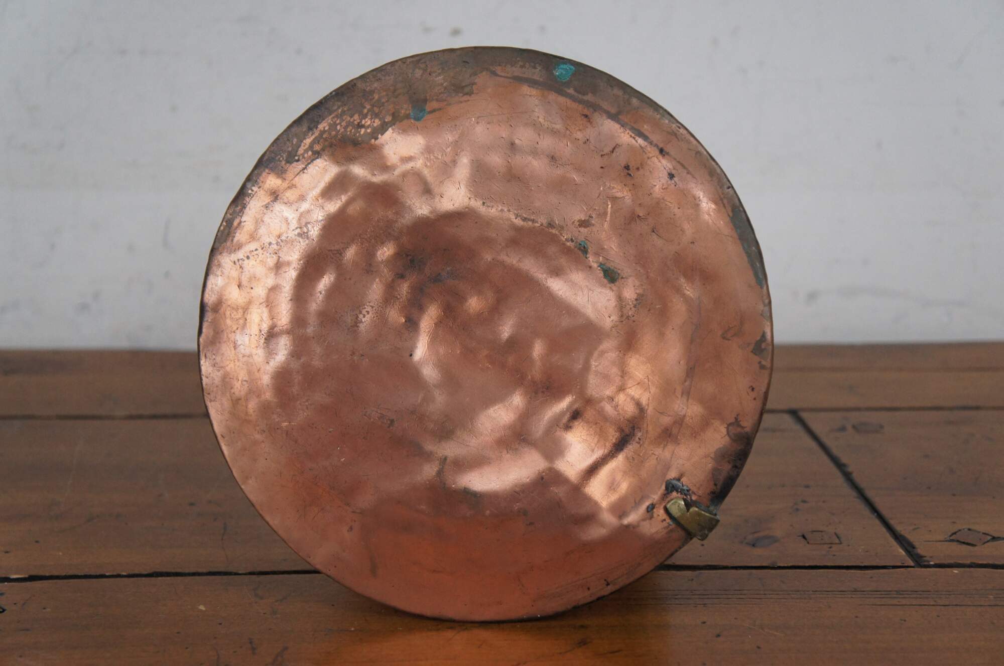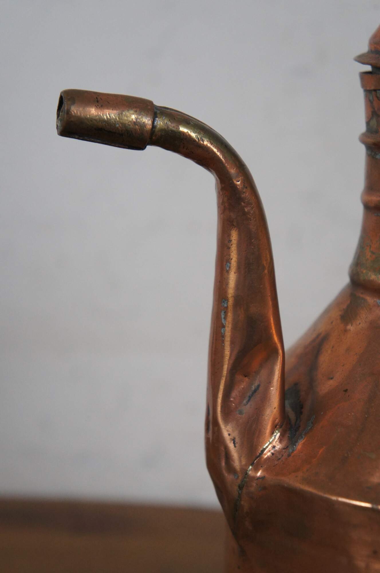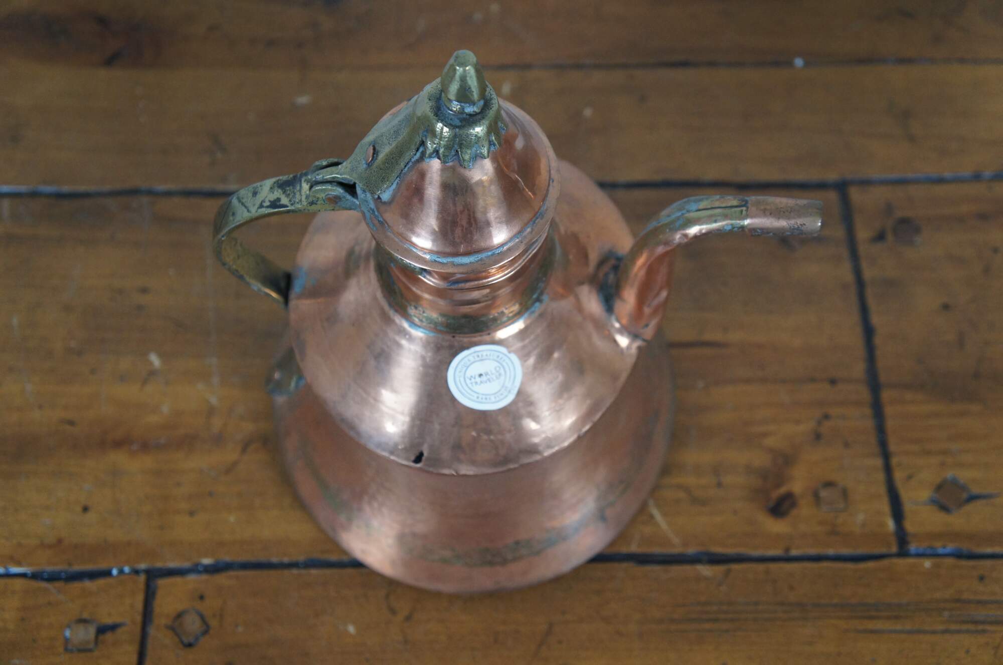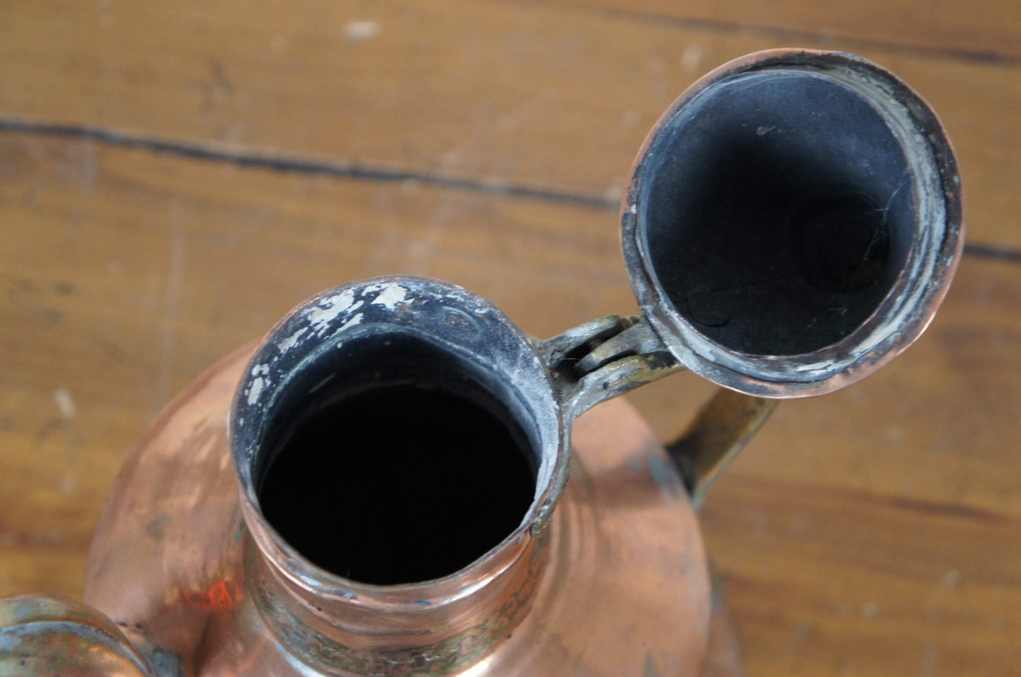 Early 20th century primitive hammered copper and brass Turkish style farmhouse coffee pot / kettle / lidded jug / pitcher / samovar. Round cinched waist body with brass bands, gooseneck spout, fixed brass handle and finial / cap on lid.