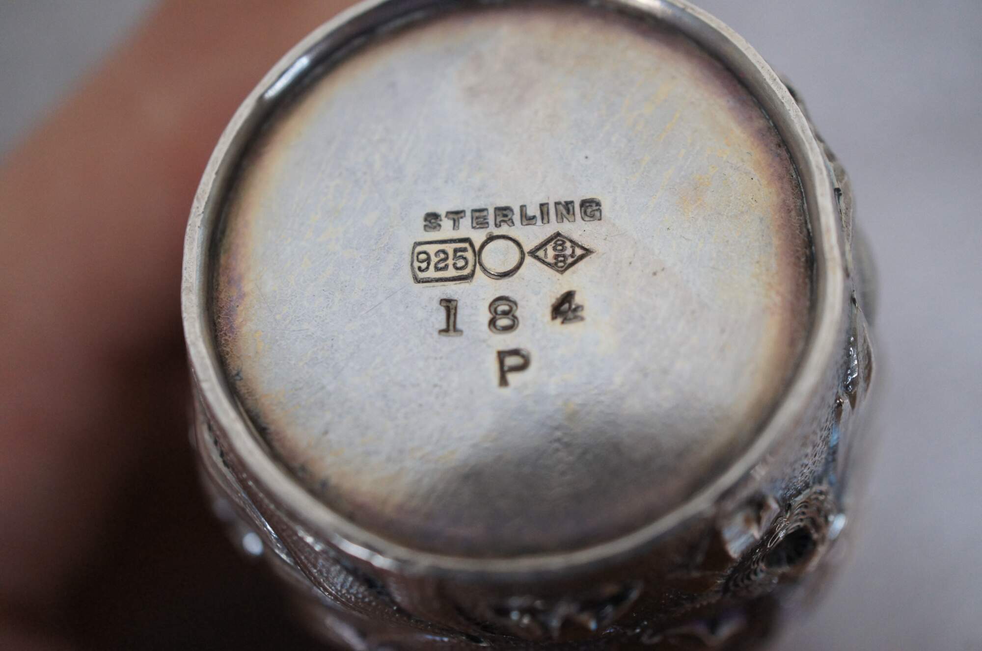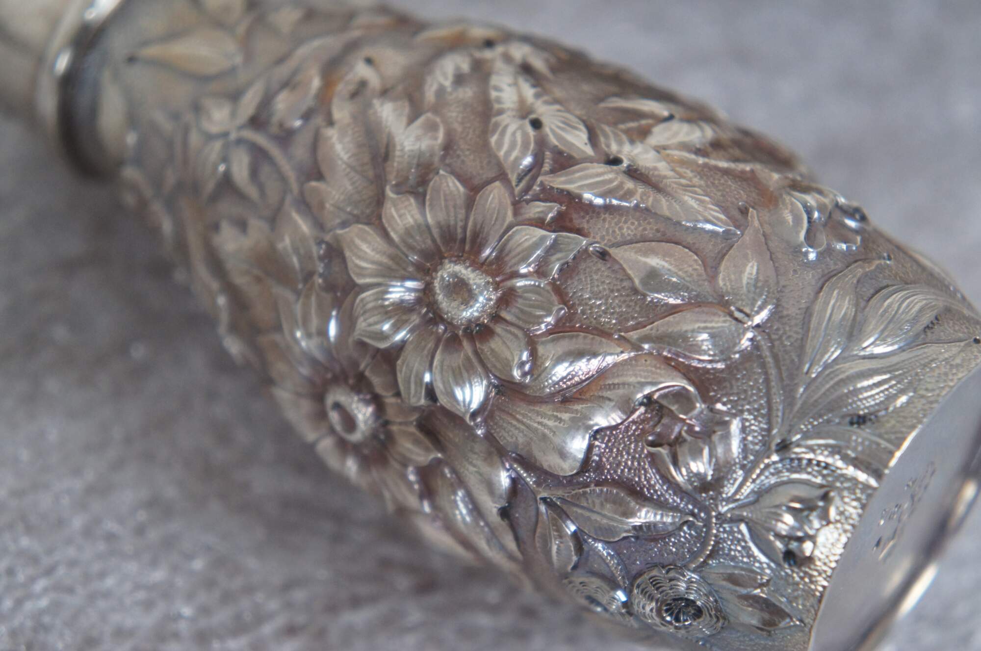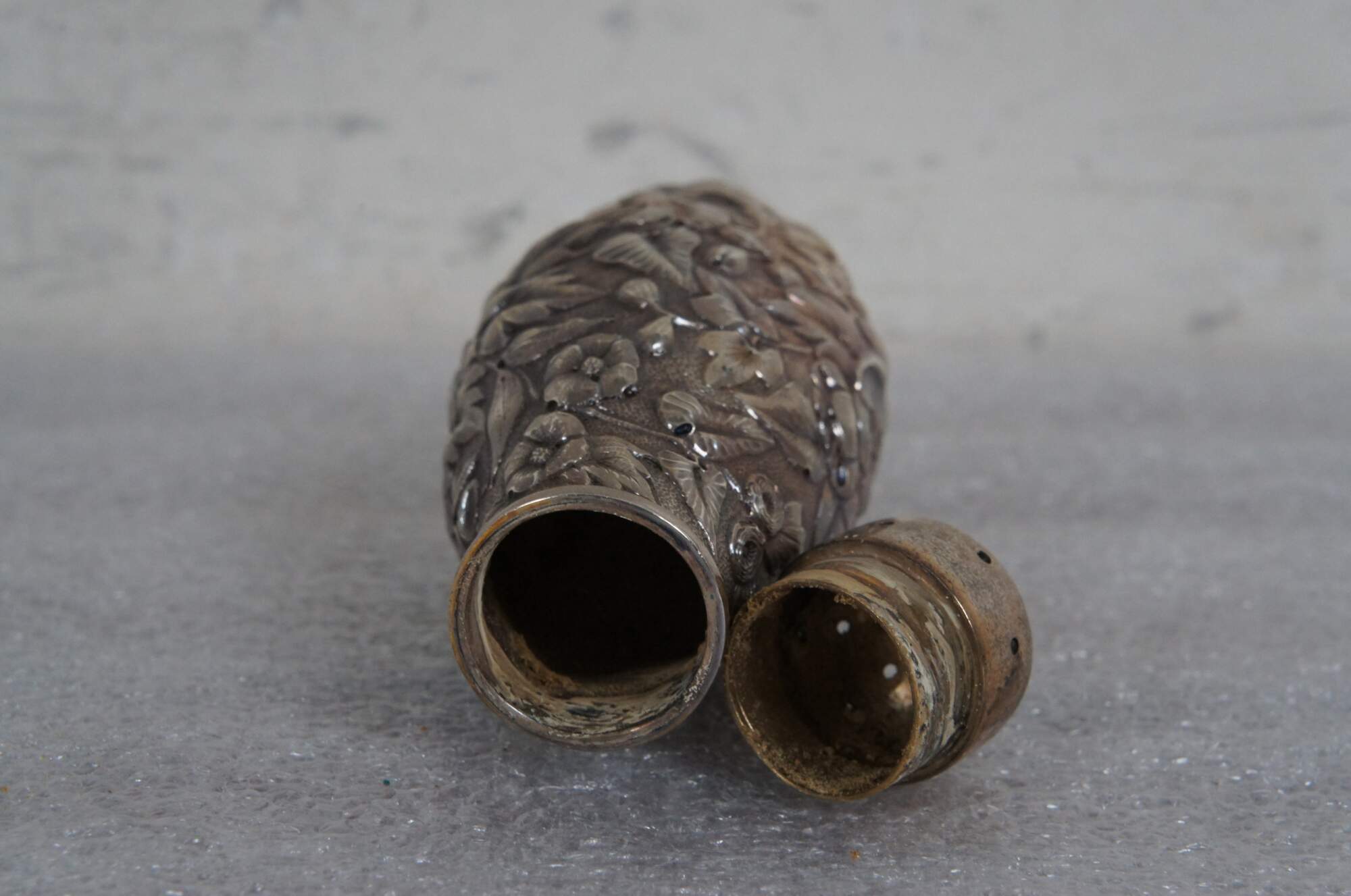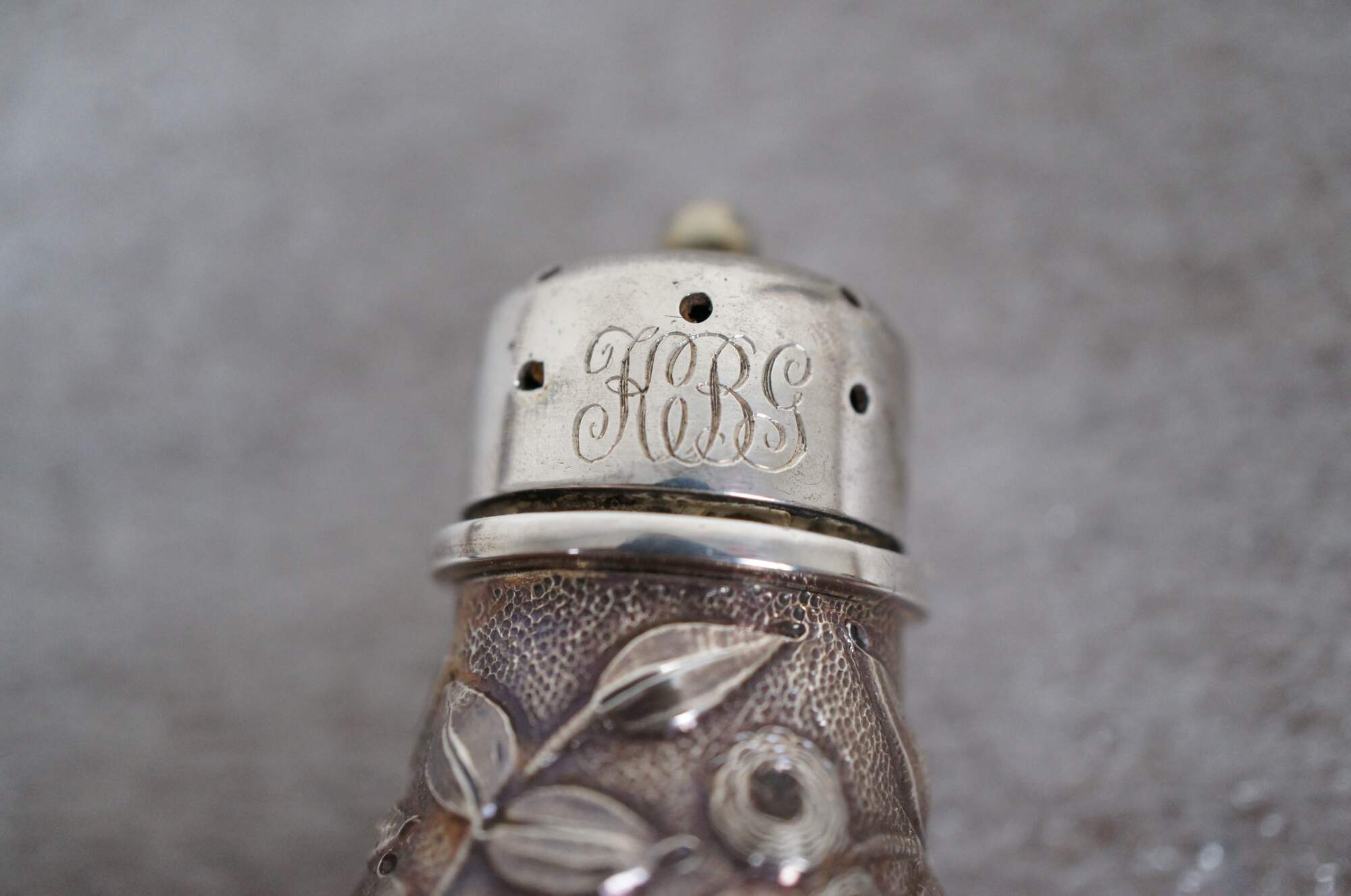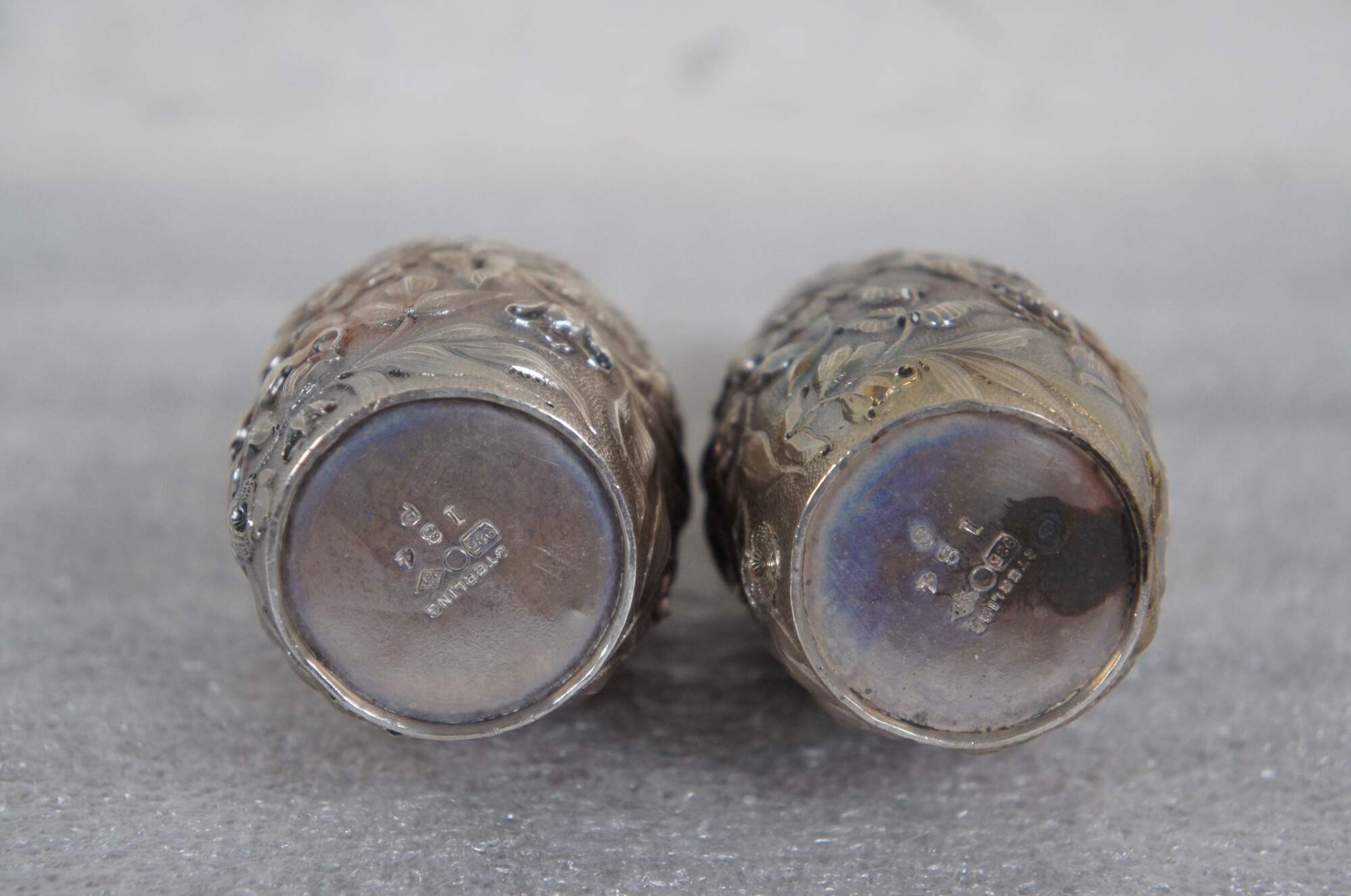 Antique 1881 sterling silver salt and pepper shakers by Dominick & Haff. Item / pattern number 184 P. Features a detailed repoussed pattern of leaves and flowers in low relief. Plain caps with ball finial. Monogram KBG.