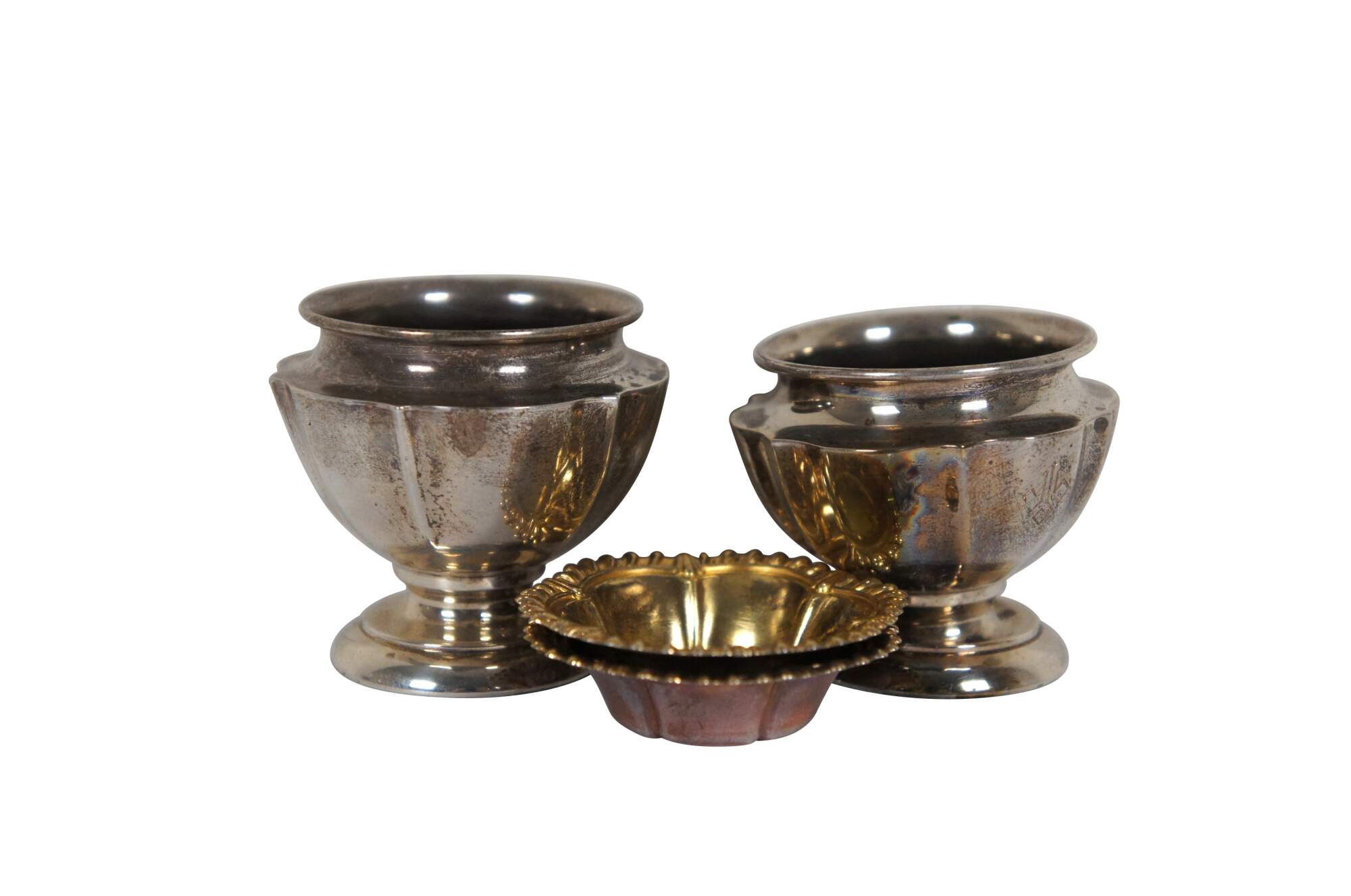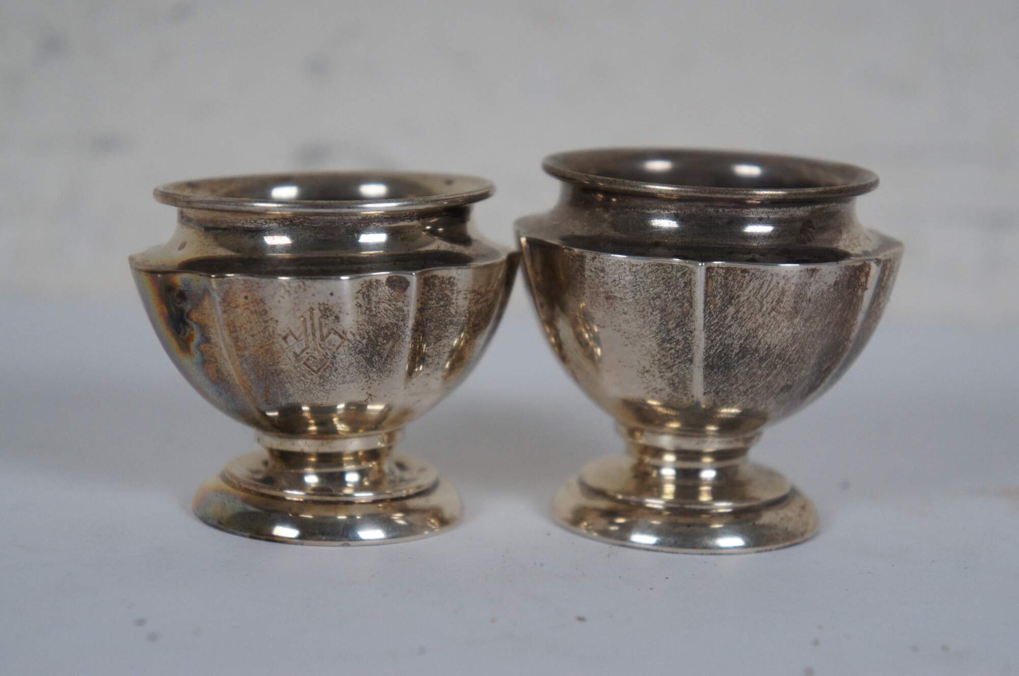 Lot of 10 asssorted pieces of antique and vintage sterling silver salt cellars and papper shakers. Includes: four (two pairs) miniature number 18 salt and pepper shakers by Dunkirk Silversmiths, two number 2075 scalloped edge salt cellars by Gorham with monogram KBG, pair of glass lined / weighted salt and pepper shakers by Duchin, and two urn shaped number 33 salt cellars by William Nost.