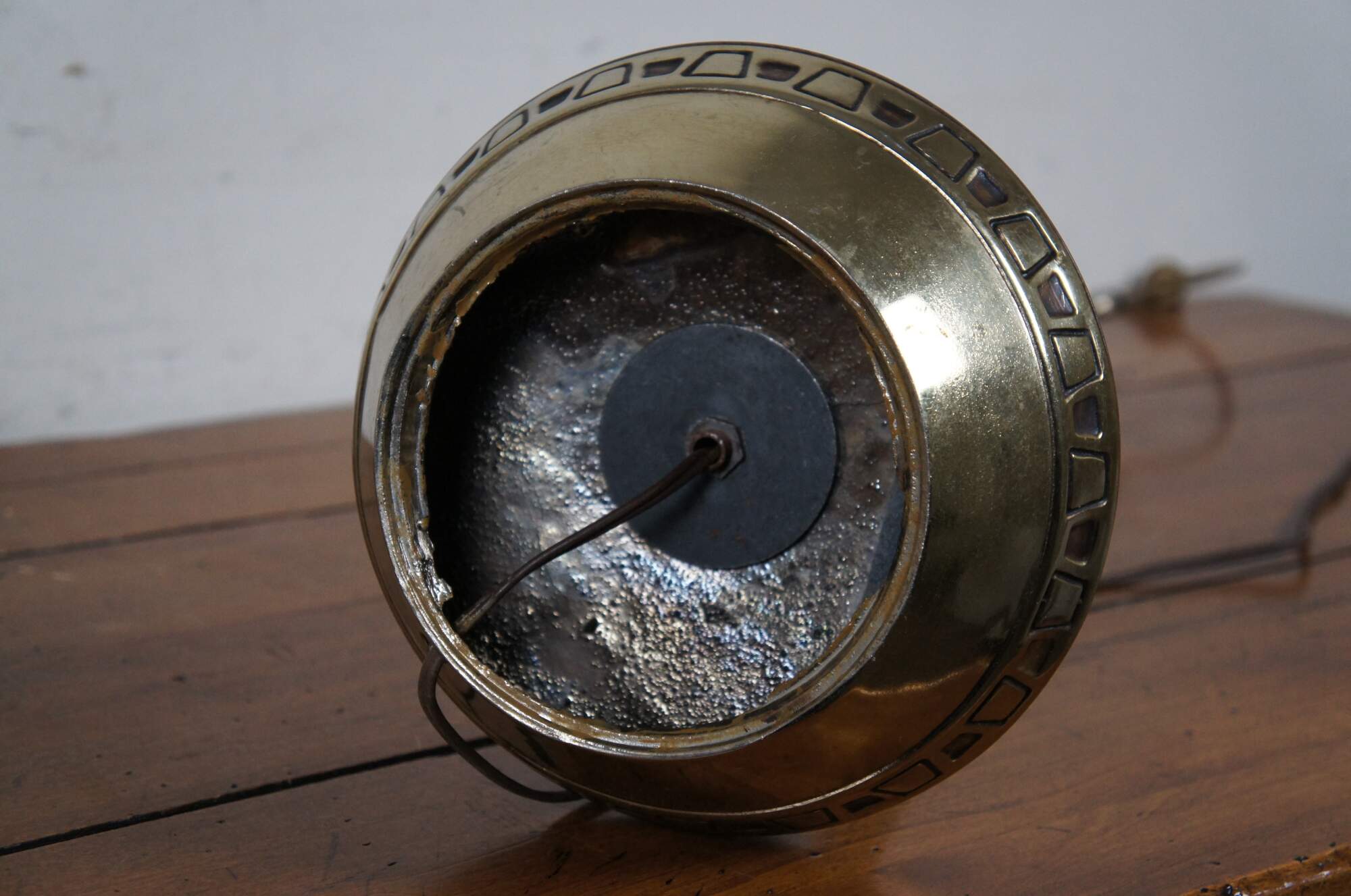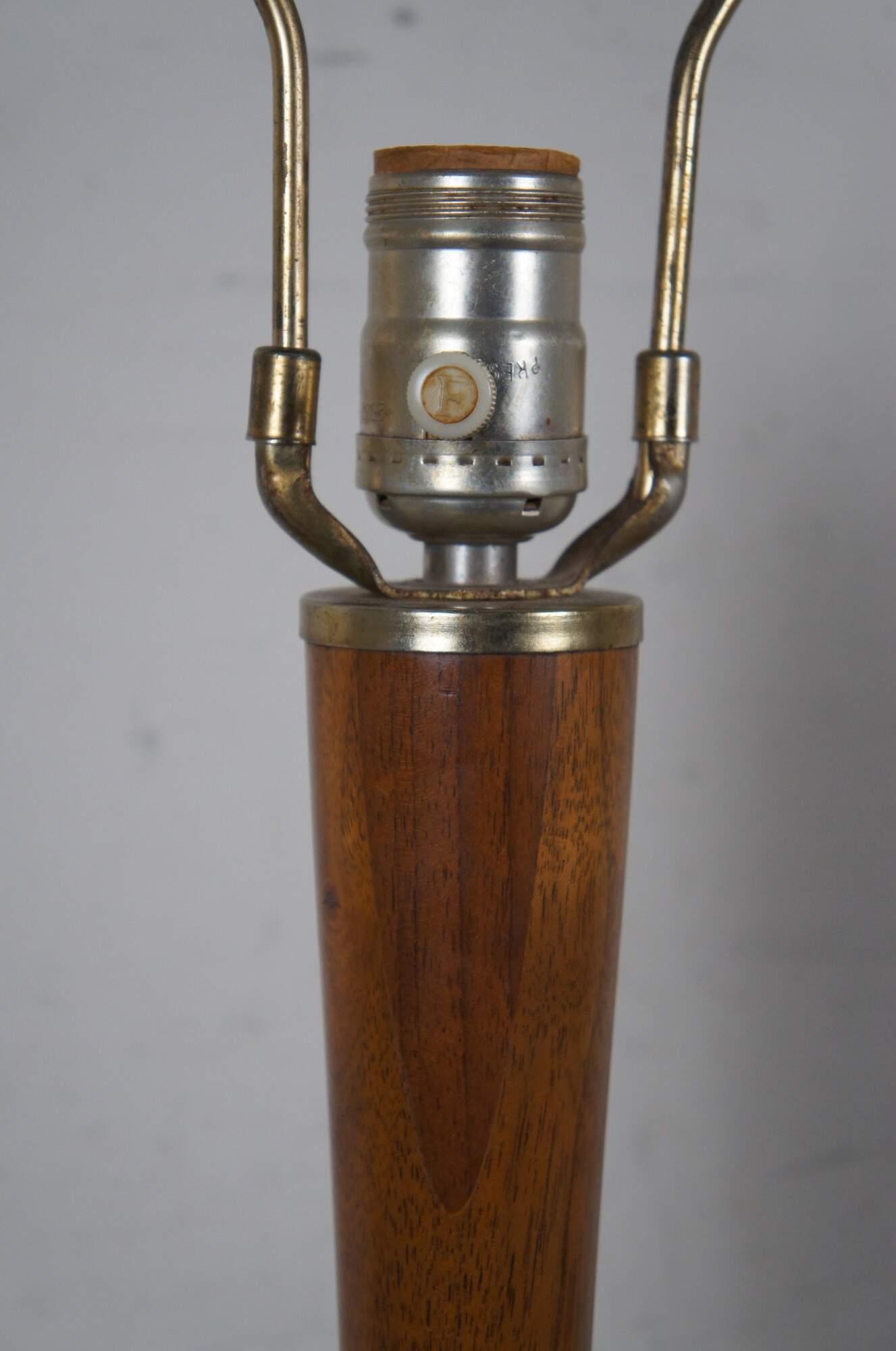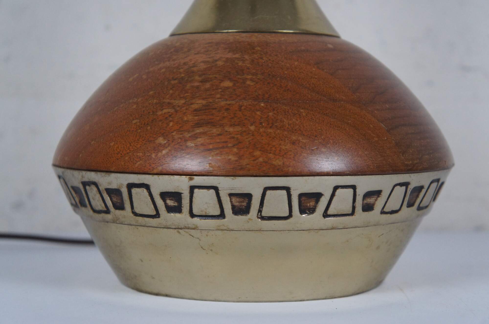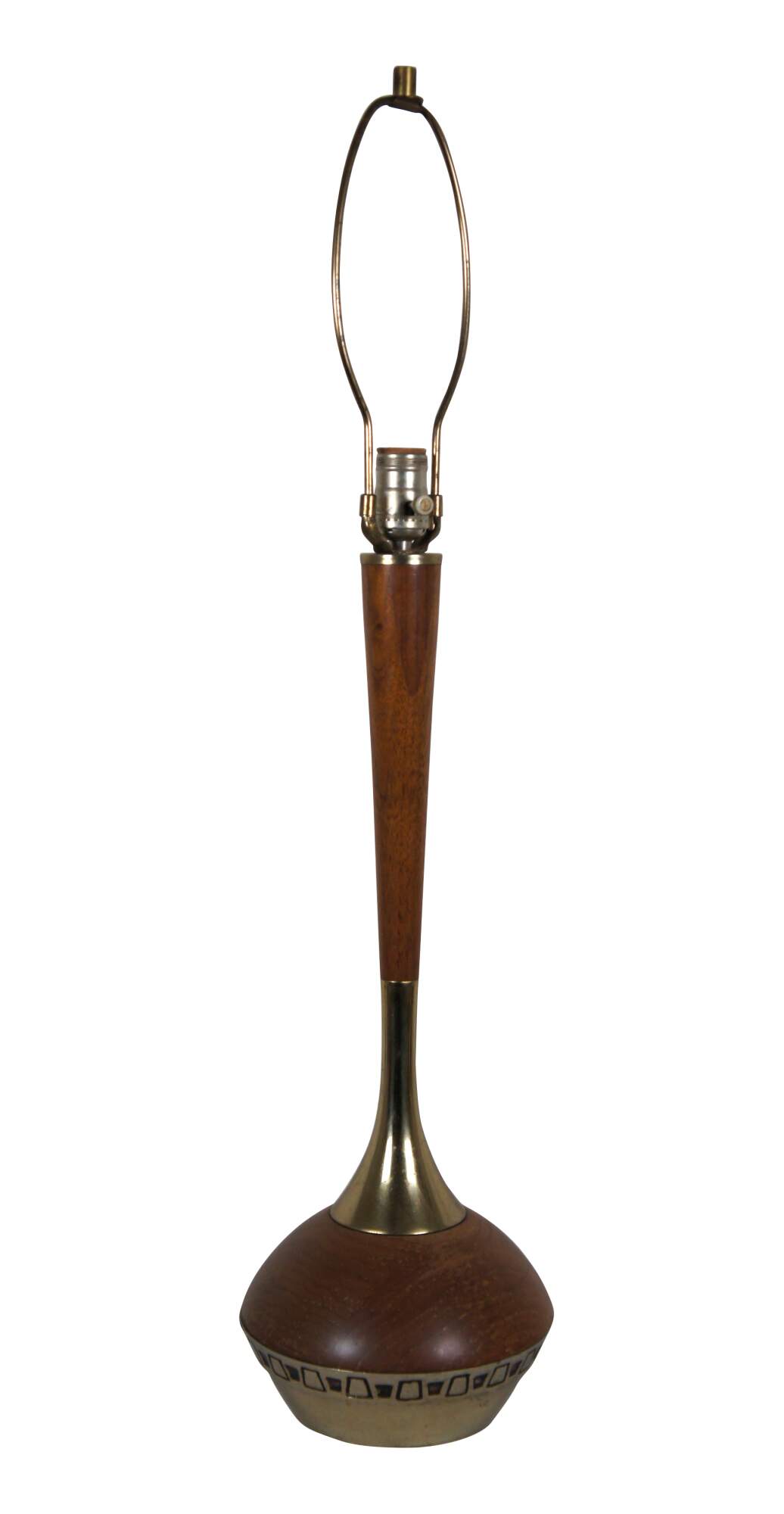 Circa 1960's pair of mid century Danish modern genie bottle style table lamps. Round half brass, half teak wood bases topped with a brass waist supporting a tapered cylindrical neck. Brass lower half of base sports a simple, primitive geometric design. Includes harp and cylindrical finial. Attributed to Tony Paul for the Laurel Lamp Company.