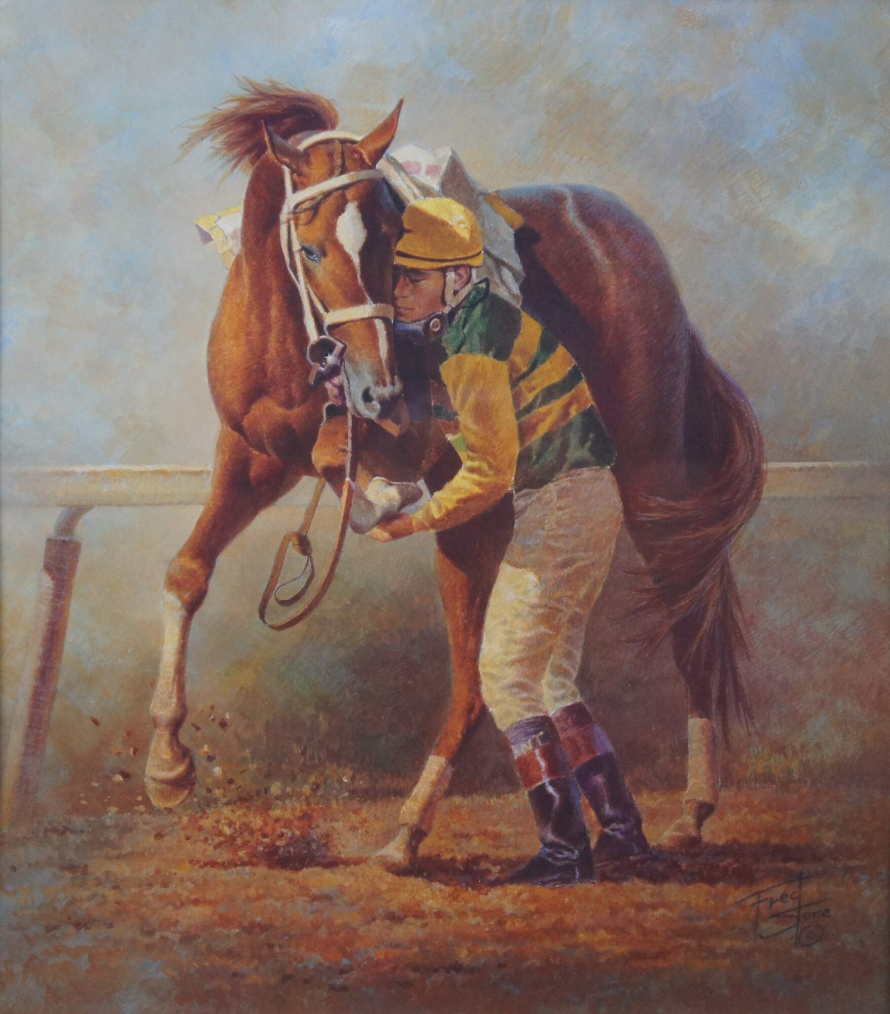 "Fred Stone (1930-2018) was born April 13, 1930 in St. Louis, Missouri, the second son of Sam and Dorothy Stone. When Fred was three years old his family moved to the Fairfax district in Los Angeles, where Fred grew up loving both art and baseball. Attending Art Center College in Los Angeles and doing stints at Choinard and Otis, Fred was well on his way to a career as a commercial artist. Landing a job at the Advertising Agency Stevens-Gross on Michigan Avenue in Chicago, Fred began honing his ability to tell stories through art working on illustrations for various clients. Grueling deadlines and a "Mad Men" lifestyle just didn't fit with Fred's style, so he and his wife, Norma, moved back to California, where he parlayed his artistic skills into Hollywood. Painting background flats for such TV shows as 'Gunsmoke', 'Rawhide', and 'Laugh-In', Fred loved the creativity and large scale that scene painting for the Studios gave him. But by 1956, after the birth of both his daughter Laura and son Russell, finances were tight. An opportunity arose at Monogram Industries - a company his brother was CEO of - and Fred saw the importance of financial stability and accepted a full-time position. Working his way up to National Marketing manager in the Marine division, he helped shape federal laws regarding boat and pleasure craft pollution in America’s waterways. But it was the business skills he honed during his time at Monogram that helped shape his return to the art world, and gave him the confidence to start his own company with his wife Norma – Equinart Inc. in 1975. During this time his daughter, Laura, had become an assistant for famed trainer Charlie Whittingham and it was through her that Fred was introduced to the world of Horse Racing. Working on the backside of the Santa Anita Racetrack, Fred meet many of the greats of horse racing – Shoemaker, McCarron, Delahoussaye, Pincay and Stevens. Soon Fred was painting again and getting commissions. Since that time, Fred has painted the greats of racing history – Barbaro, Secretariat, Zenyatta – and the men and women that helped make that history happen, all with a unique style and passion. With a catalog of over 150 paintings, many have been prized by collectors and horse enthusiasts alike." (Source: Fred Stone / Equinart Inc)