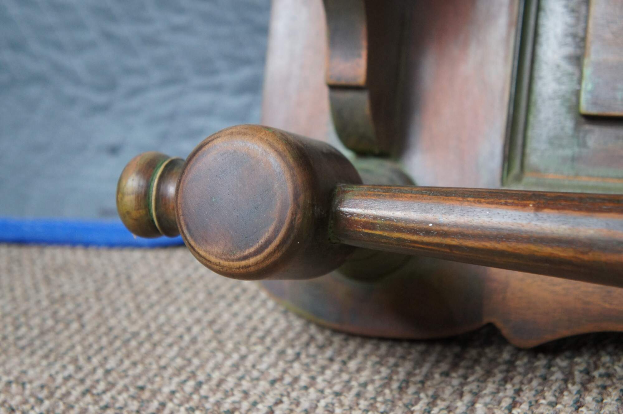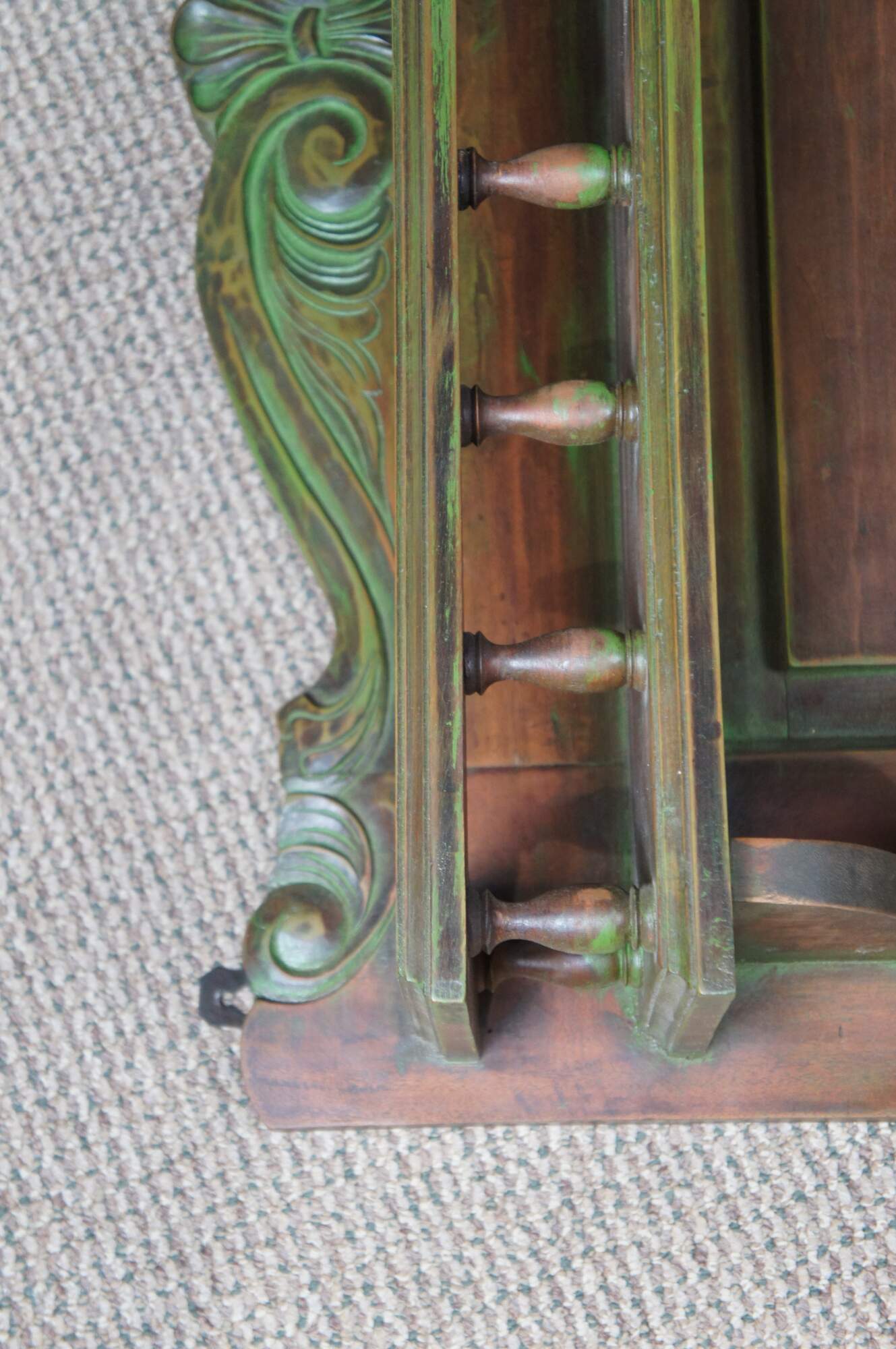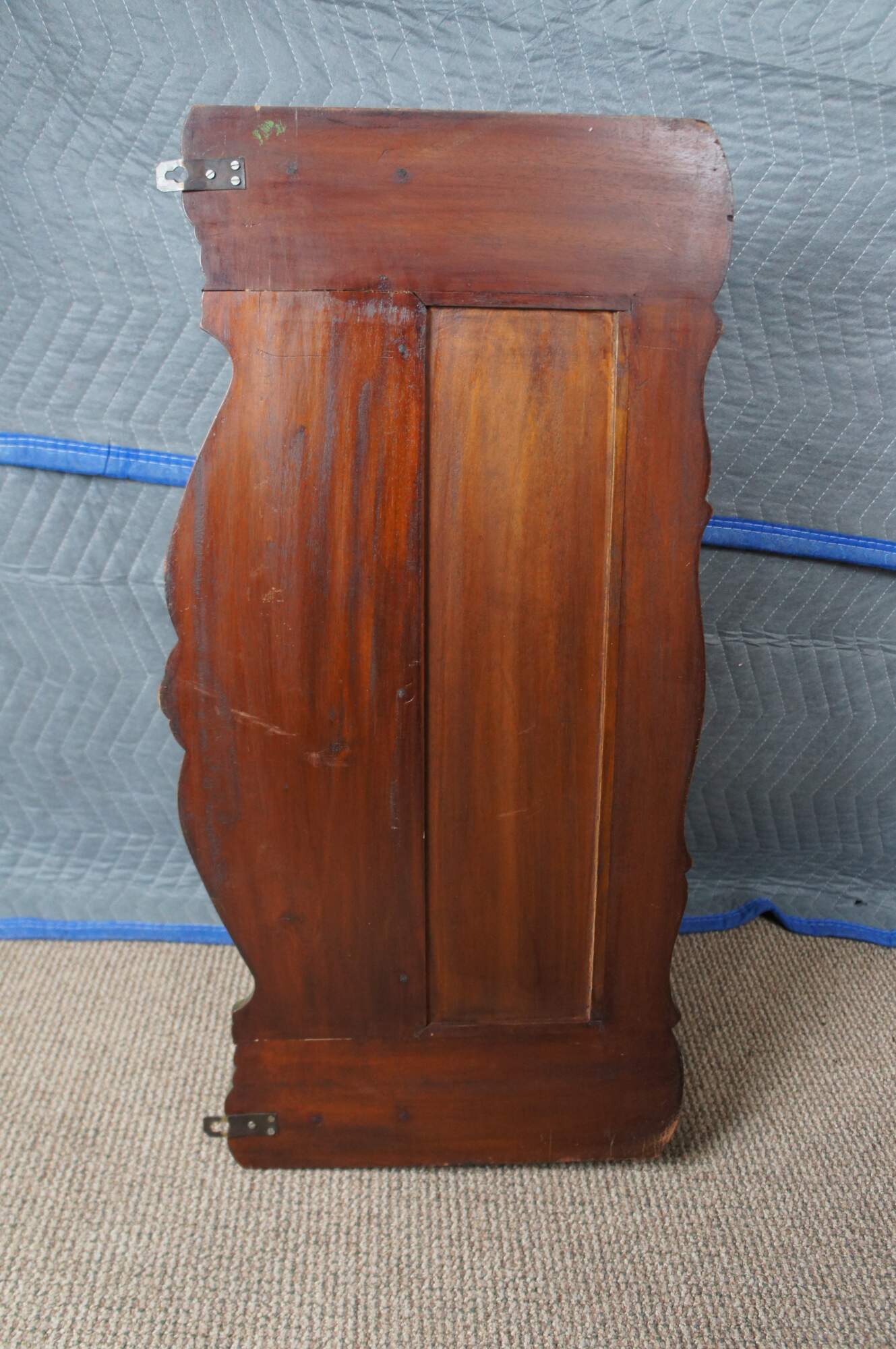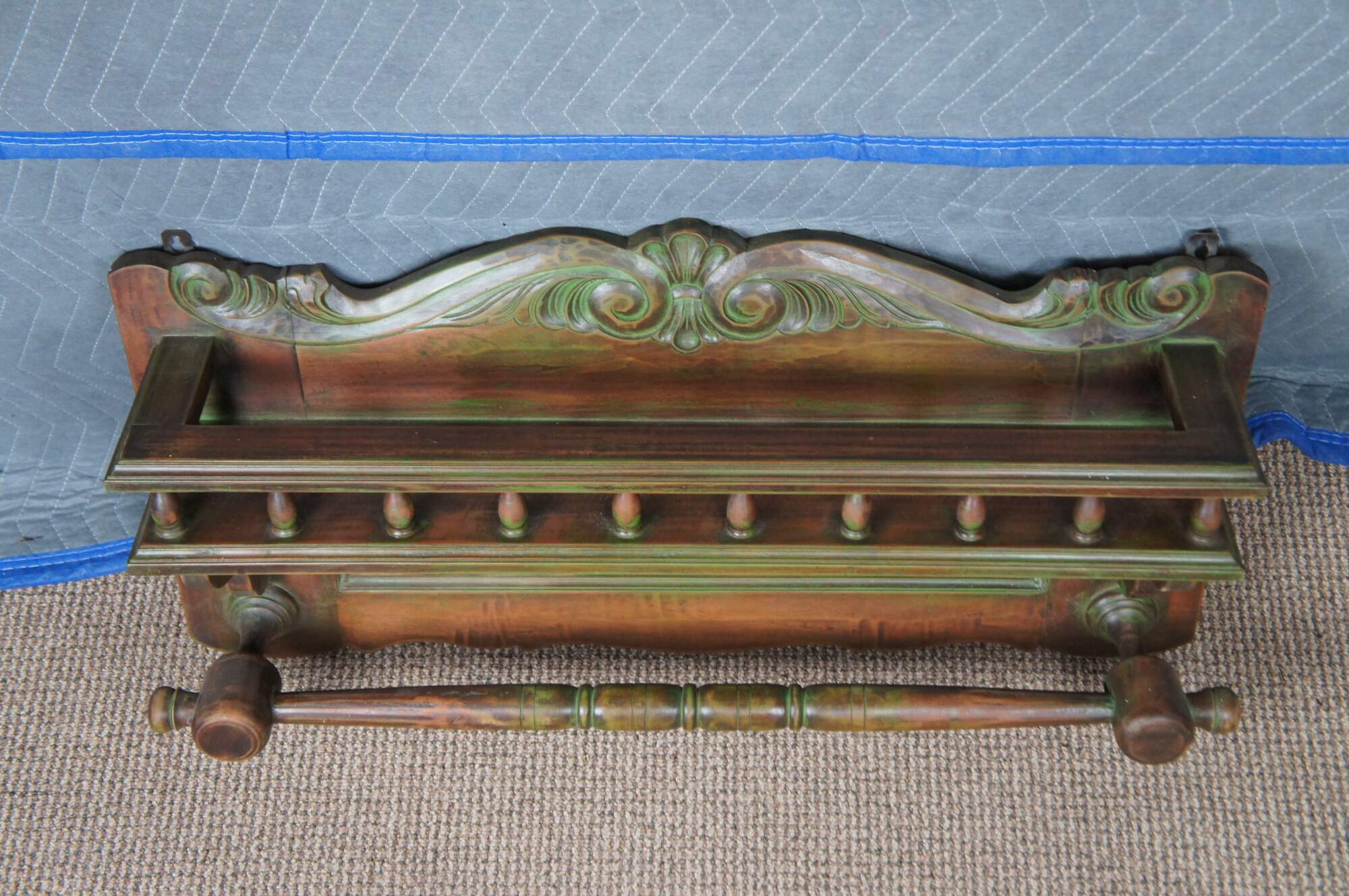Antique Victorian mahogany wall shelf and towel bar. Great for use near a bathroom vanity or in the kitchen. Features a mahogany frame with a serpentine "S" scrolled backsplash. A shelf with spindled gallery and lower towel bar. Hangs along the backside via two metal plates.