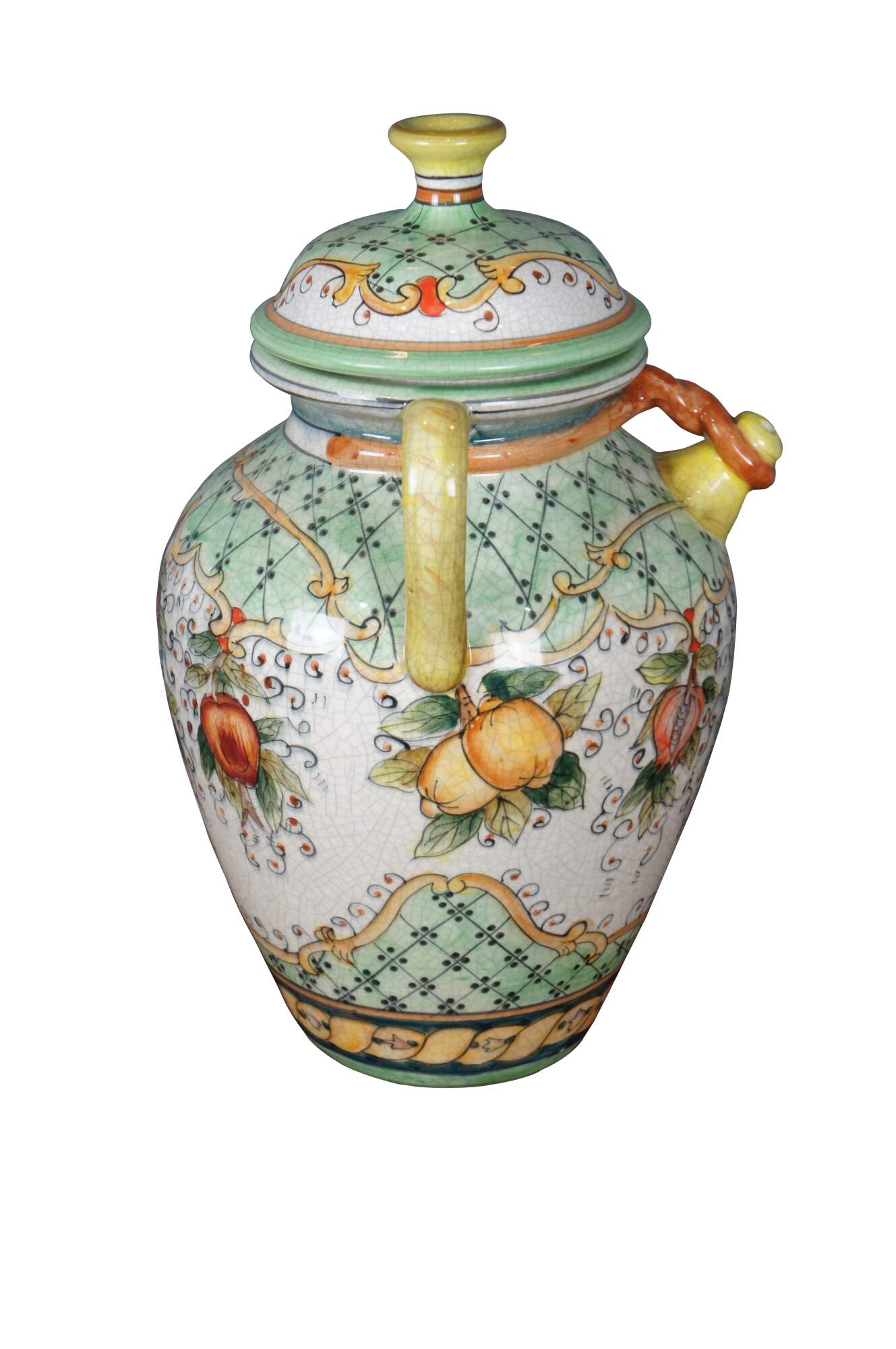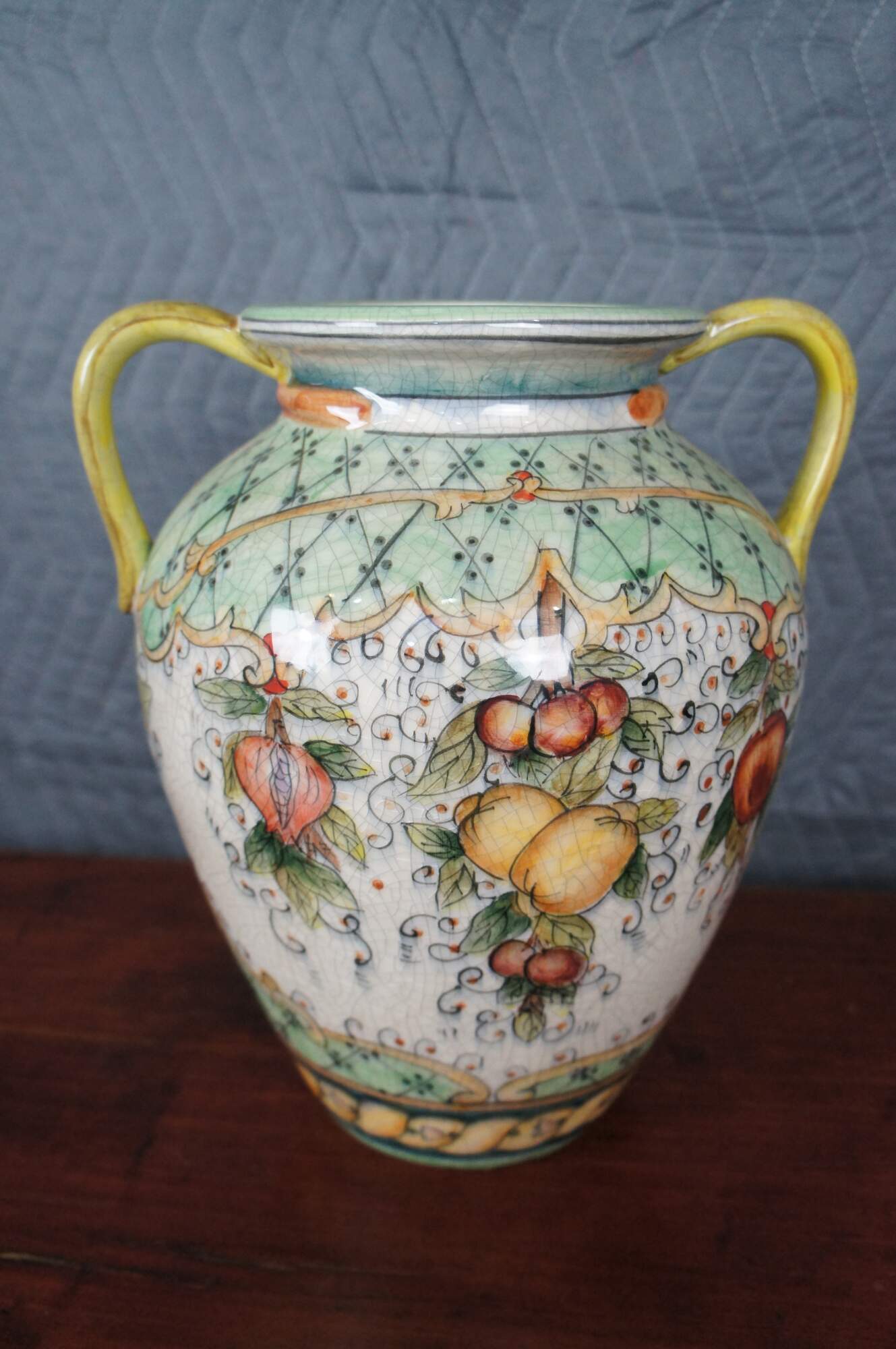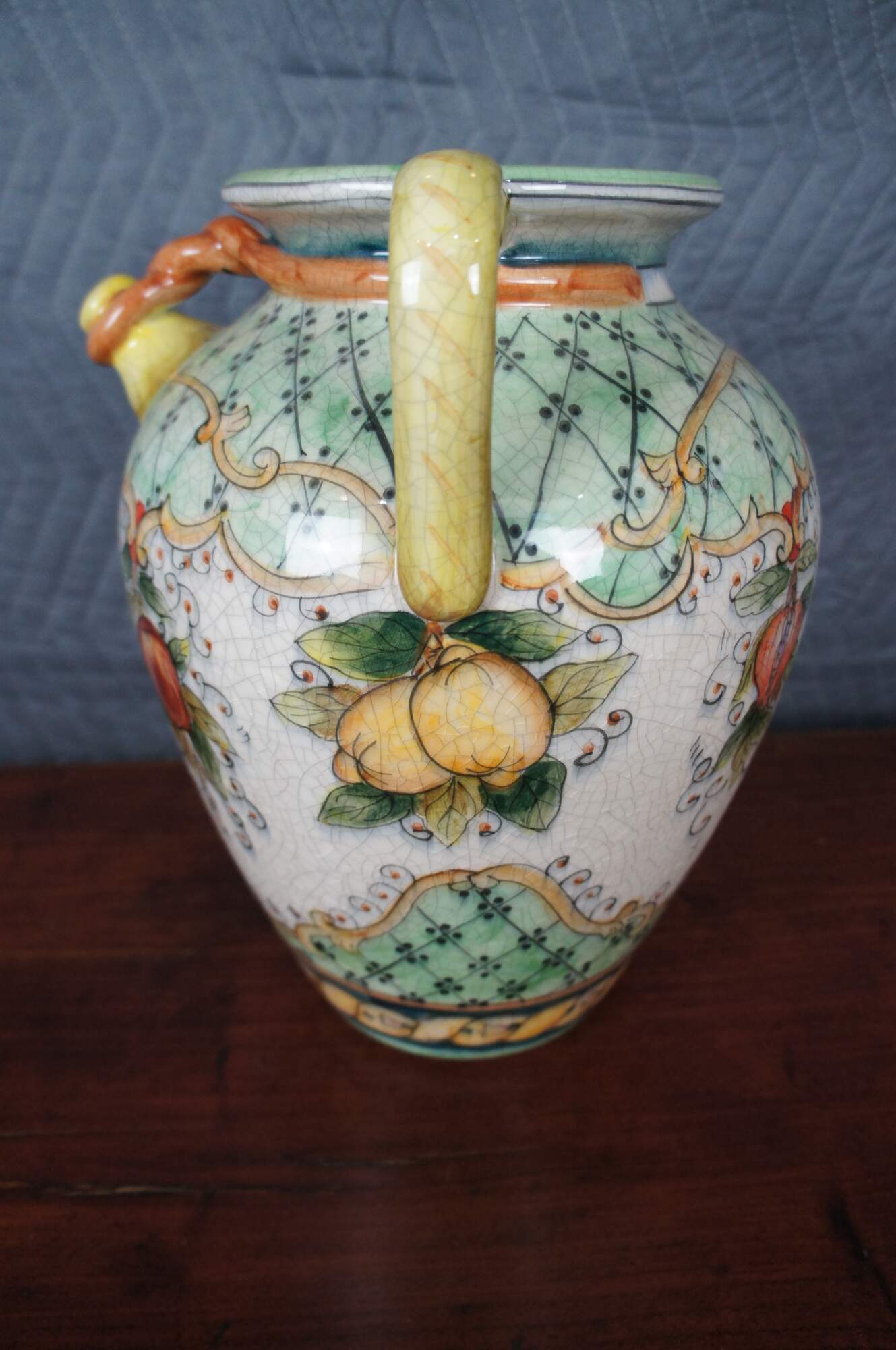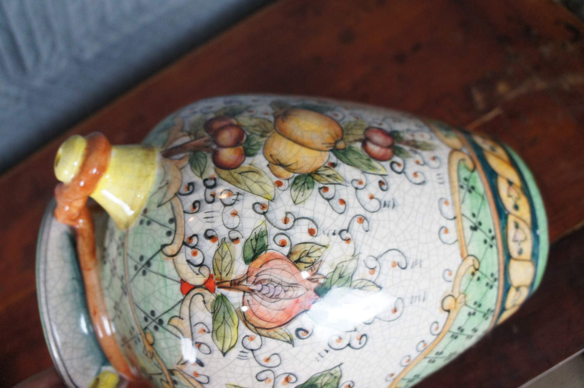 Late 20th Century urn or vase in Italian majolica manner. Features rope twisted handles and a painted fruit design with crackle glaze. Inspired by the Italian artisans behind Deruta. Marked China along the base.