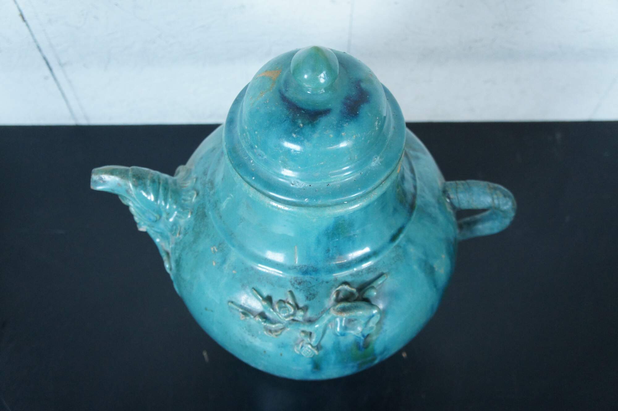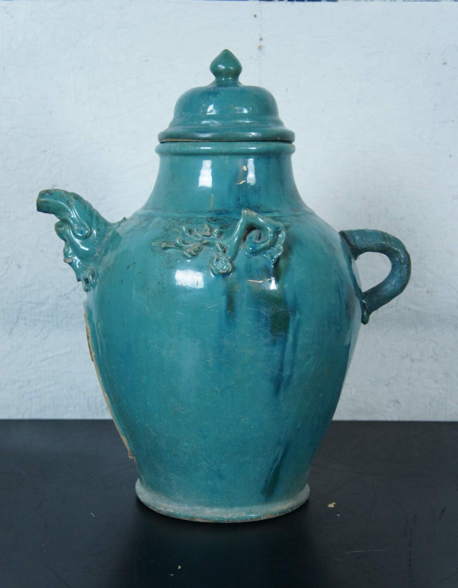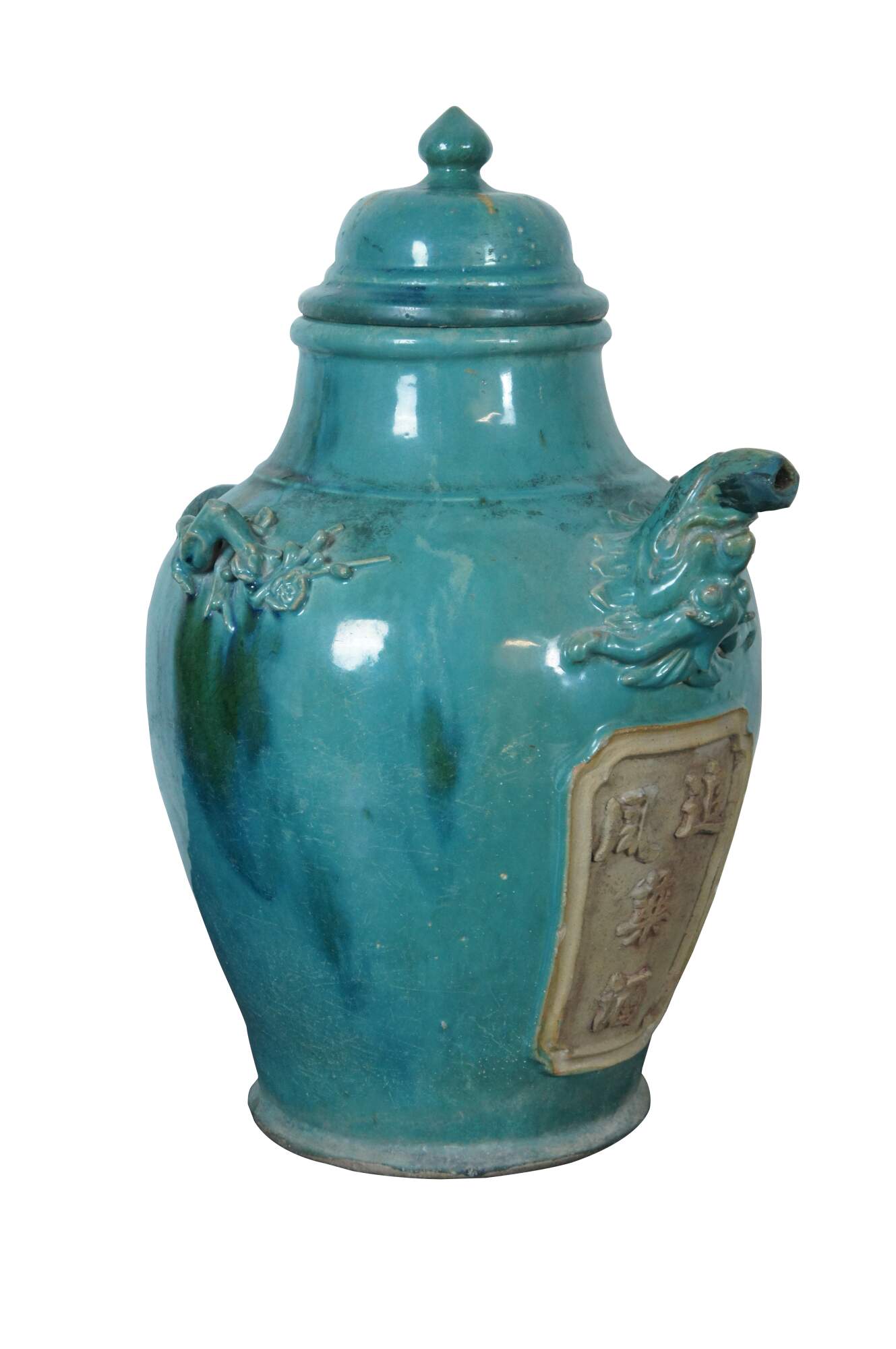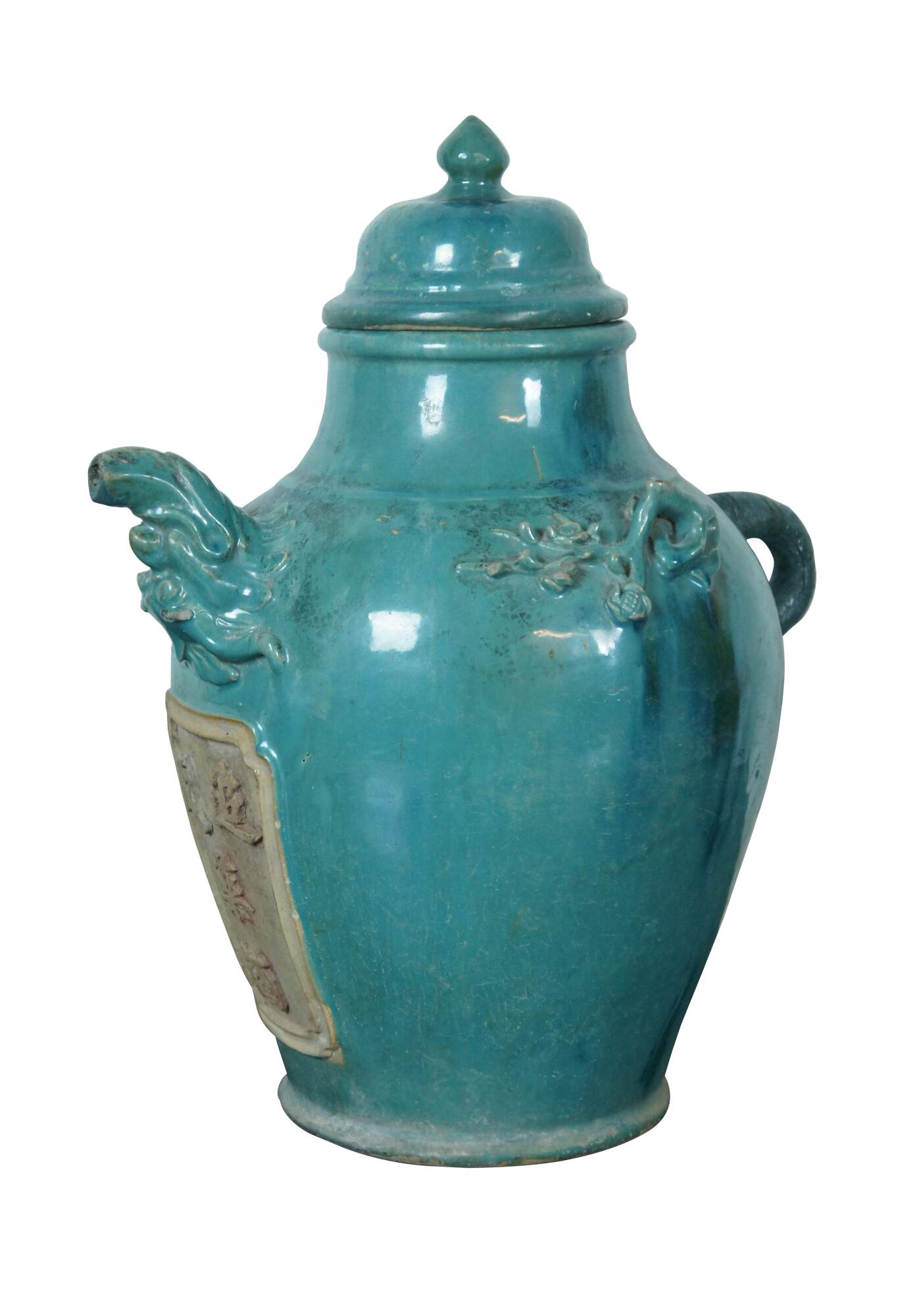Antique Chinese Chinoiserie medicine or wine jug / mantel urn / jar - turquoise / blue-green glaze with small handle, upsidedown dragon head spout, ginger jar shaped lid, and plaque on front.