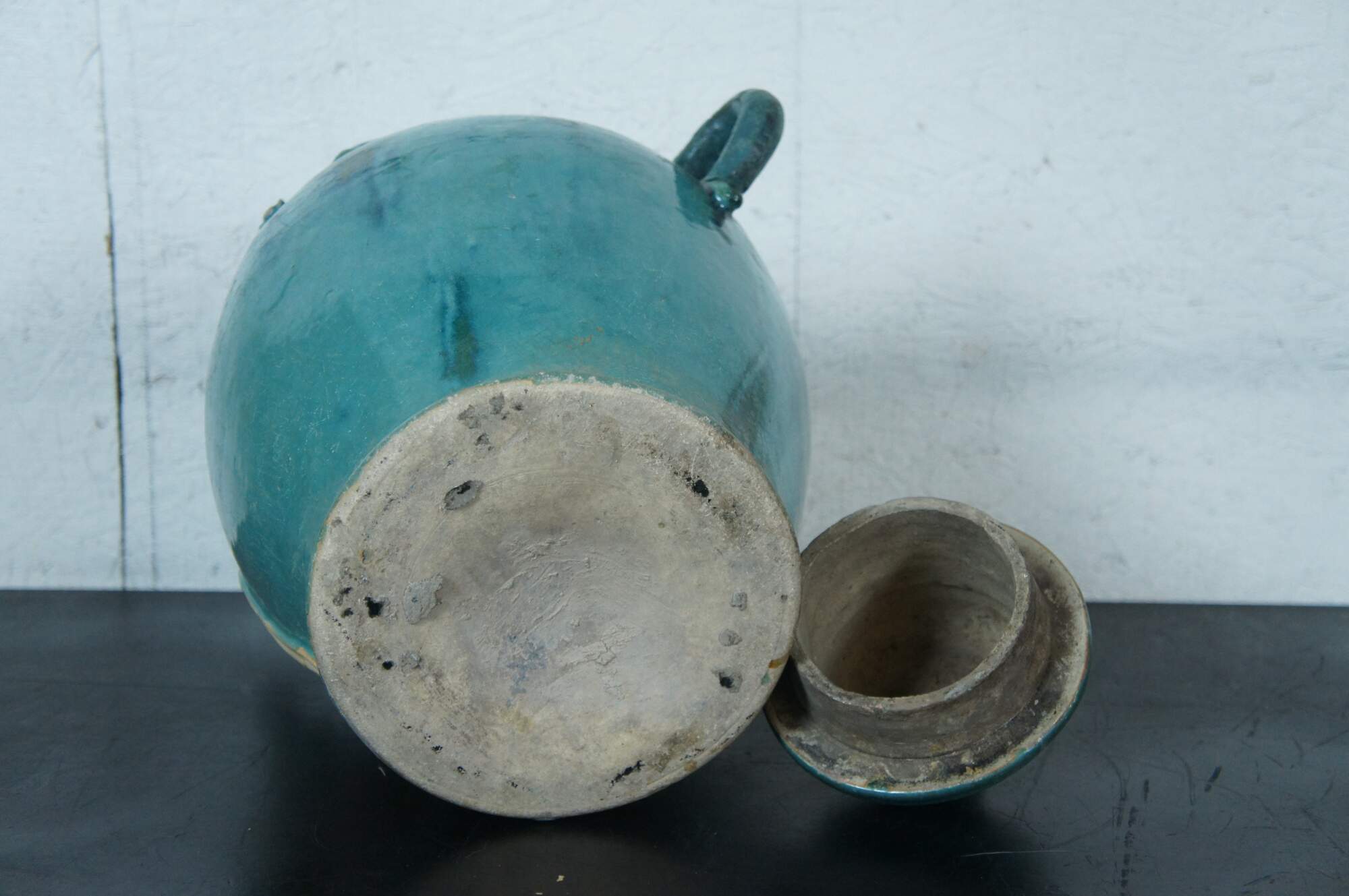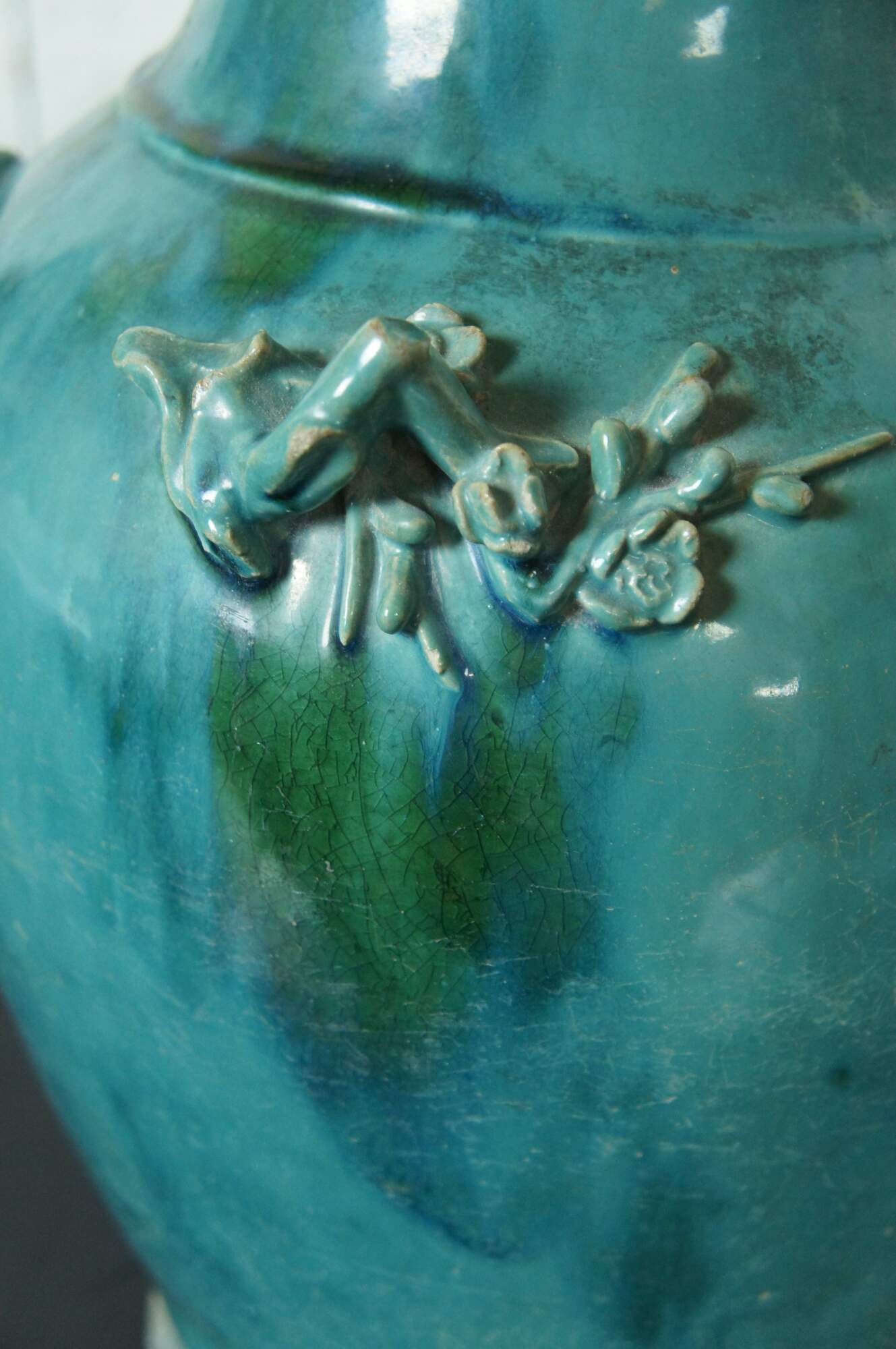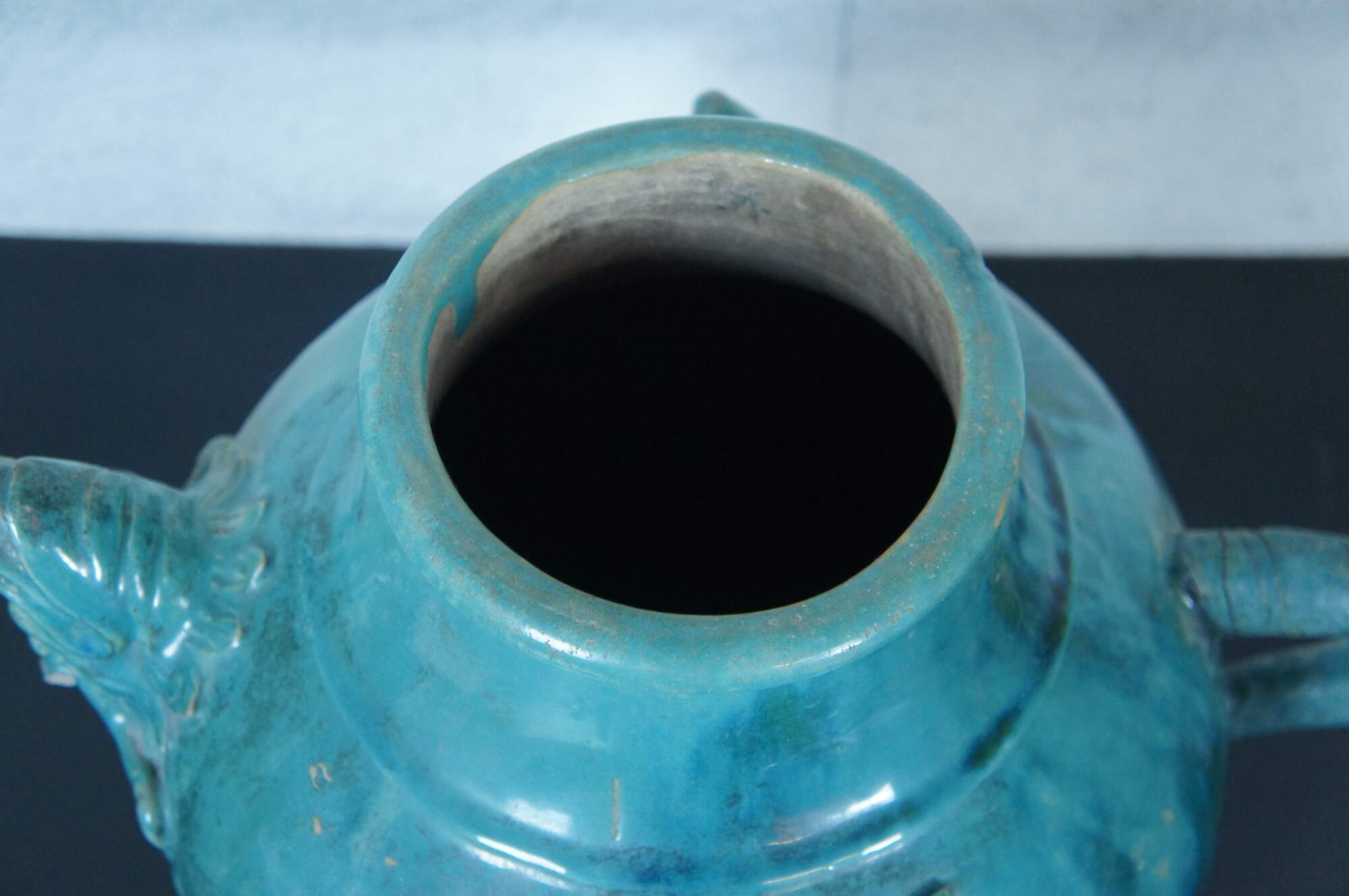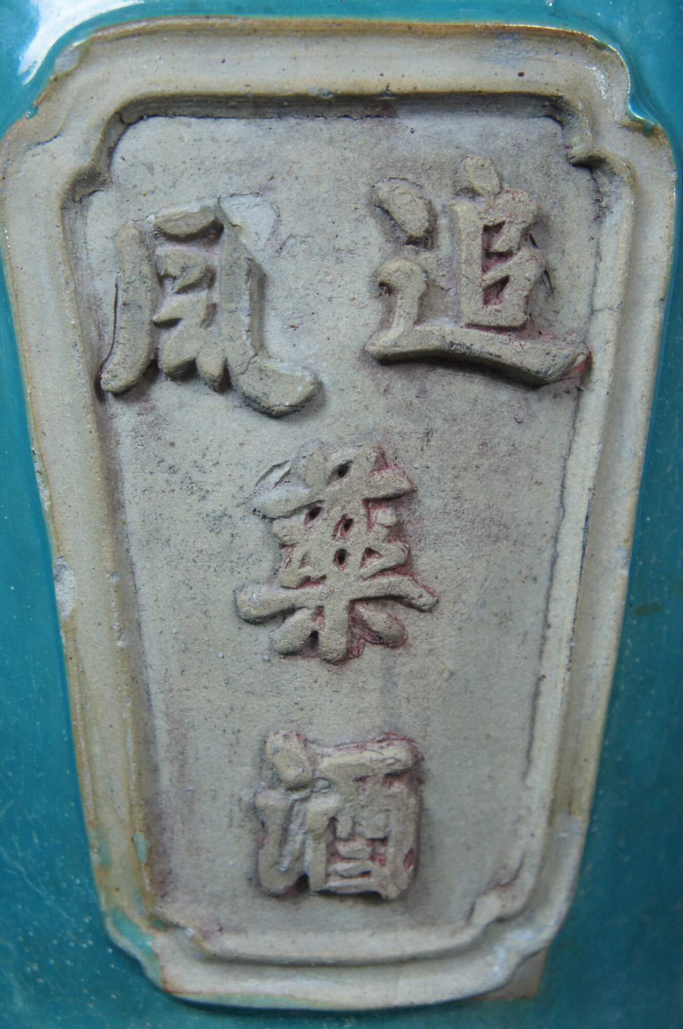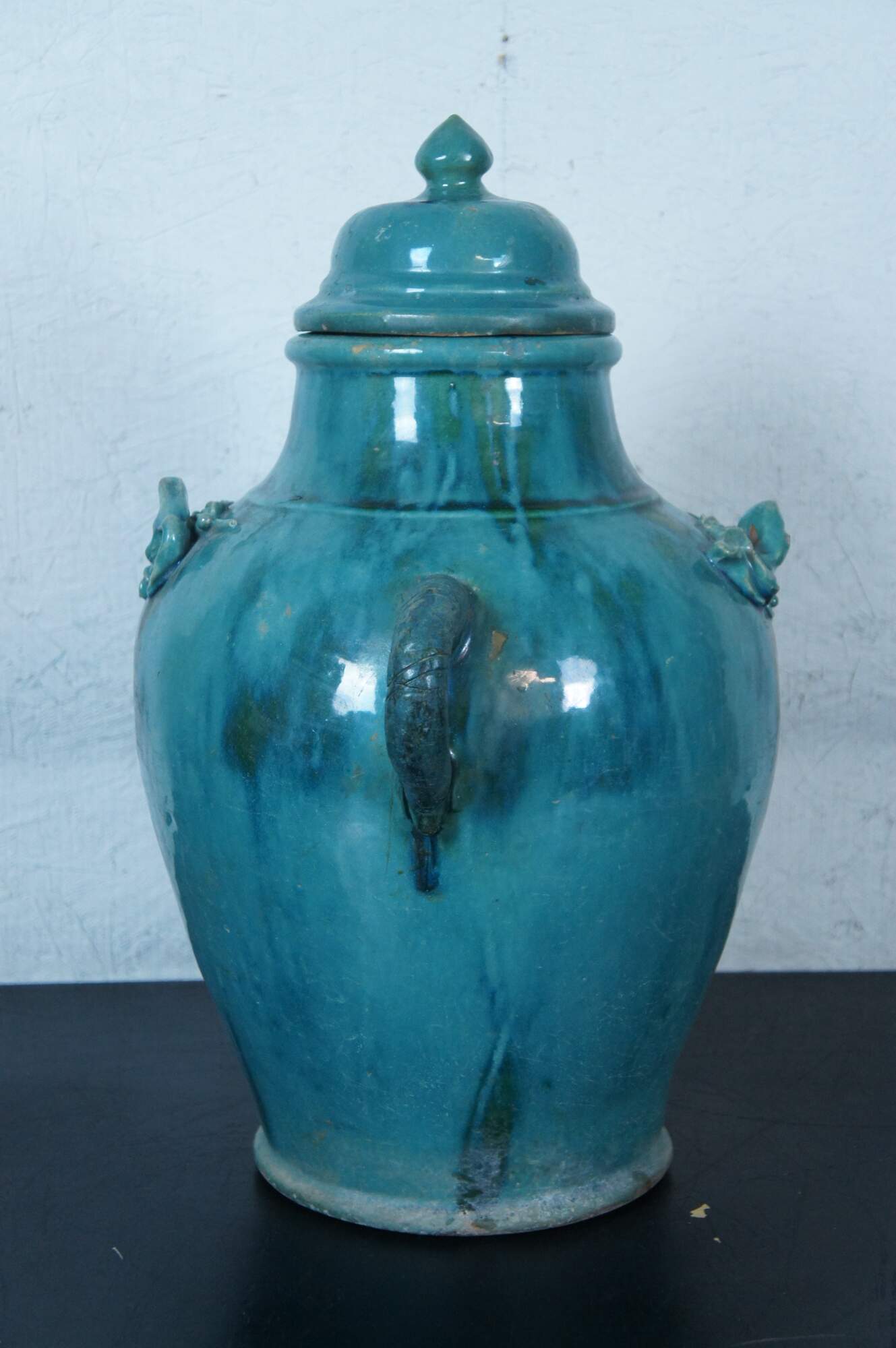 Antique Chinese Chinoiserie medicine or wine jug / mantel urn / jar - turquoise / blue-green glaze with small handle, upsidedown dragon head spout, ginger jar shaped lid, and plaque on front.