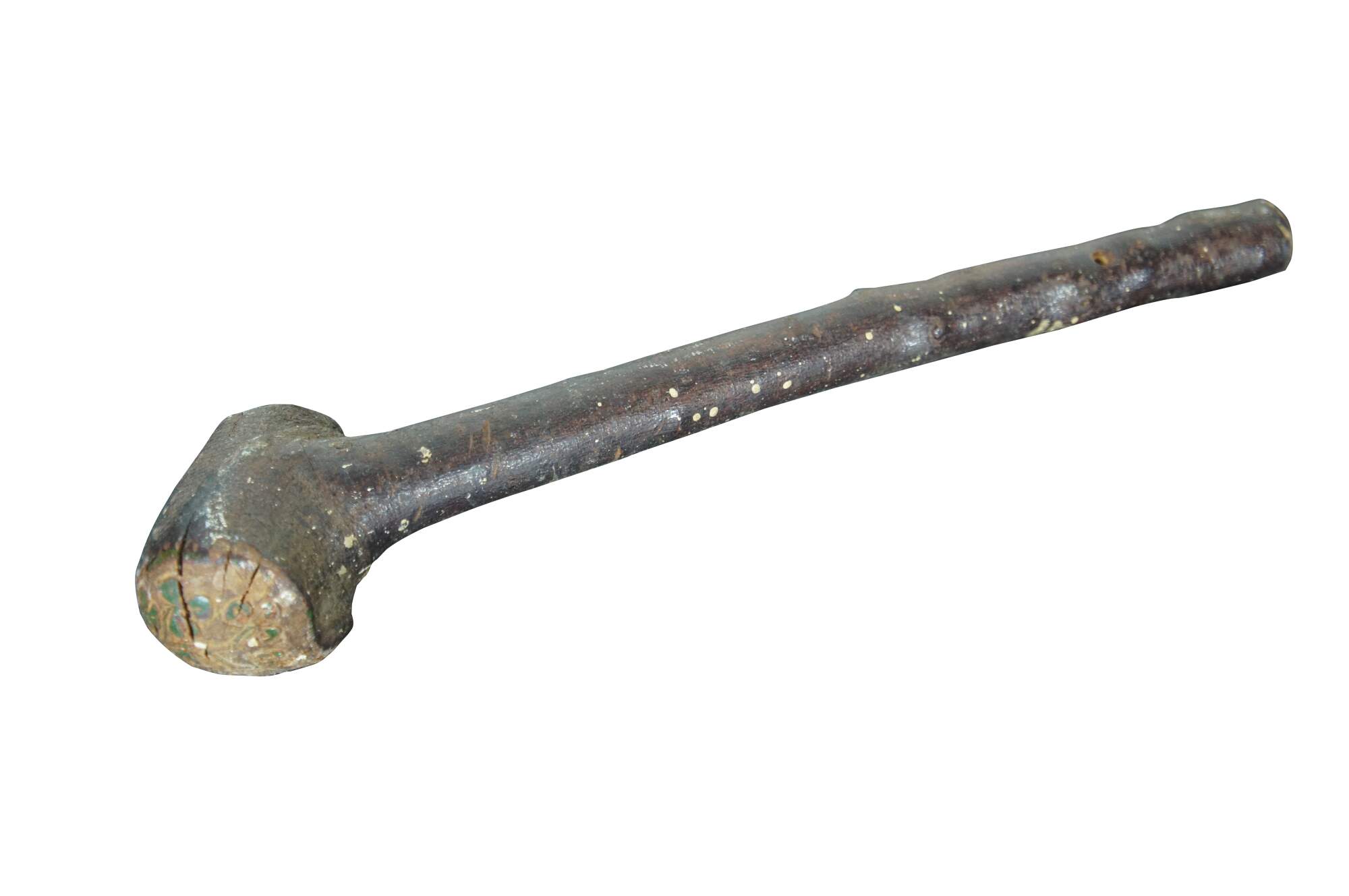 Early 20th century primitive brutalist style Irish bog blackthorn knobkerrie / shillelagh / club, featuring carved designs of a harp, three leaf clovers / shamrocks, and Erin painted in green on the cut ends. Drilled hole on handle for leather thong / wrist strap.