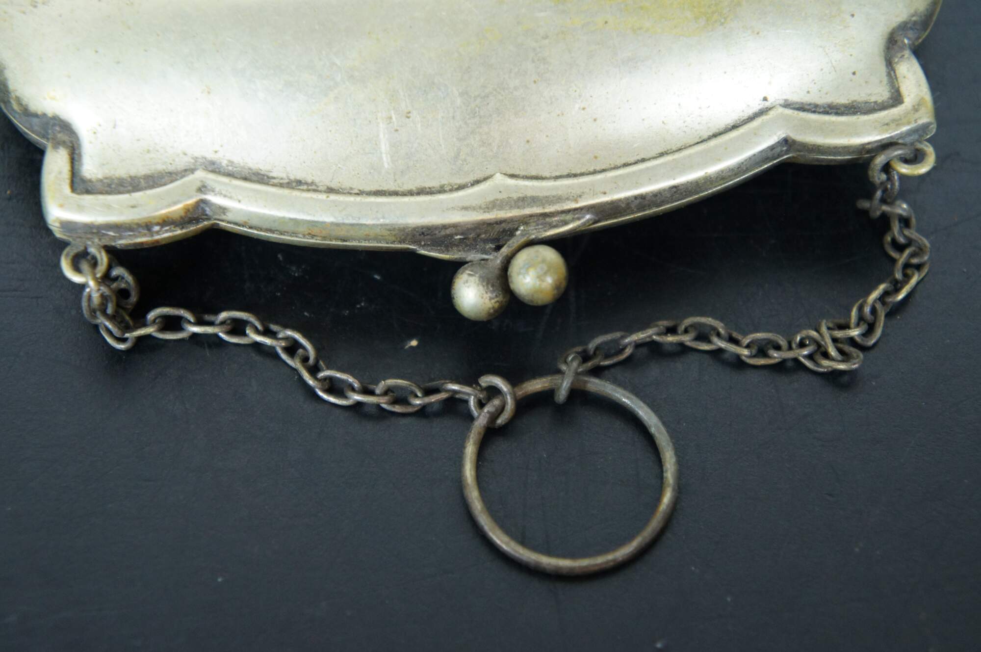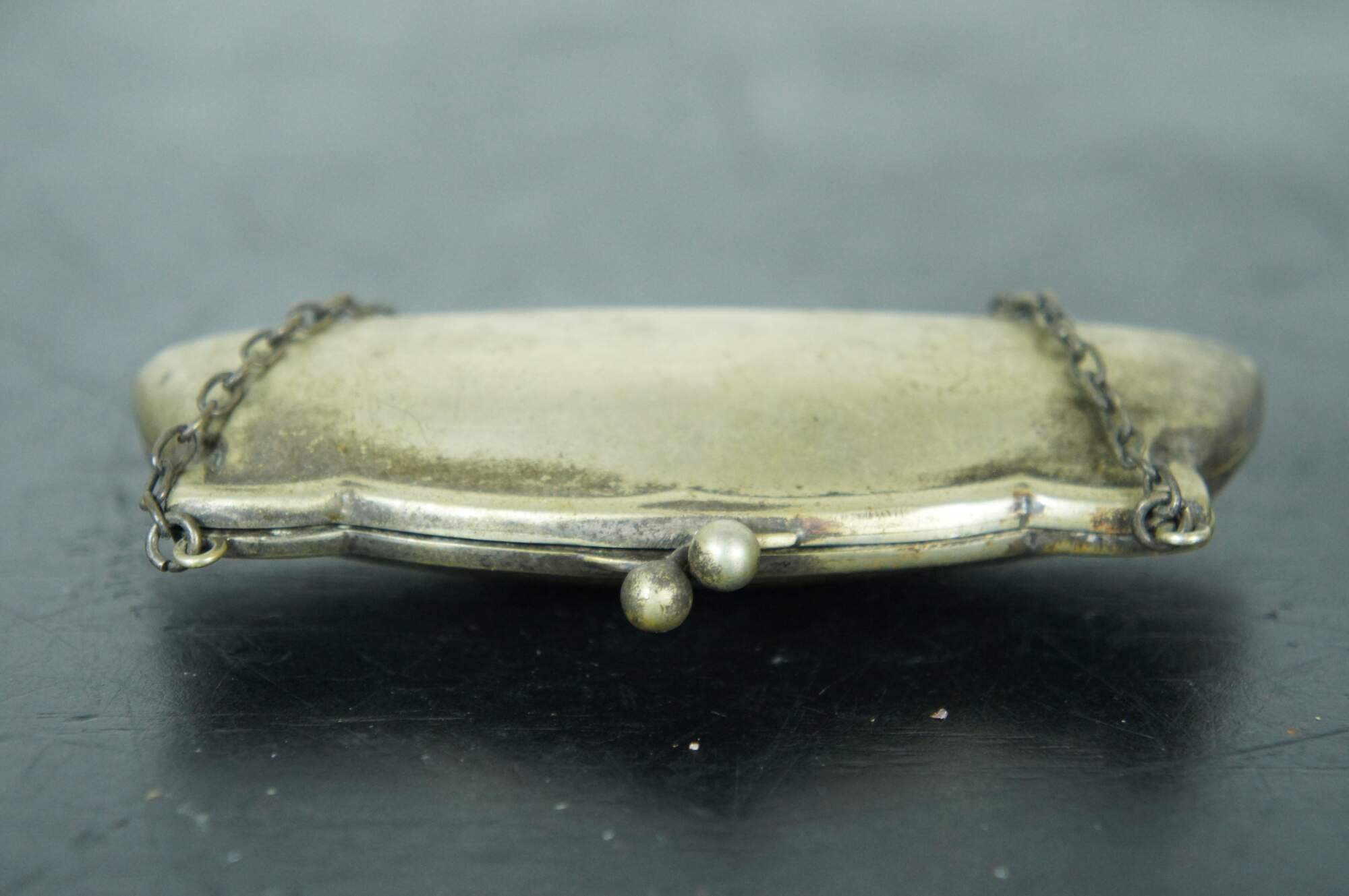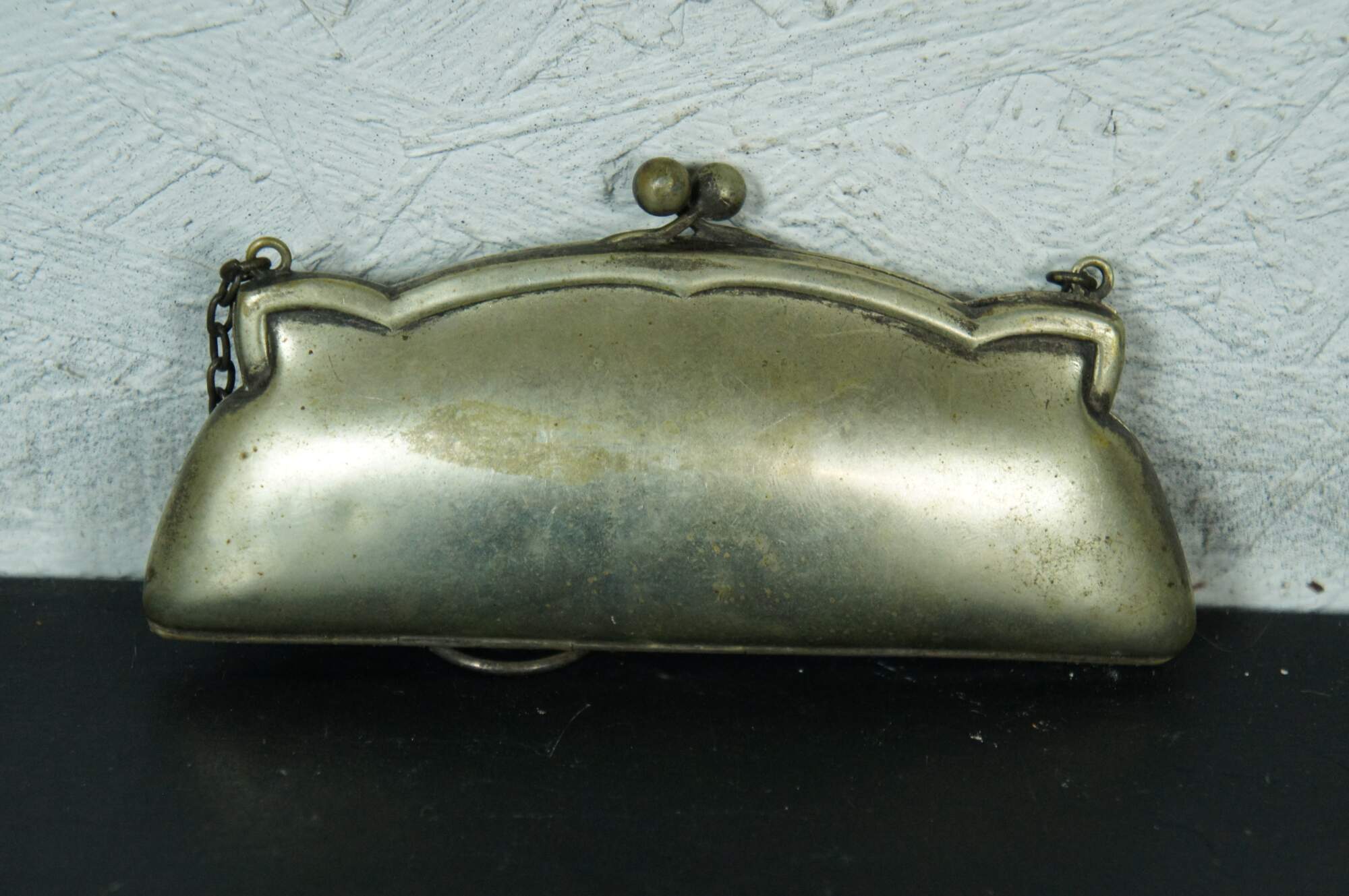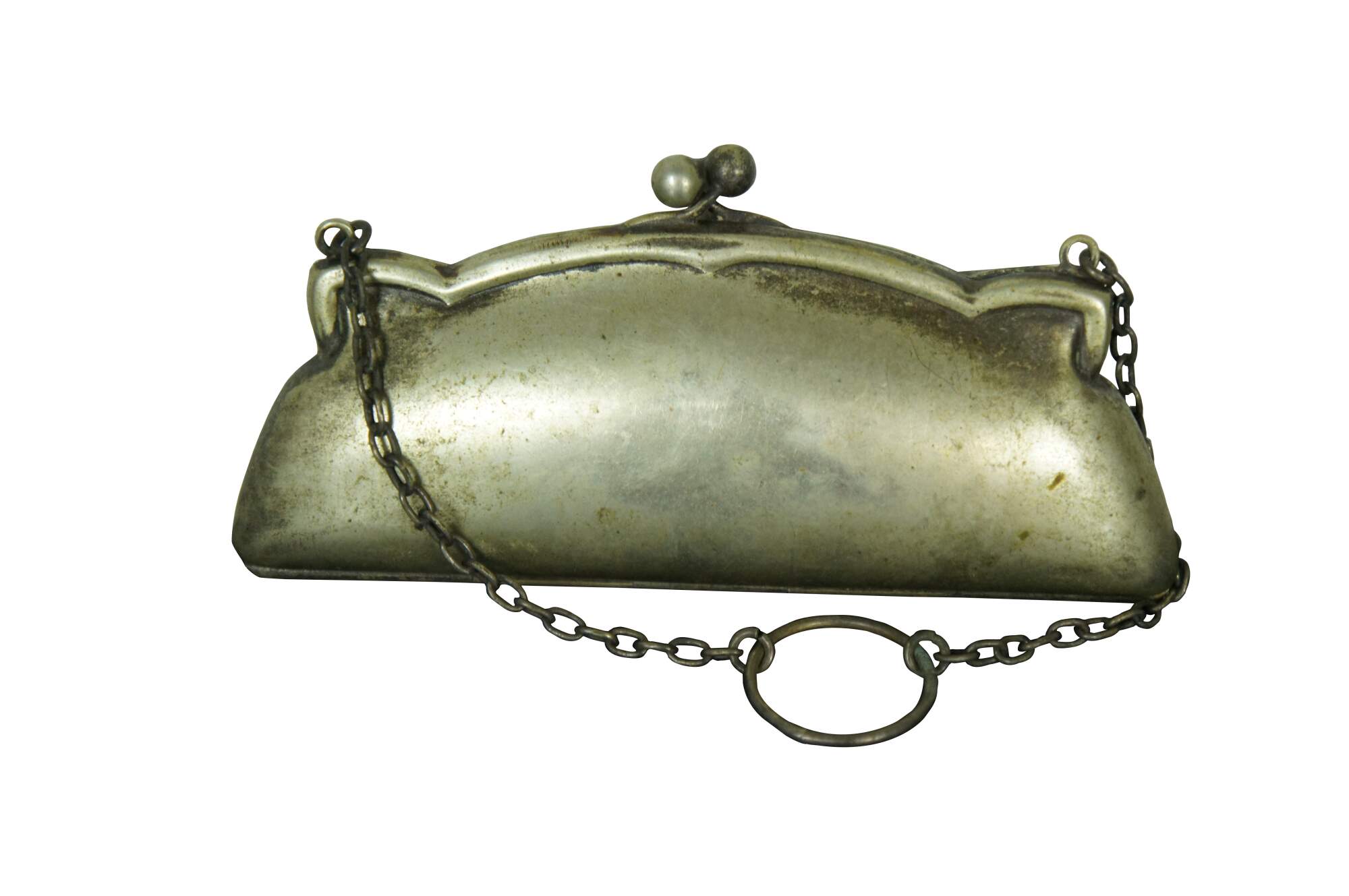 An elegant silver plated dance purse - the perfect party accessory of a 1920s/1930s lady; holding their dance tickets, coins and night essentials. Hanging from its finger chain.