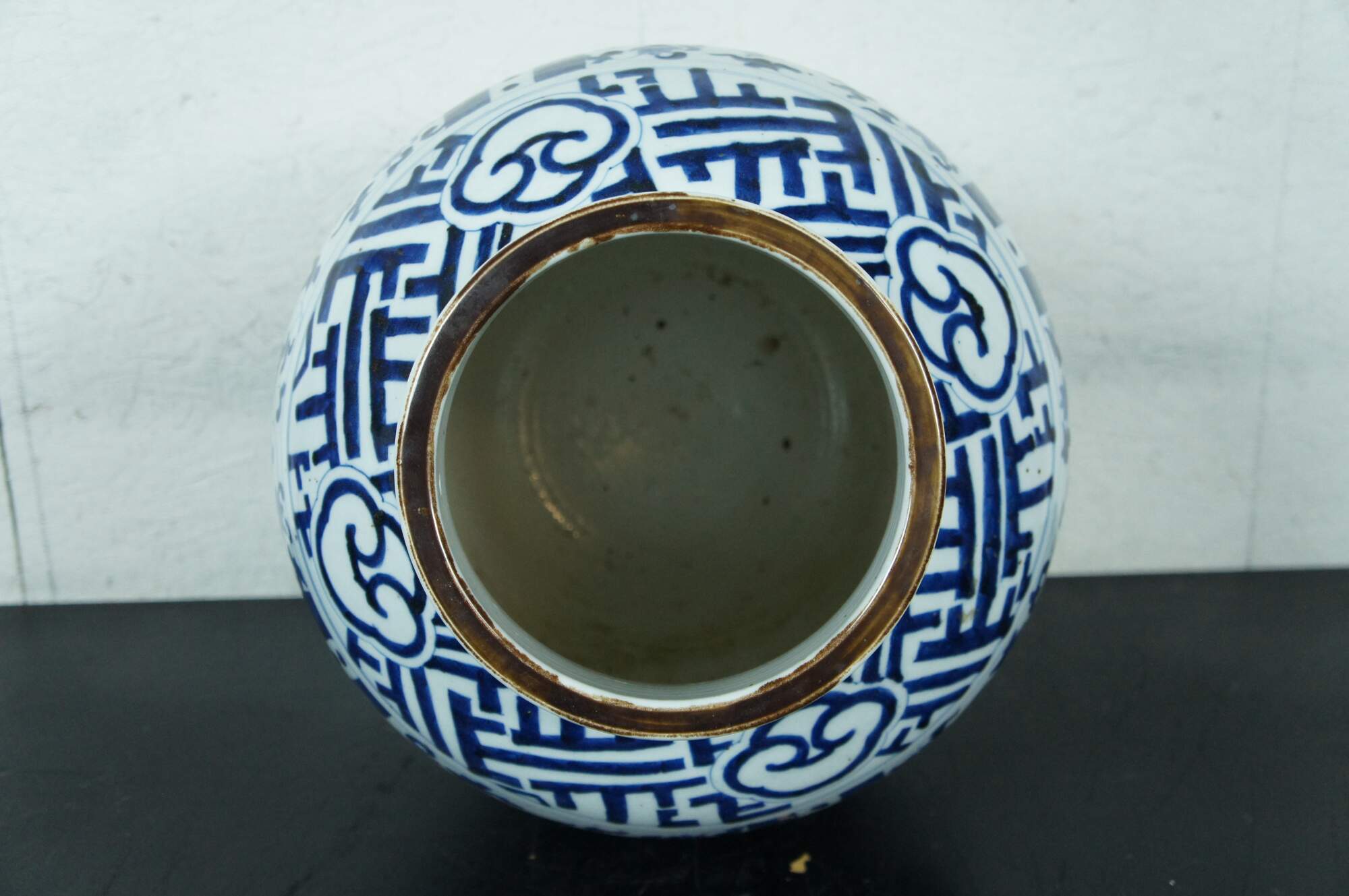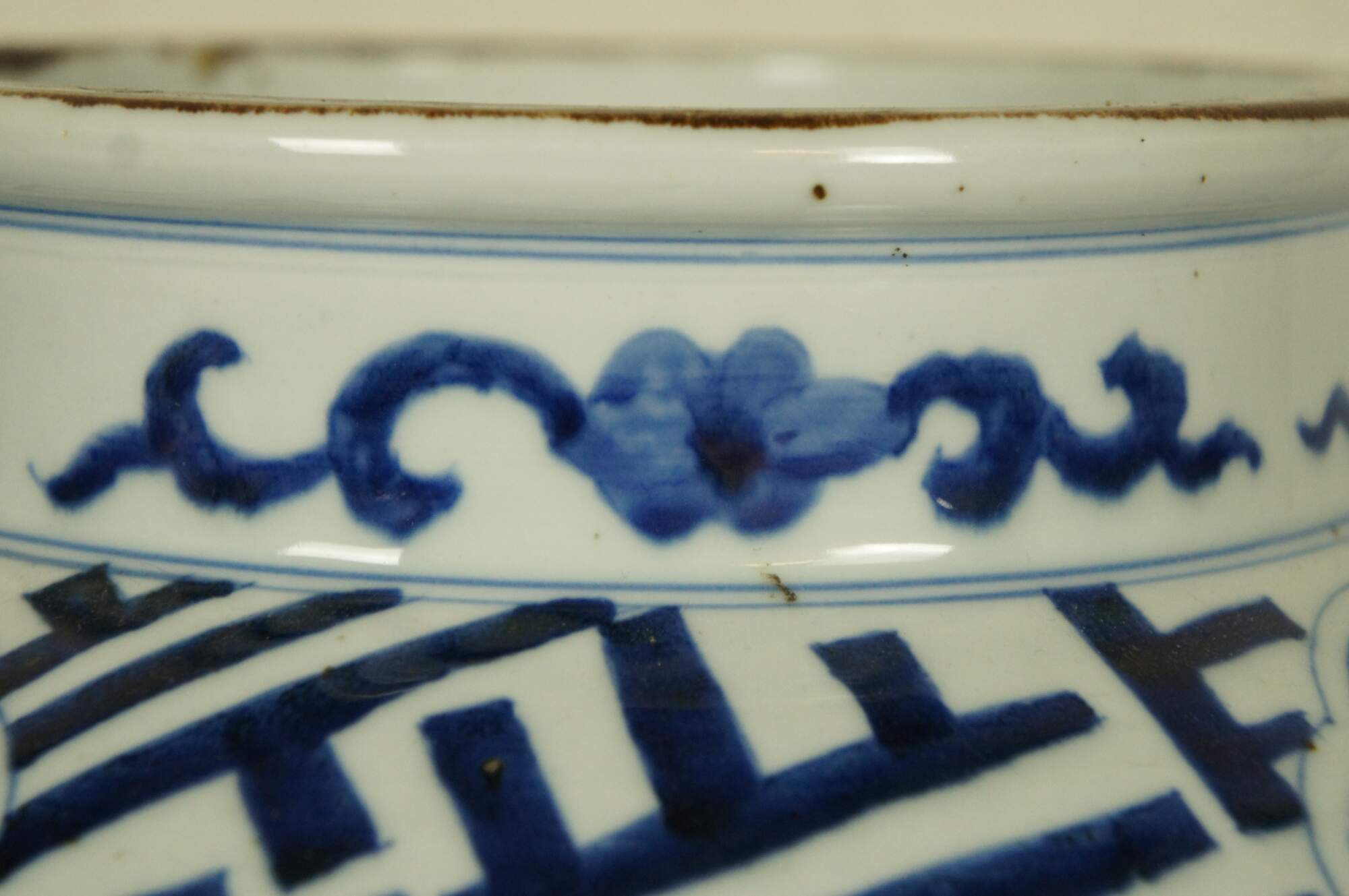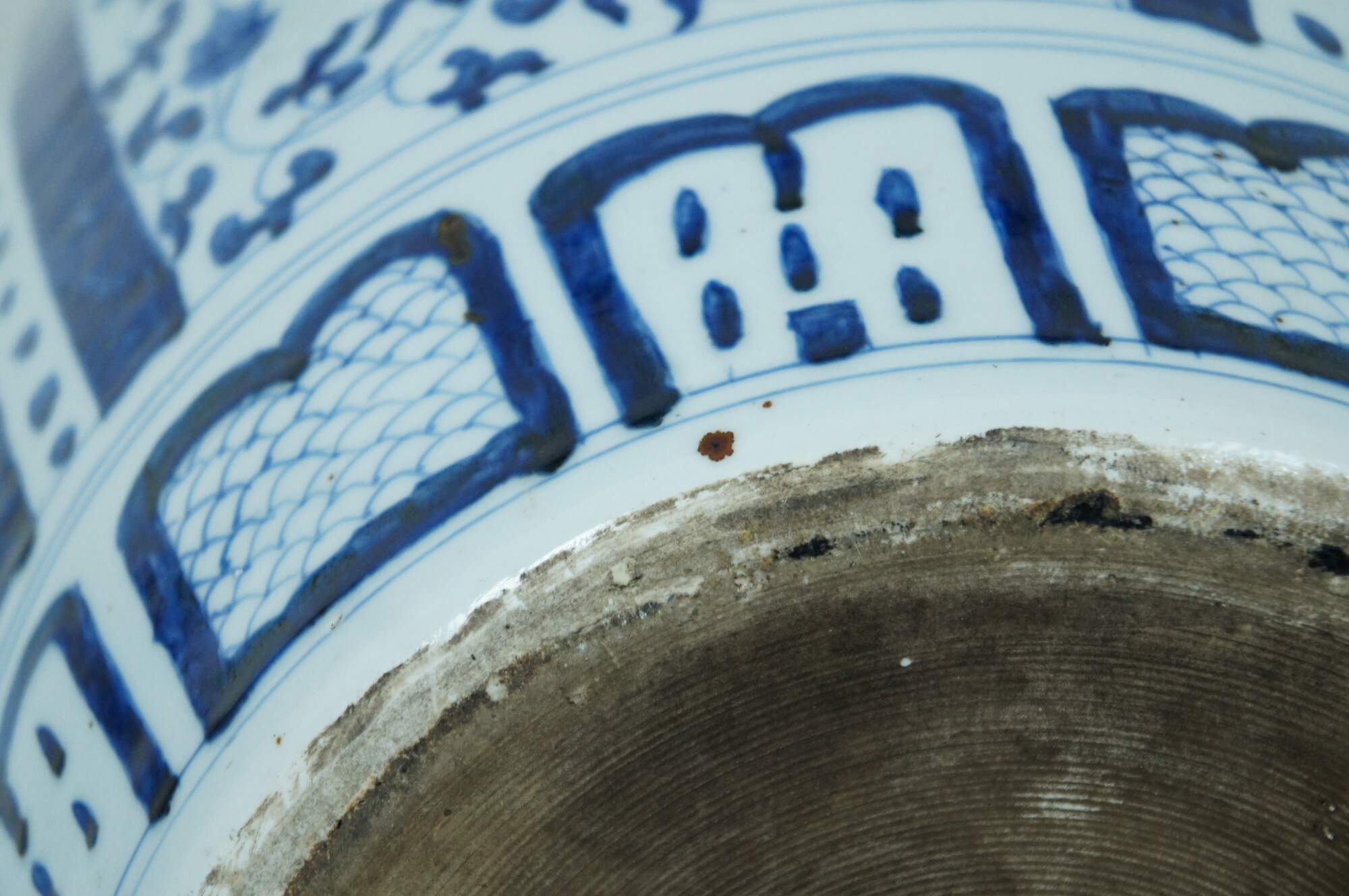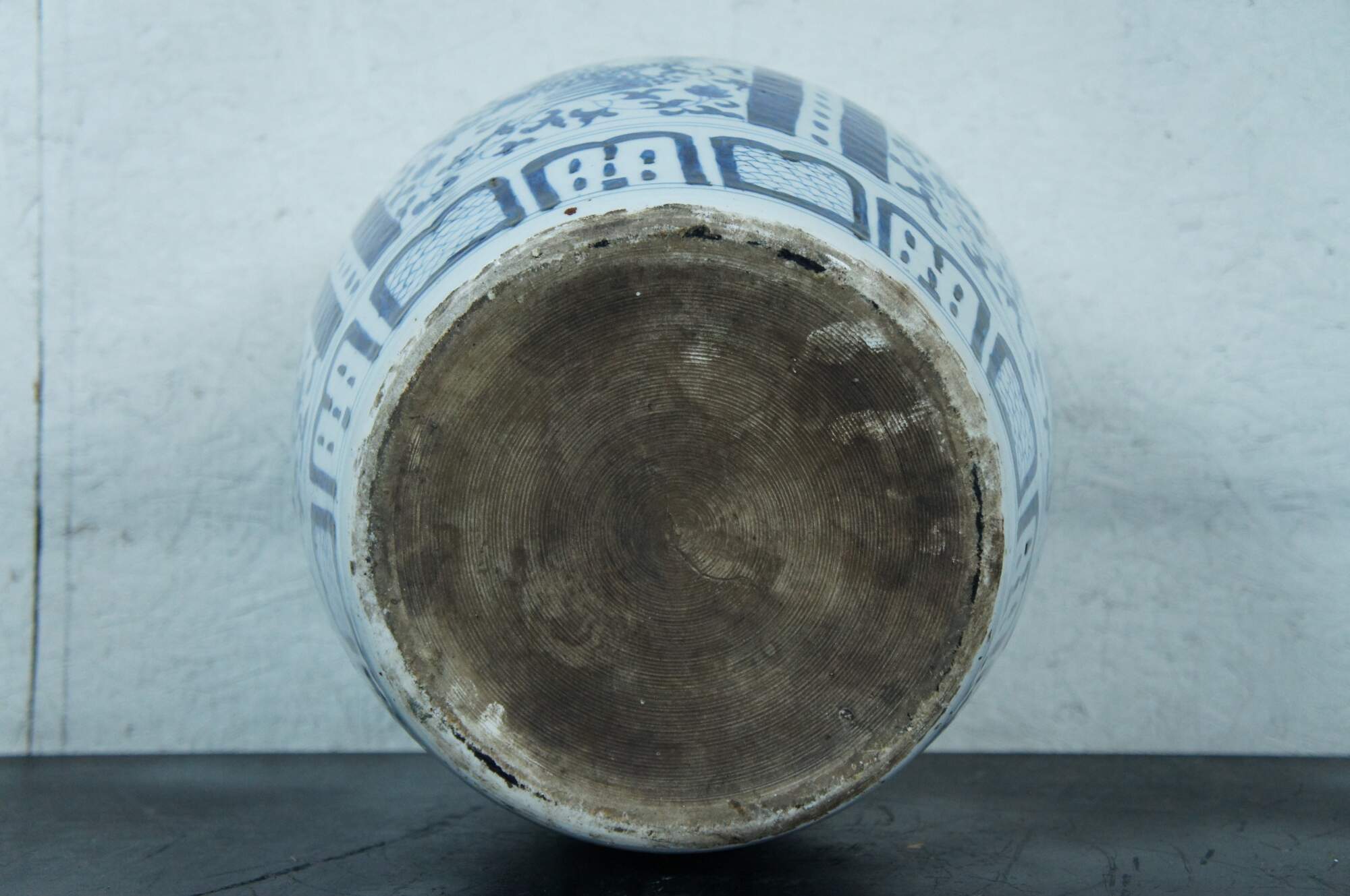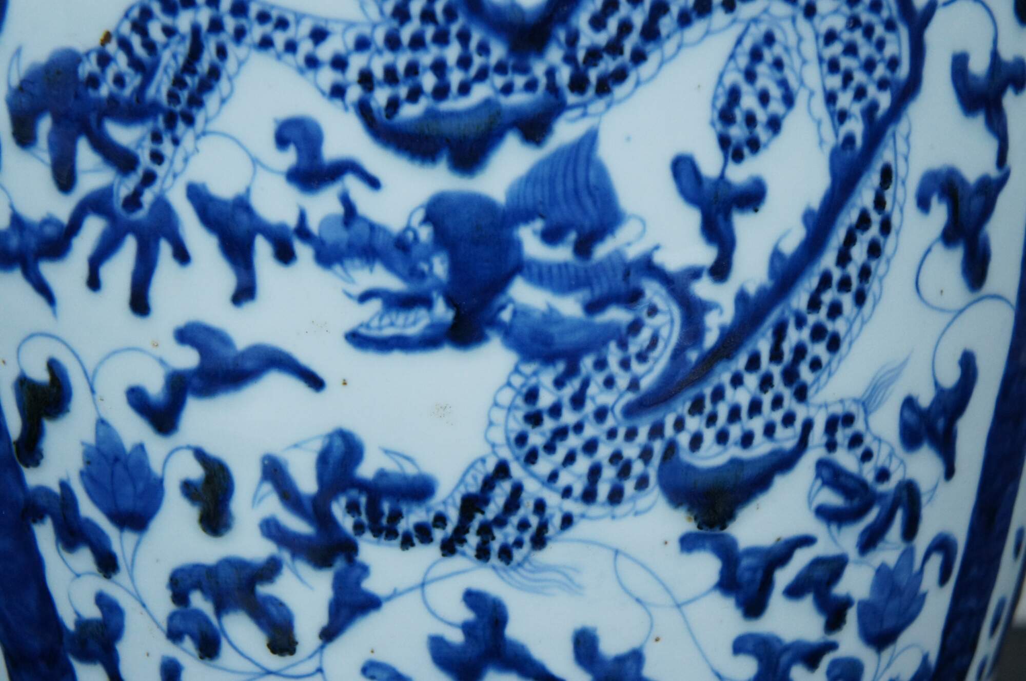 A large and impressive antique Chinese Qing dynasty blue and white ceramic mantel urn / floor vase / jardiniere / planter, hand painted with alternating panels showing a phoenix and dragon framed with flowers and geometric designs.