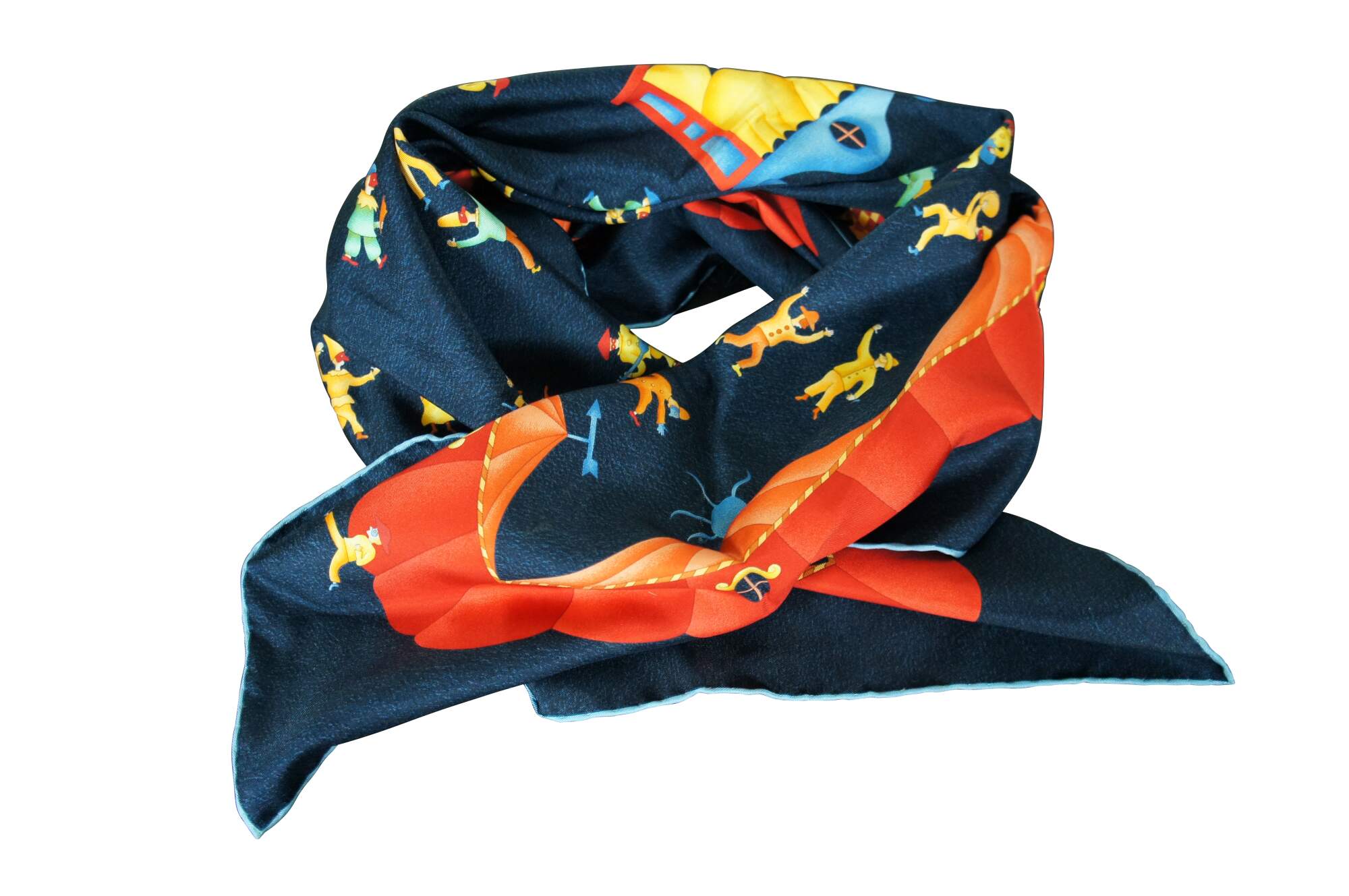 Vintage Bvlgari 100% silk scarf featuring a design by Davide Pizzigoni - navy blue ground trimmed in red-orange circus tents and yellow curtained stages, surrounded by dozens of commedia del arte style clowns / performers in a variety of attitudes. Made in Italy.
