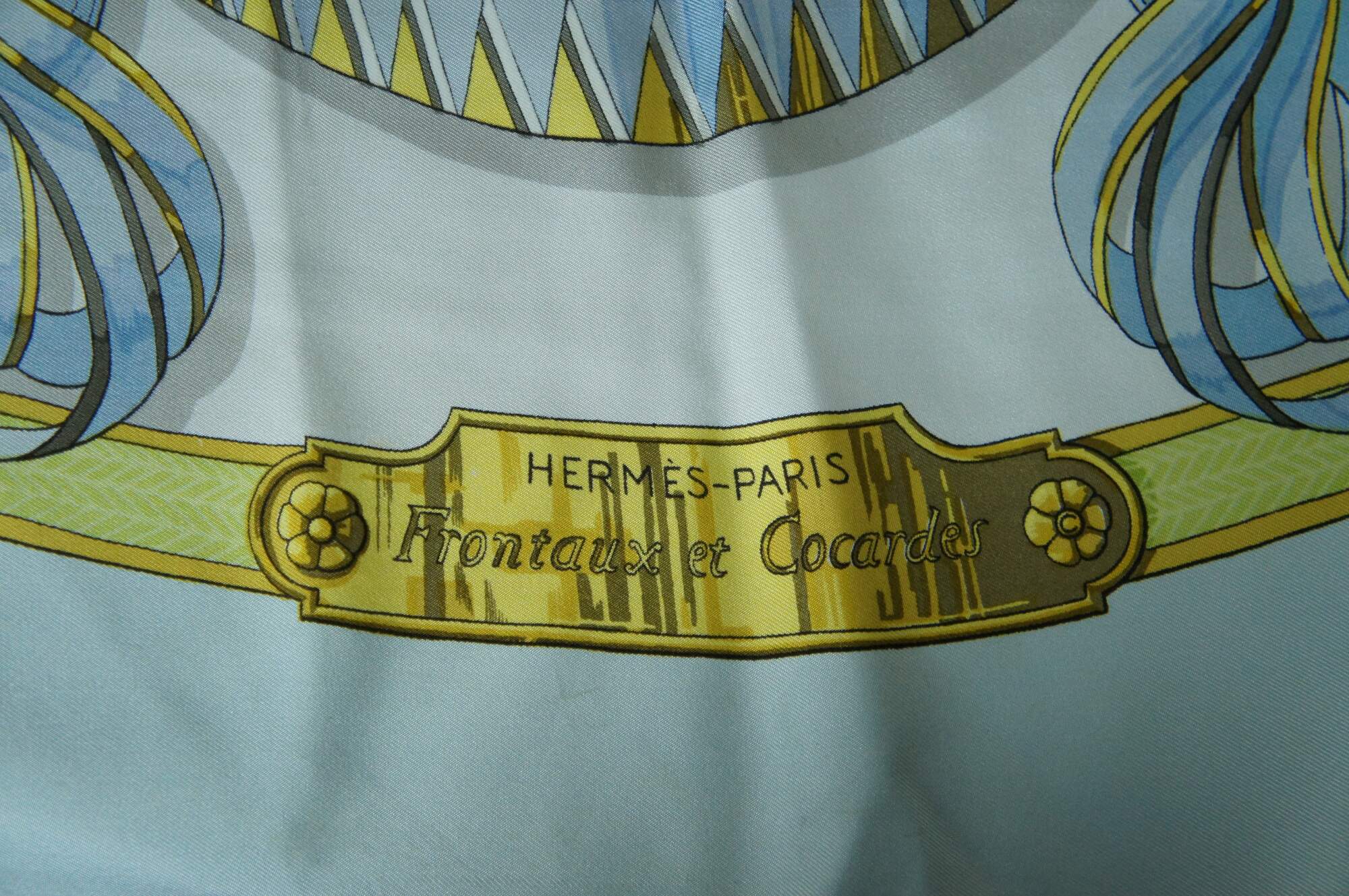 Late 20th century Hermes-Paris Frontaux et Cocardes 100% silk scarf featuring motif of a horse bust and array of prize ribbons in blue, white and chartreuse. Includes box.