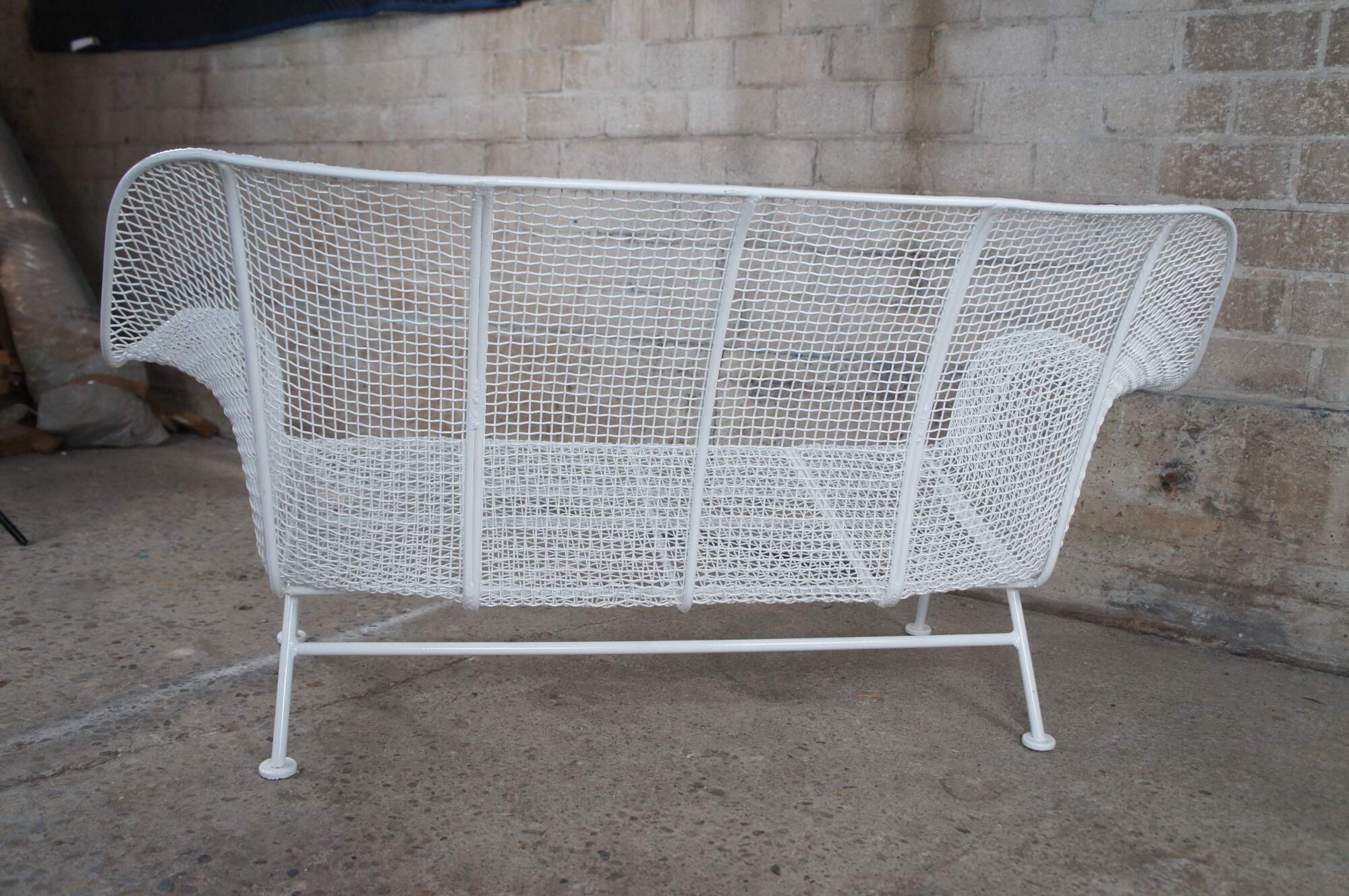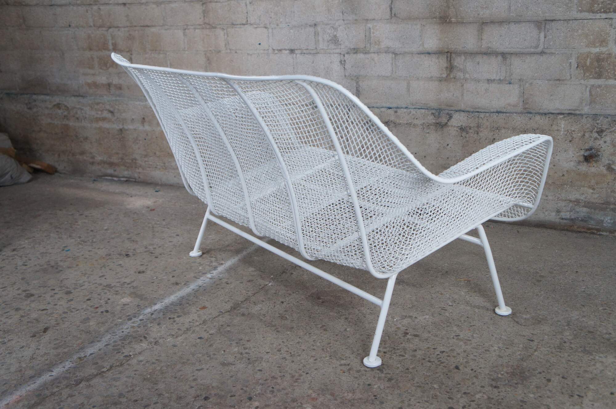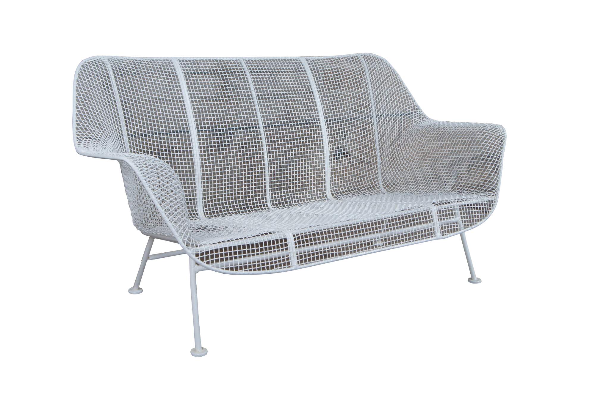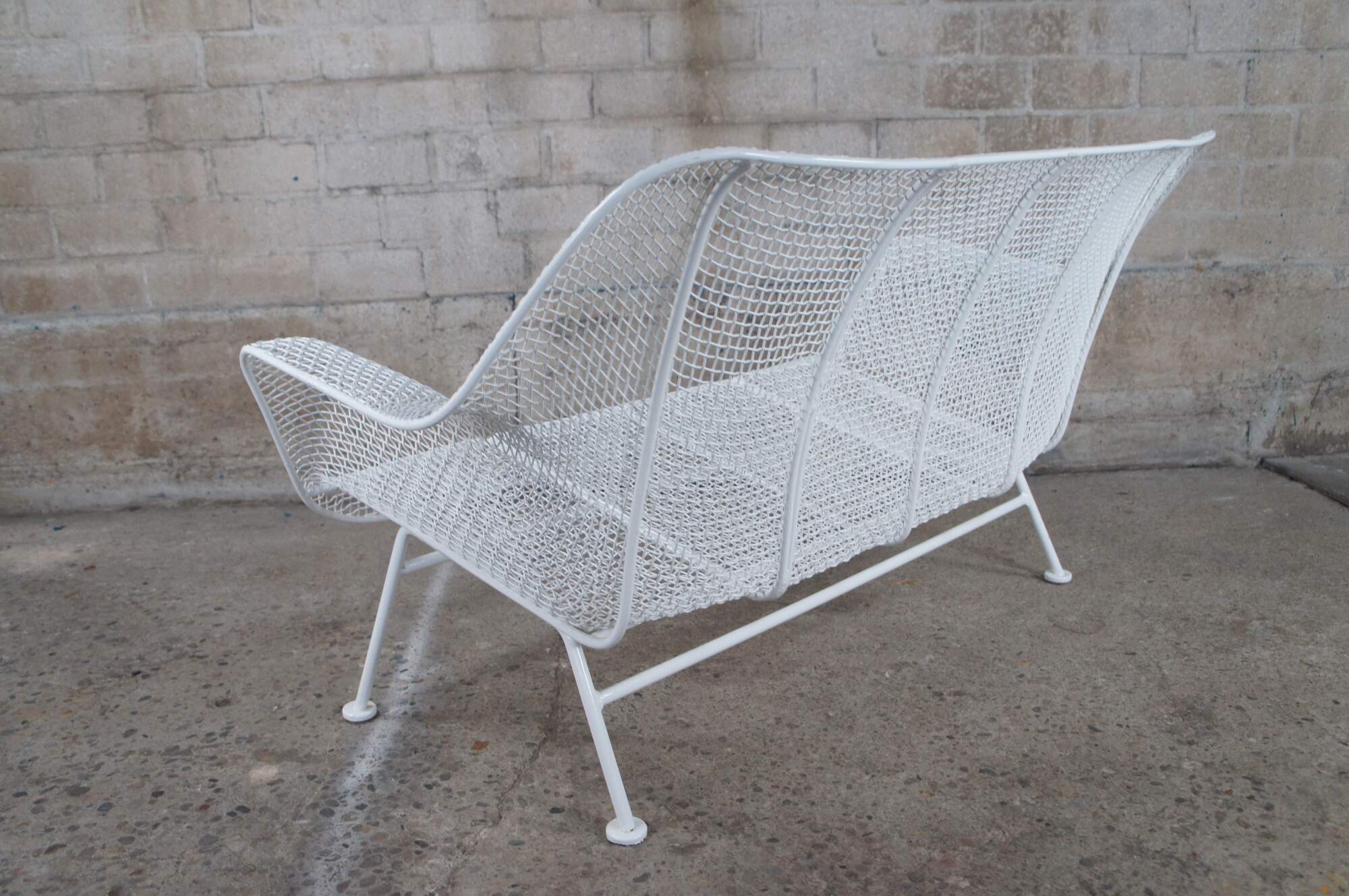 Mid century modern Russell Woodard Sculptura bench / settee / loveseat. Made of wrought iron and mesh featuring a sculptured ergonomic design.