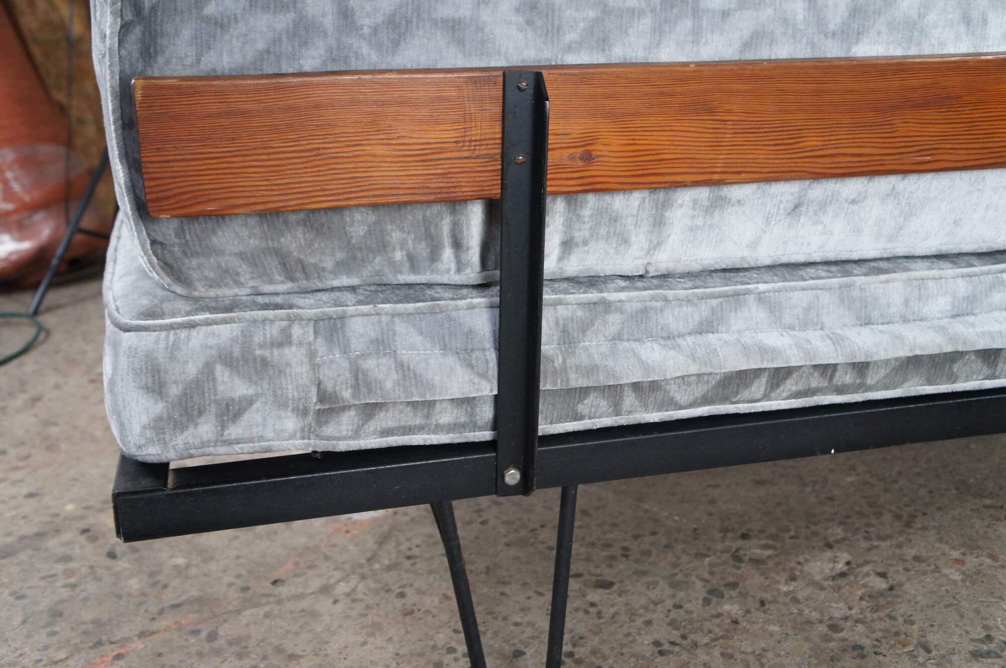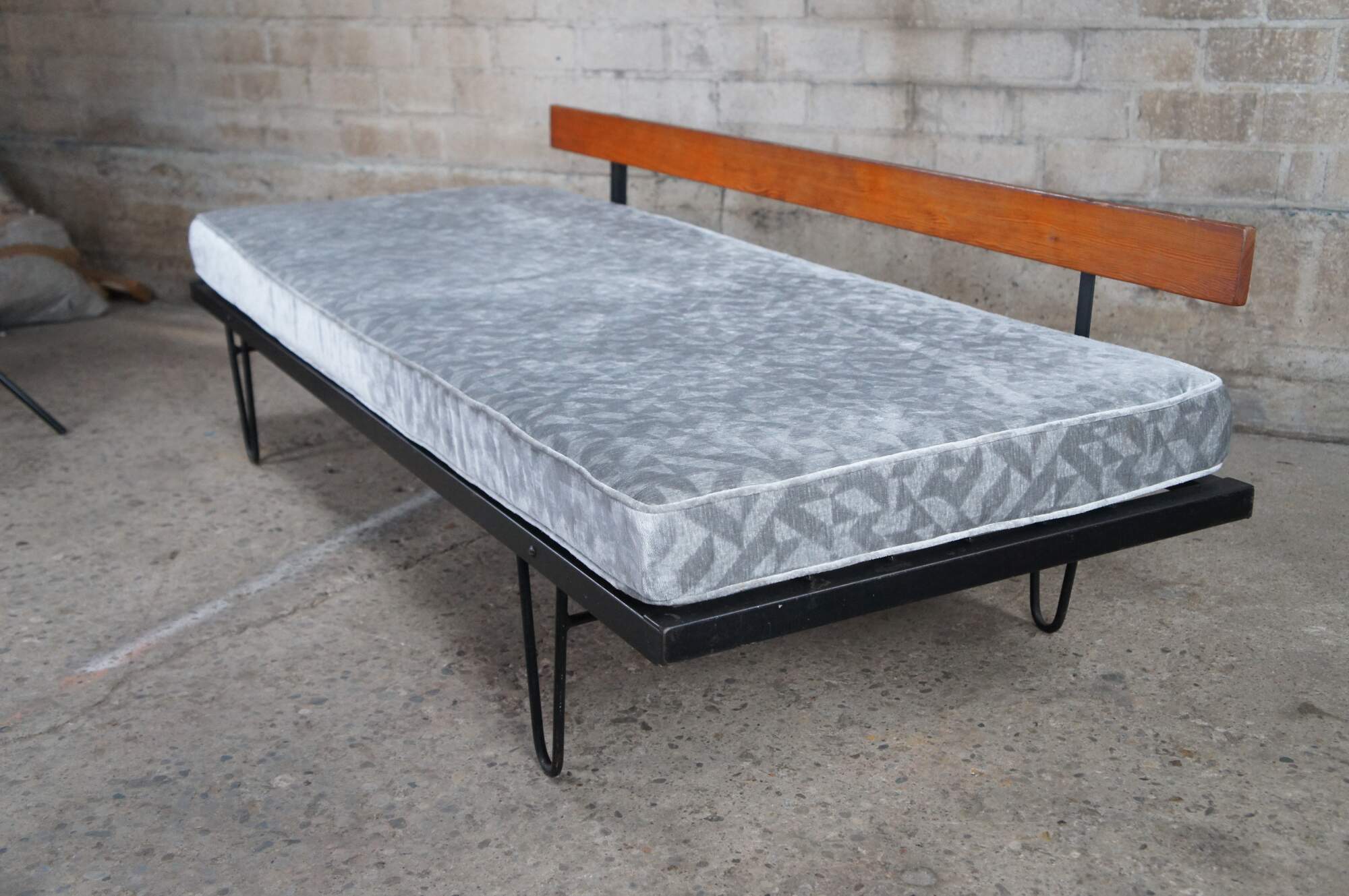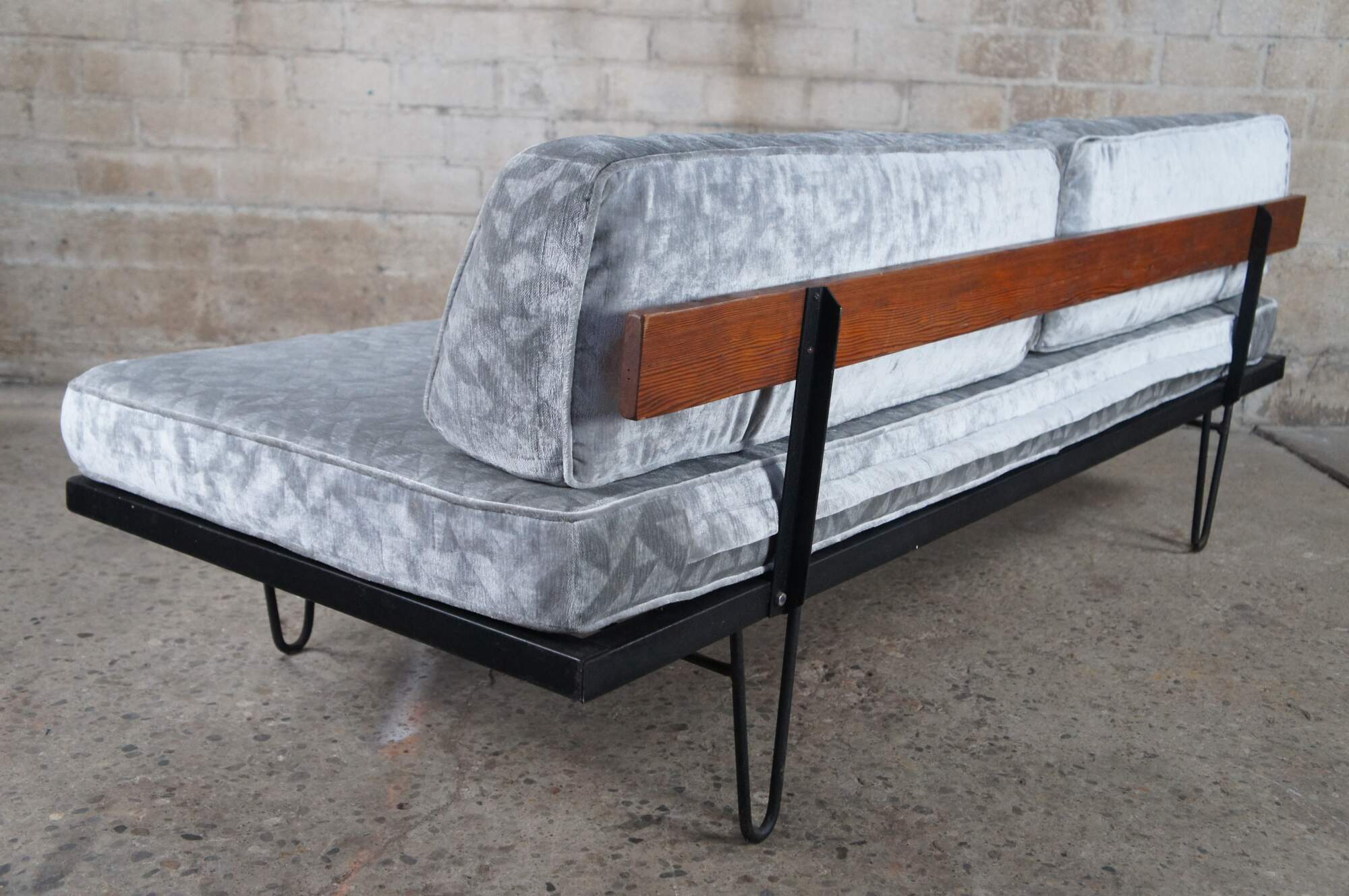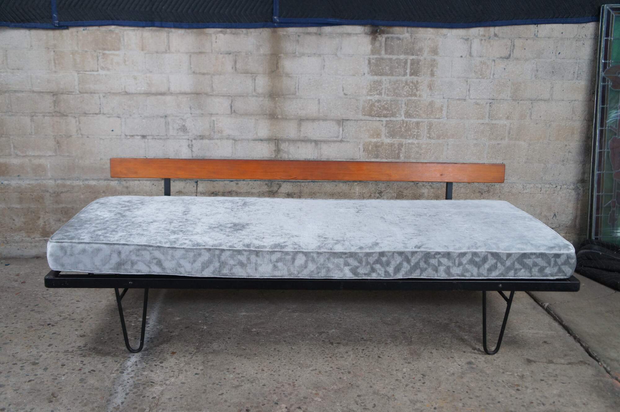 Mid century modern George Nelson for Herman Miller Case Study daybed / sofa / couch / chaise lounge featuring iron hairpin legs with pine back support and upholstered cushions.