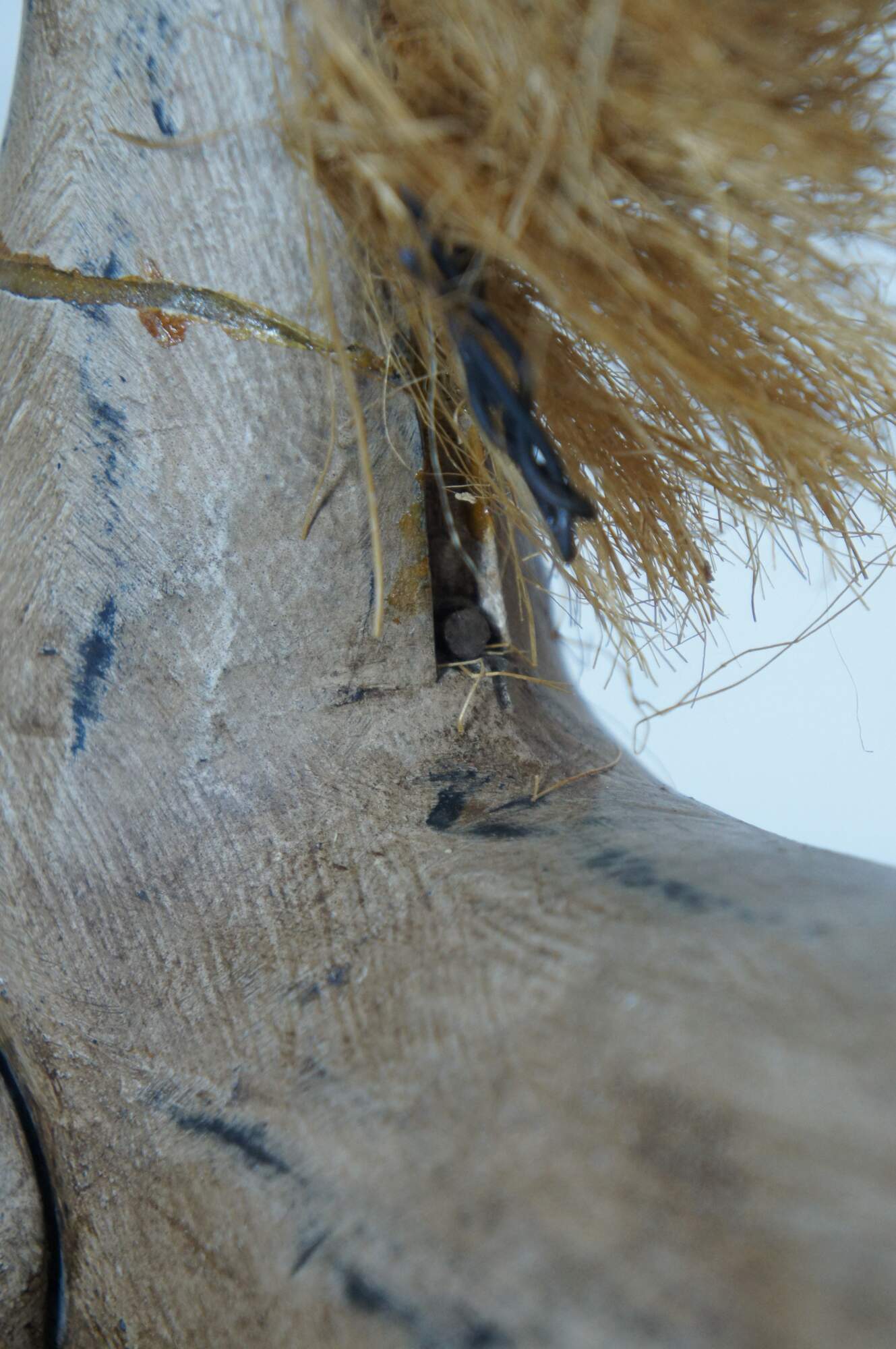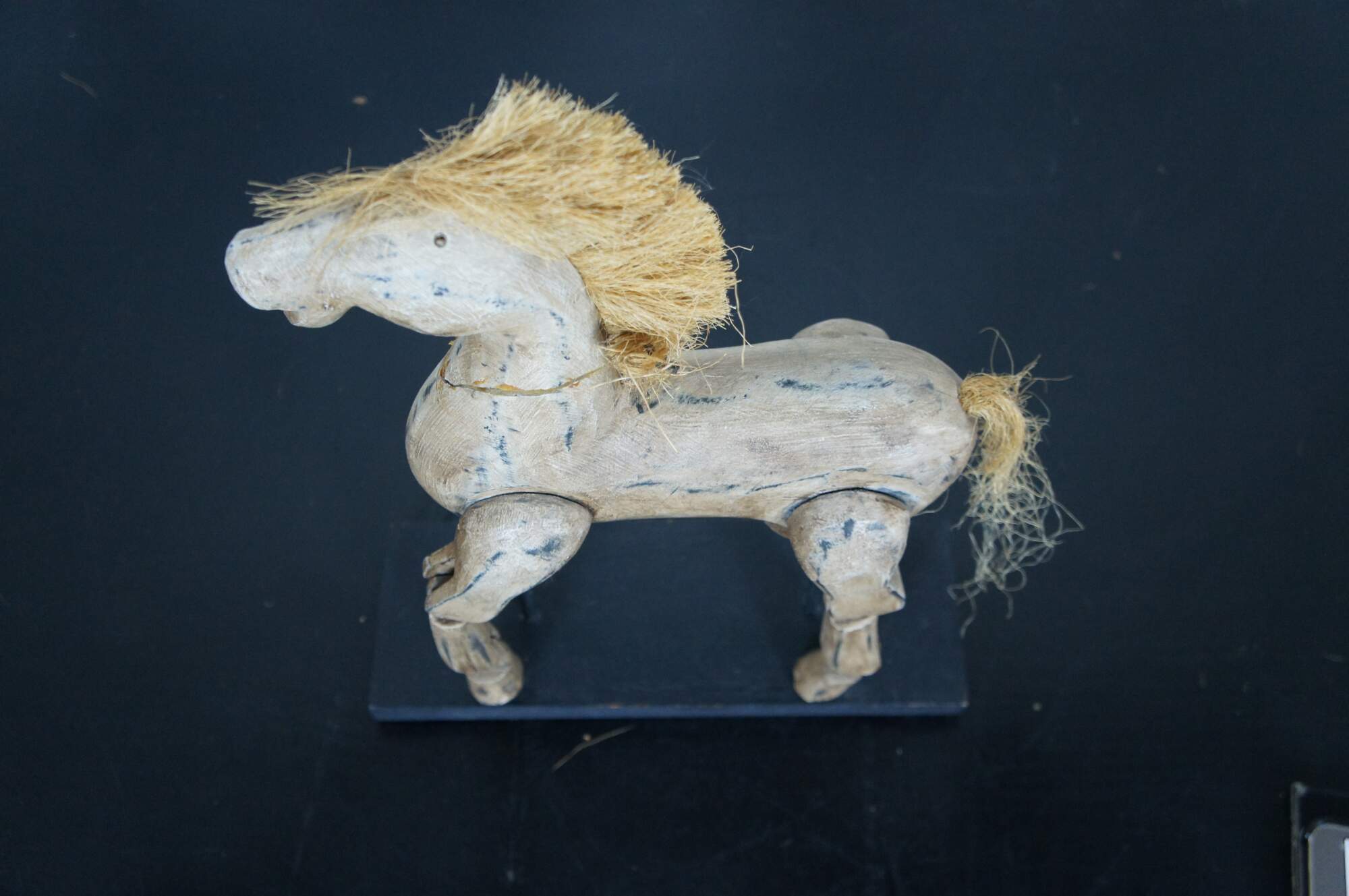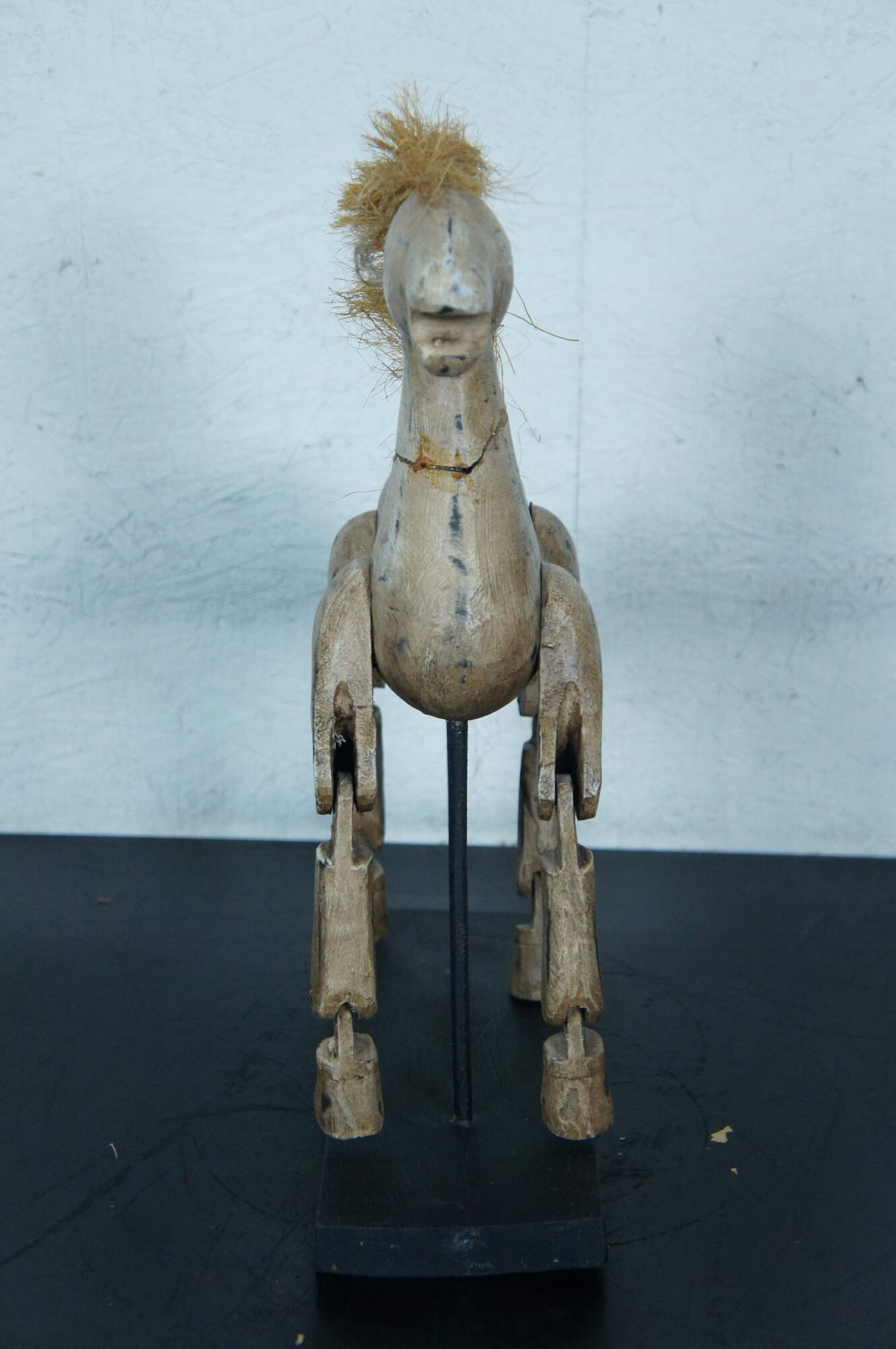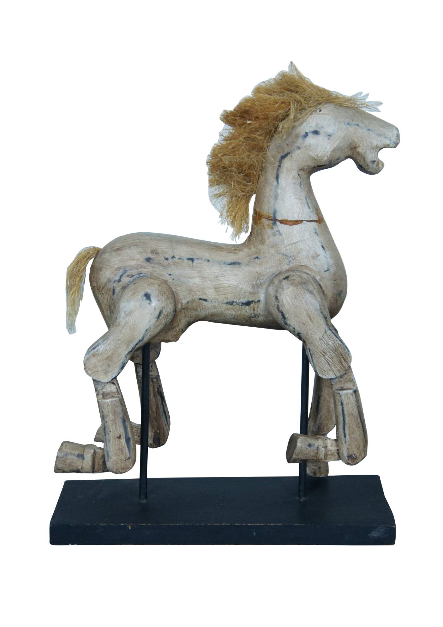 Vintage 20th century hand carved toy horse statue / sculpture / puppet with articulated legs. Artistically distressed paint; worn raffia / straw mane and tail. Mounted with two rods on a black wood stand.