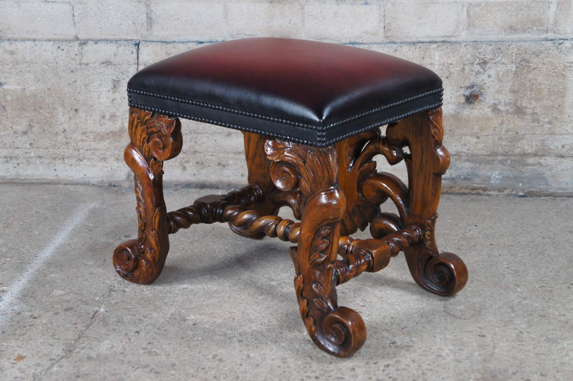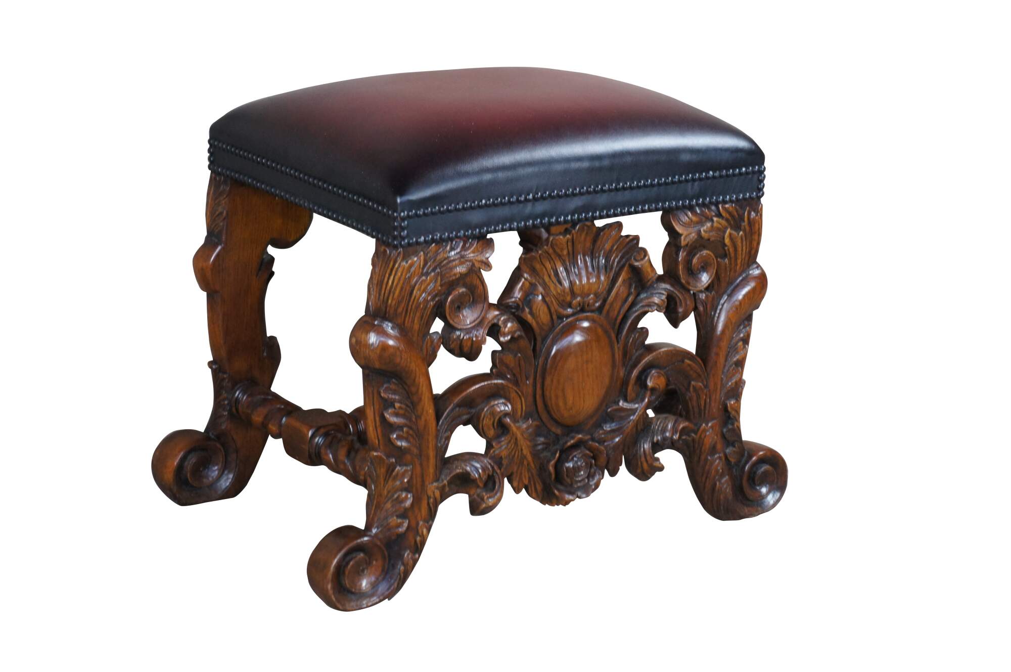 Vintage Theodore Alexander Baroque Rococo carved mahogany foot stool / ottoman / bench featuring leather seat with nailhead trim, a pierced and scrolled foliate / floral rose / acanthus design with oval crest, and barley twisted stretchers.