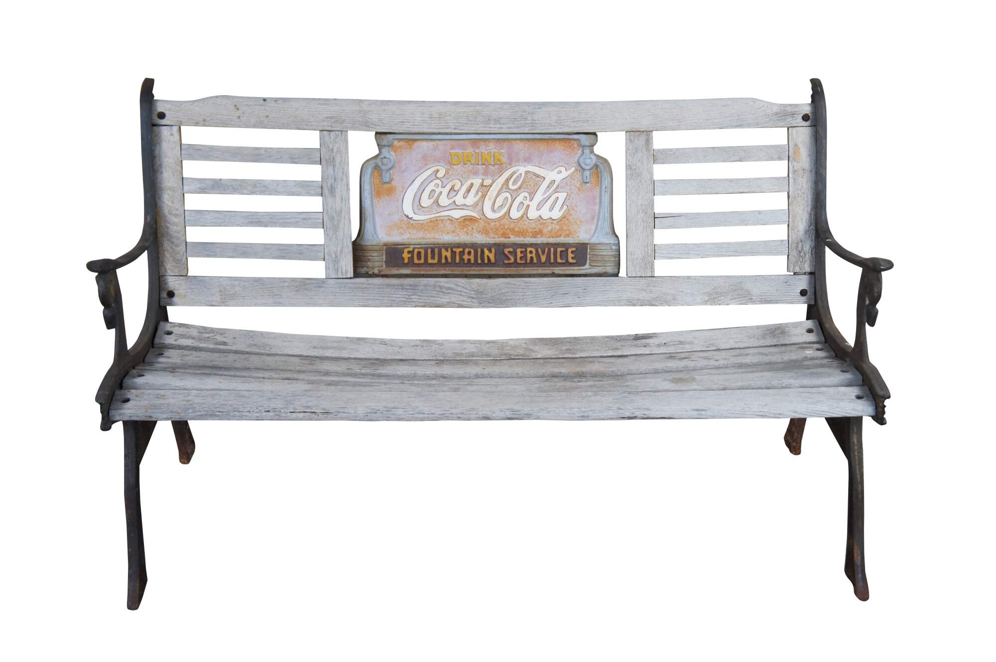 Antique Drink Coca Cola Fountain Service bench. Made of cast iron and wood featuring an inset advertising sign.