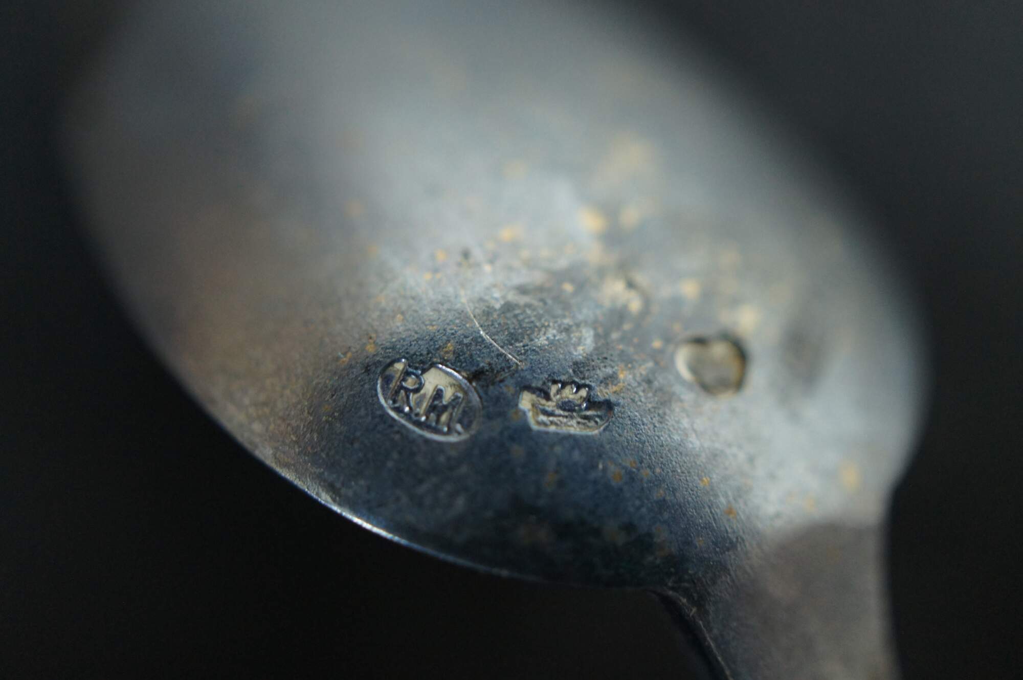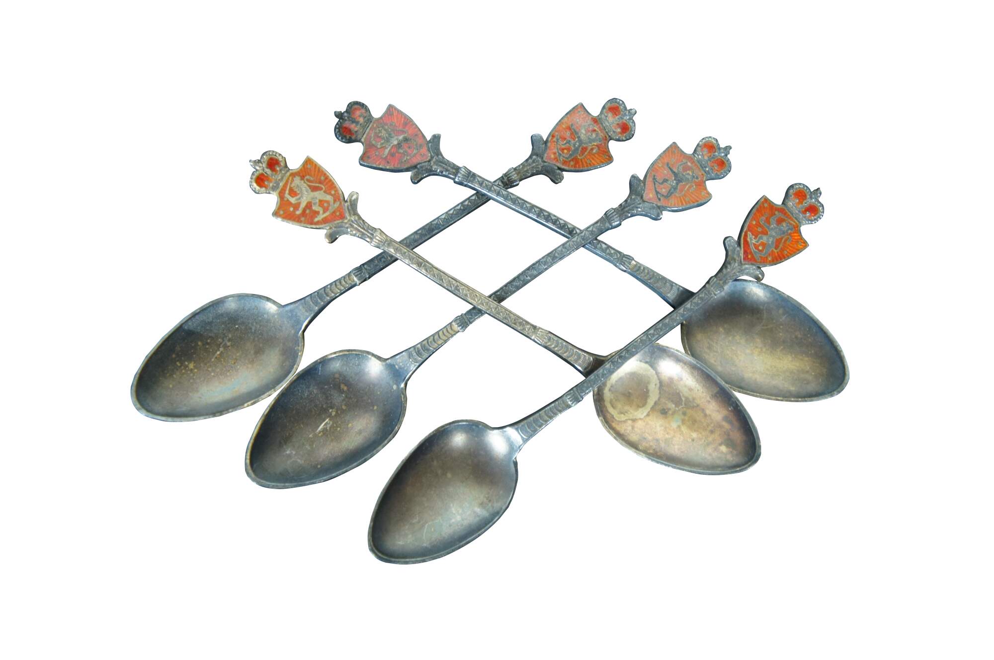 Set of 5 antique (circa 1895-1897) 813H sterling silver and enamel coffee / demitasse spoons. Feature patterned handles with feather plumes supporting the red enamel heraldic coat of arms of Finland, depicting a lion with a sword on a crowned shield. Made in Helsinki, Finland by maker with initials RM. Includes box.