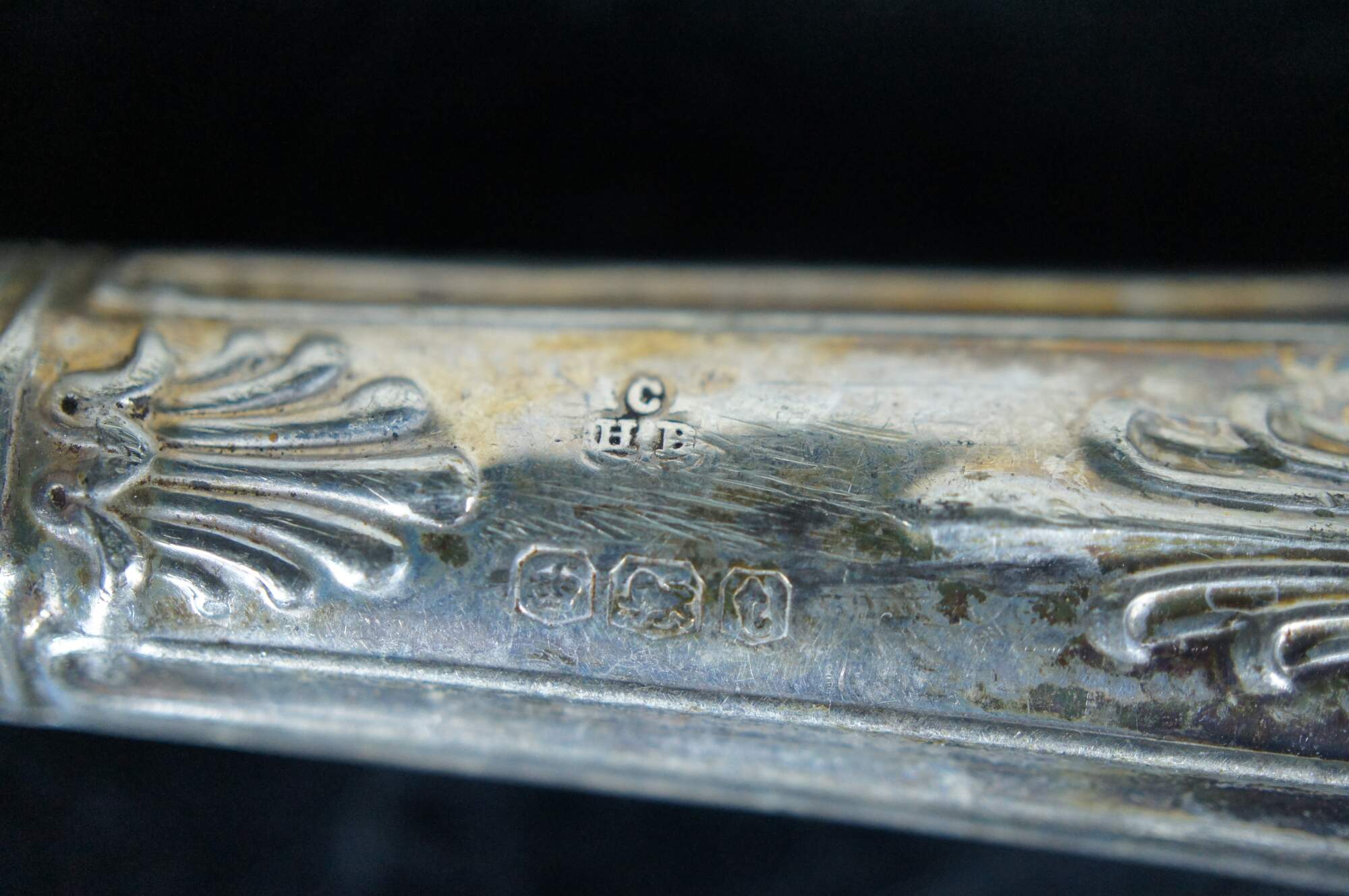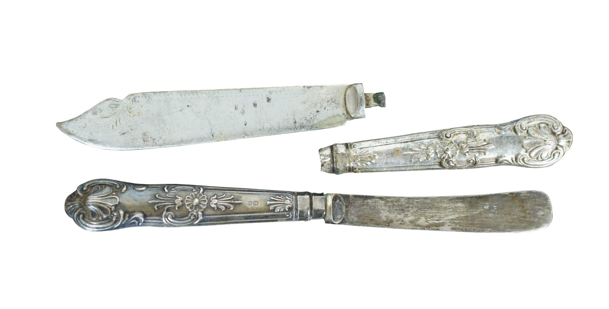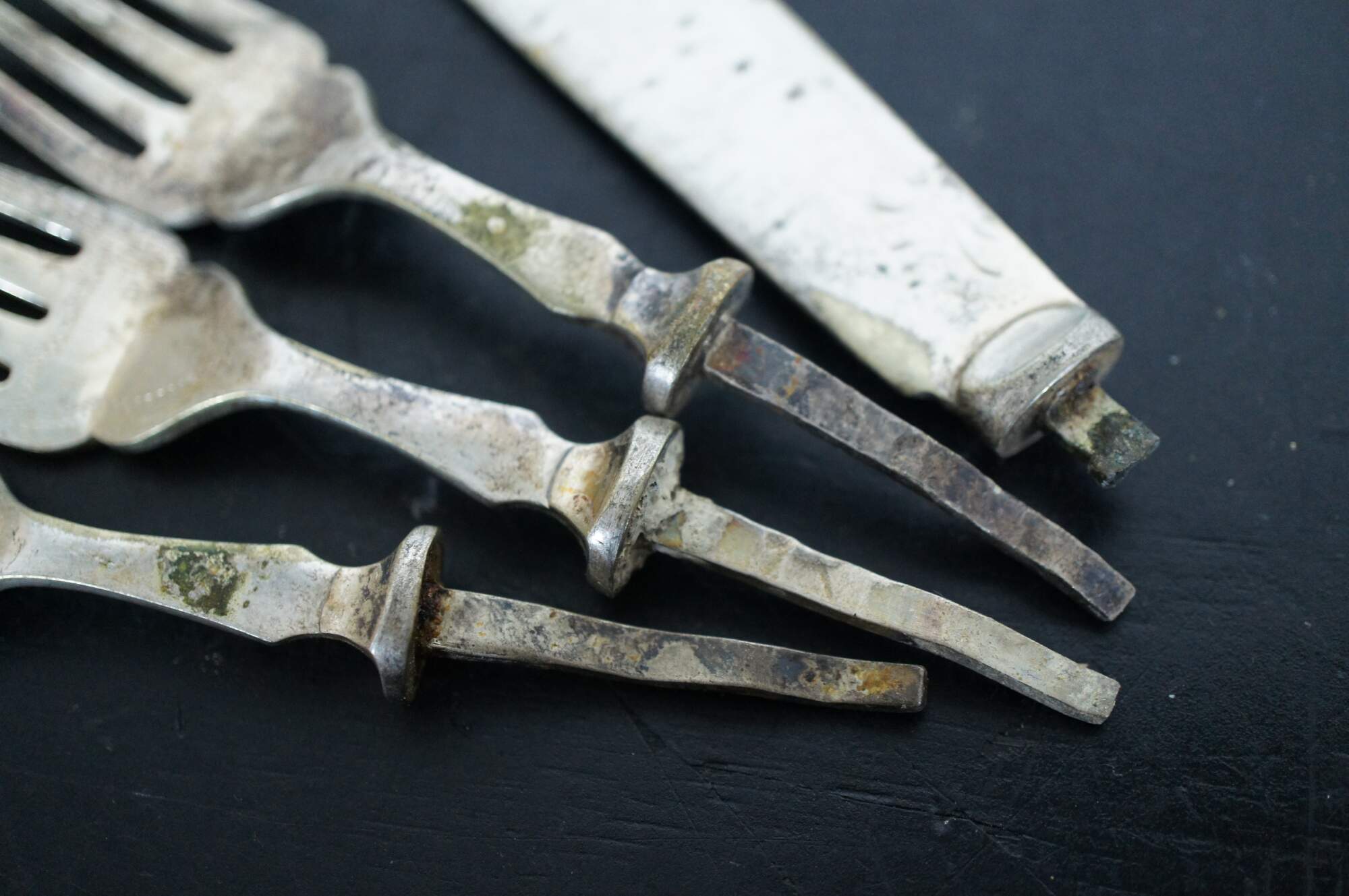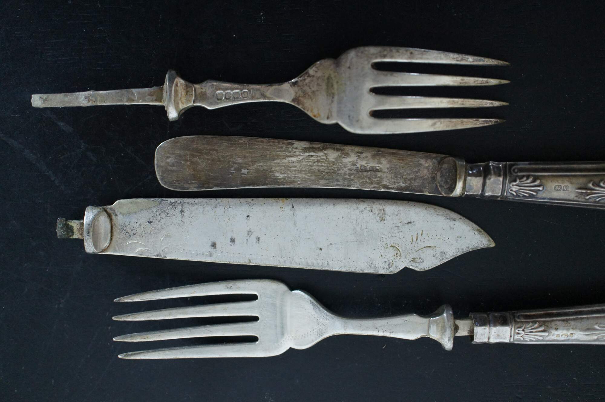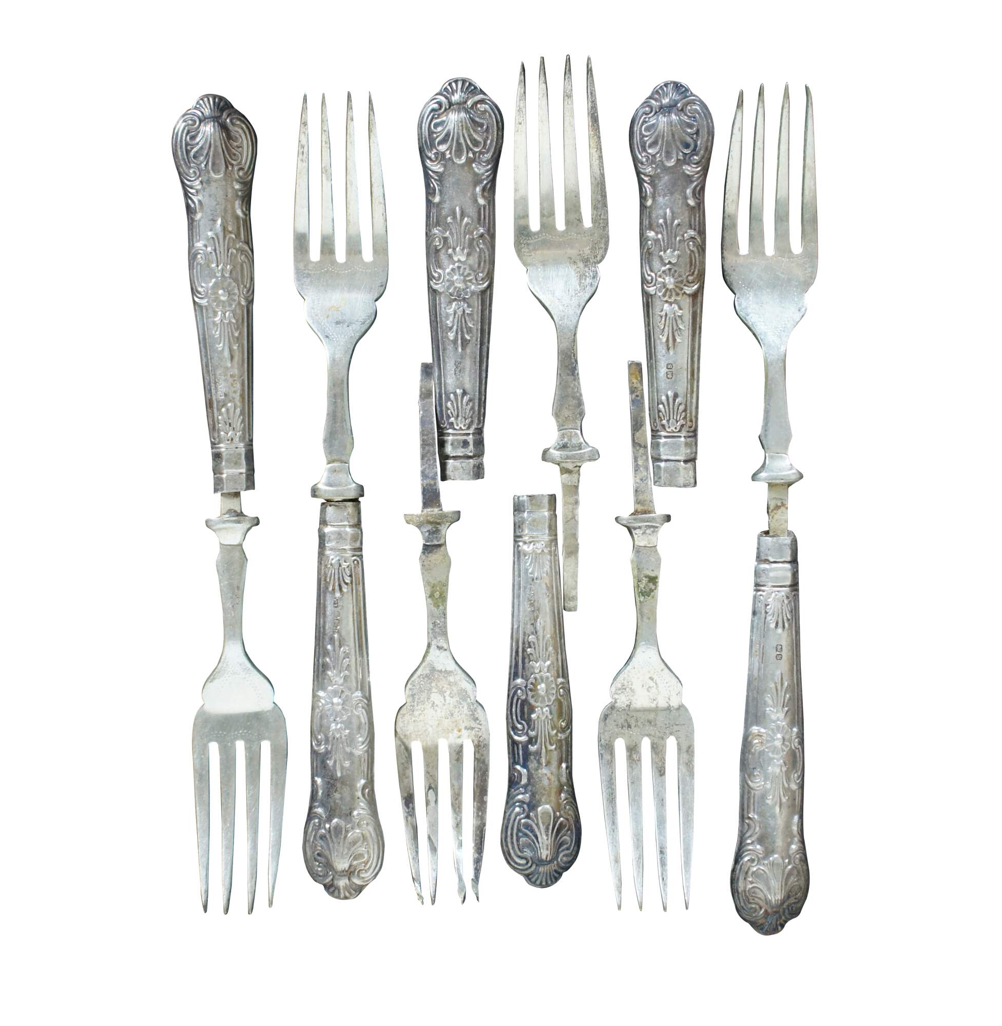 Lot of 6 early 20th century dinner forks plus 2 table knives with sterling silver handles. The majority of handles and tops are detached from one another. The handles all feature the same scallop shell and floral design, produced / finished by different companie: William Yates, Ltd (1928 / 1935), SM&W Co (1936), and CH Beatson (1936).