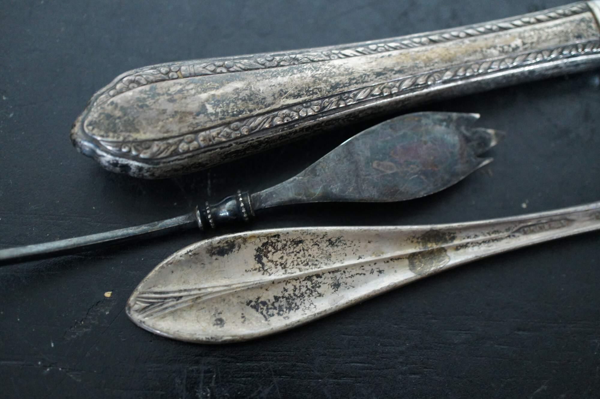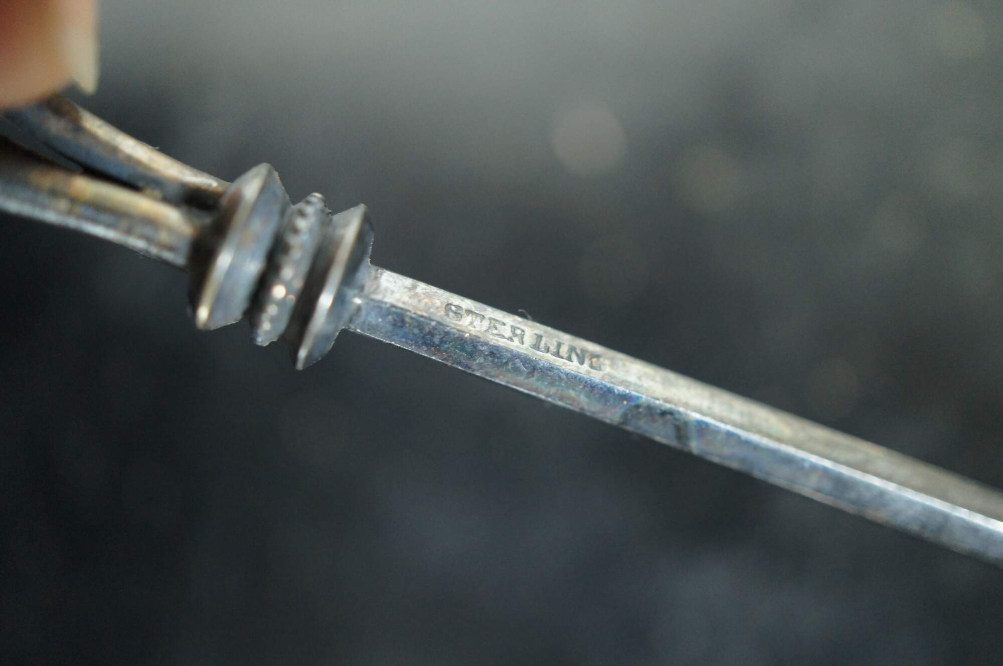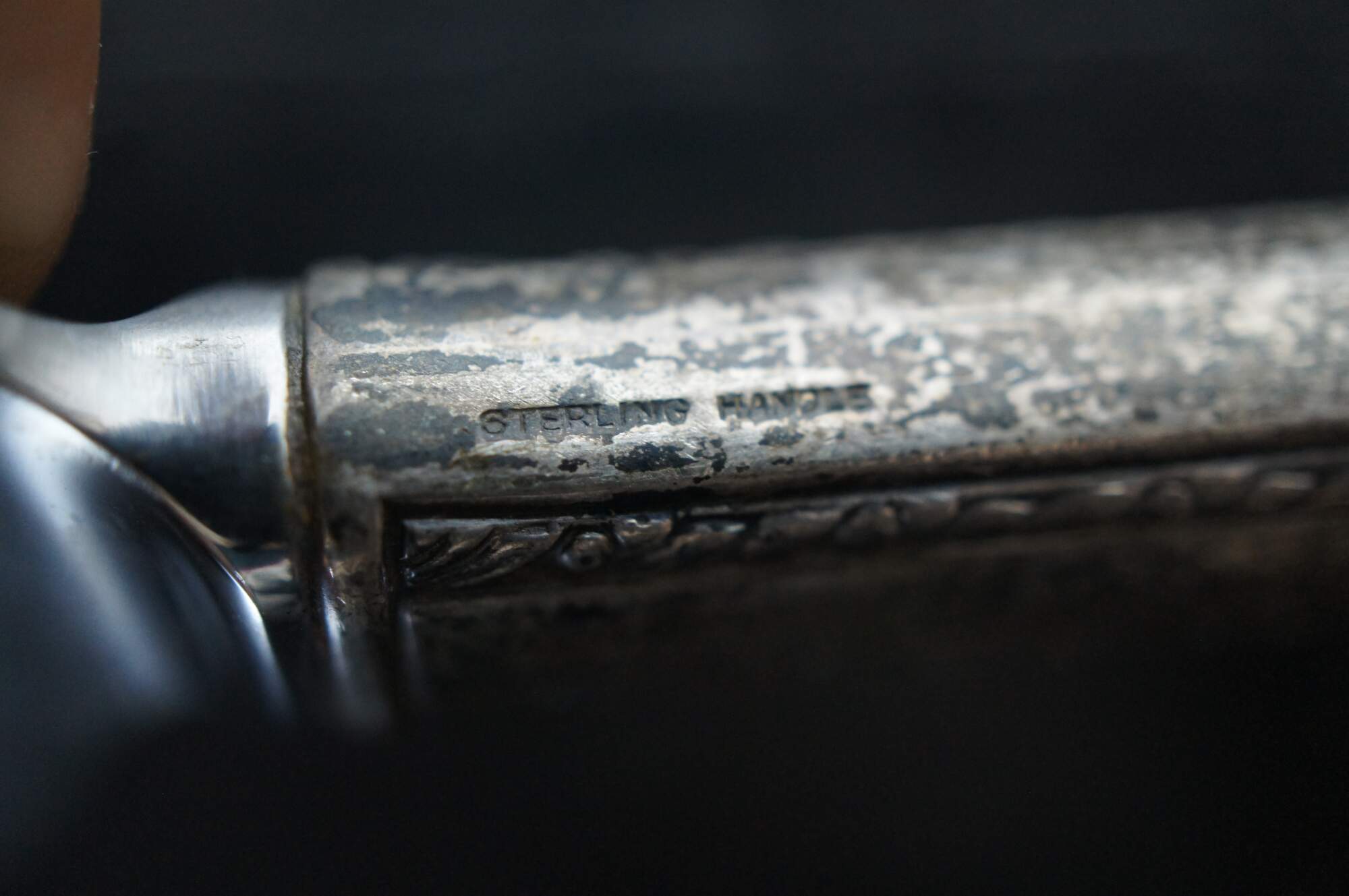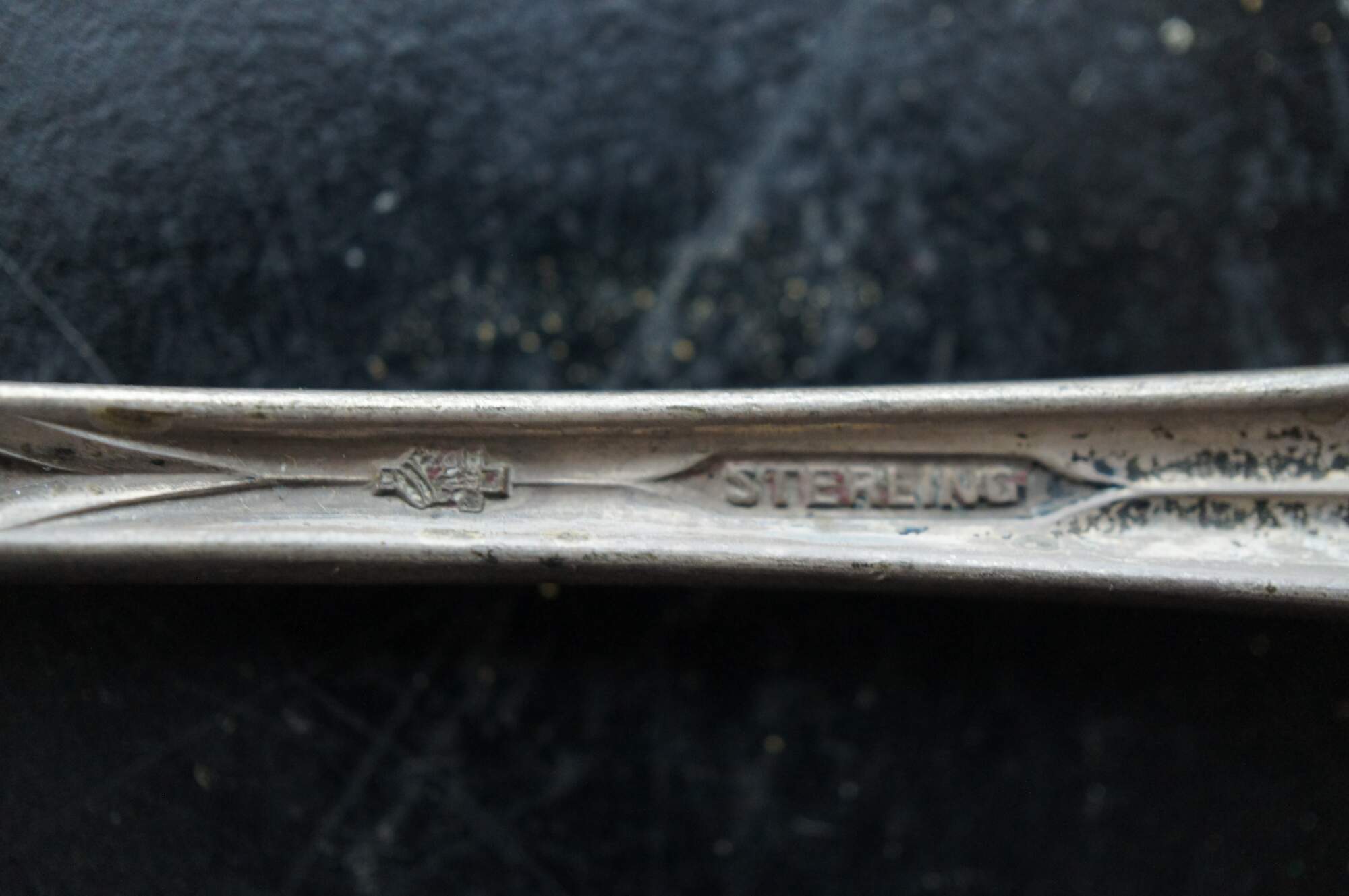 Set of three antique sterling utensils including a cake server, a table spoon, and Whiting sauce gravy bucket shaped ladle.