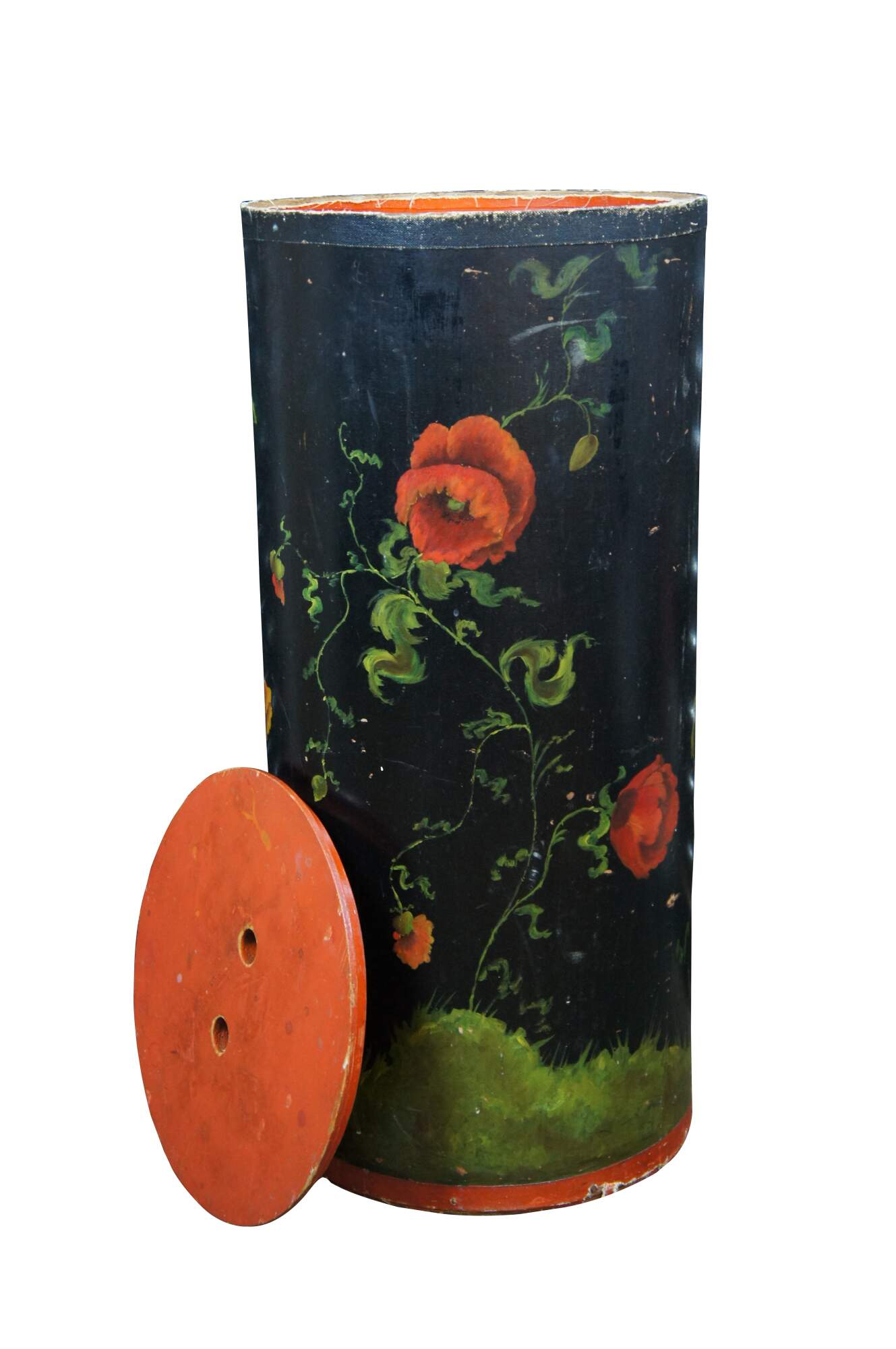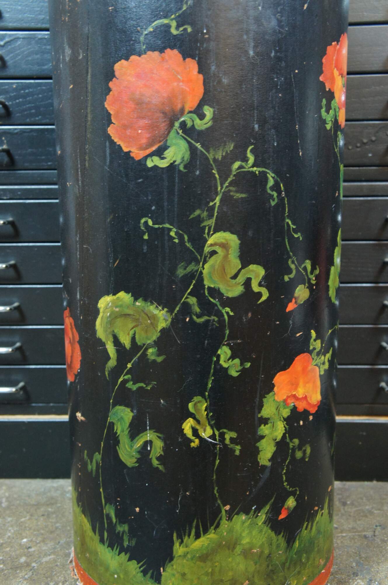 Vintage clothes hamper / waste basket / cane / umbrella stand - cylindrical thick paper mache body with wooden base and lid. Painted in the style of folk art toleware with green and red poppies on a black background.