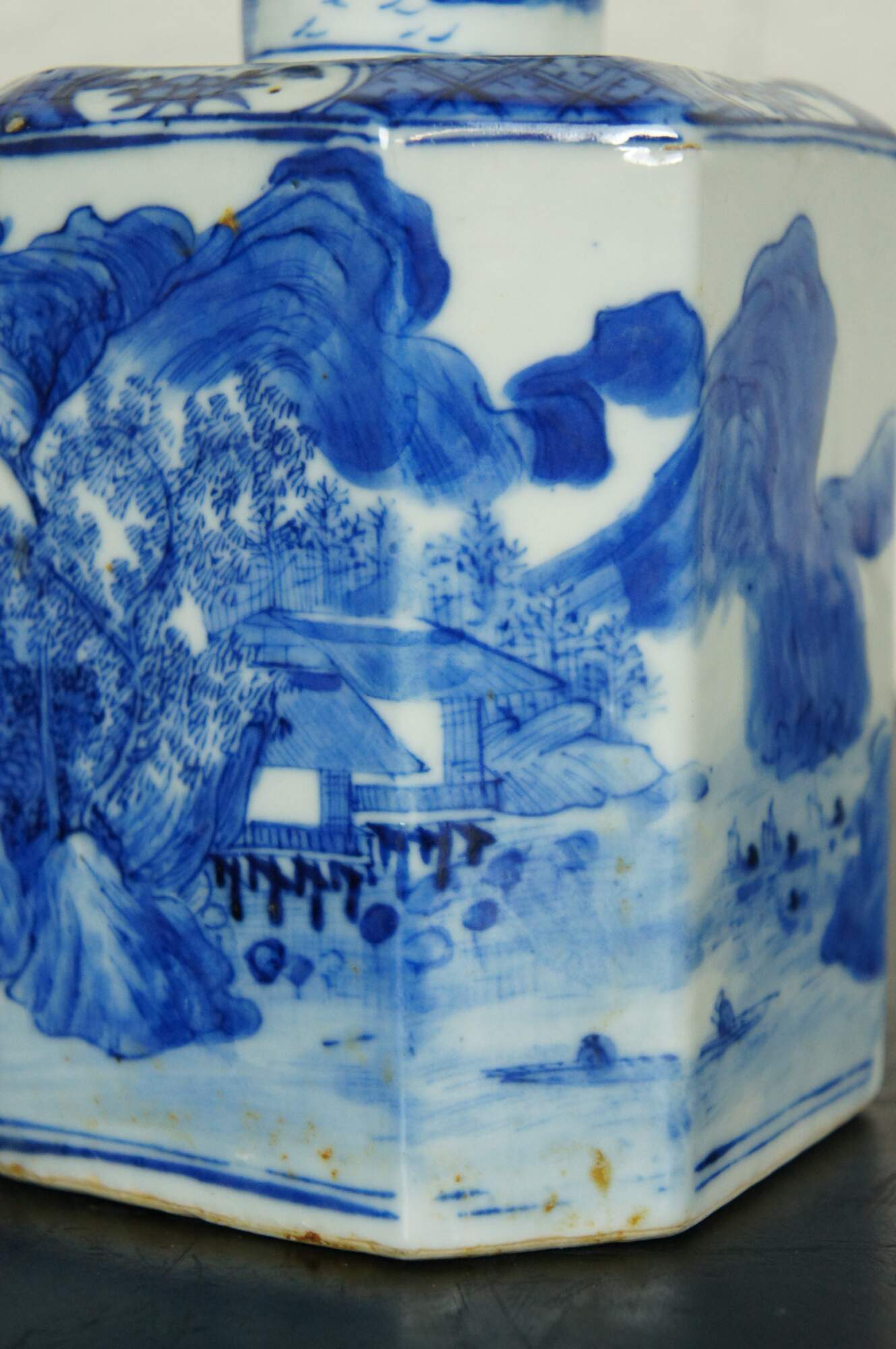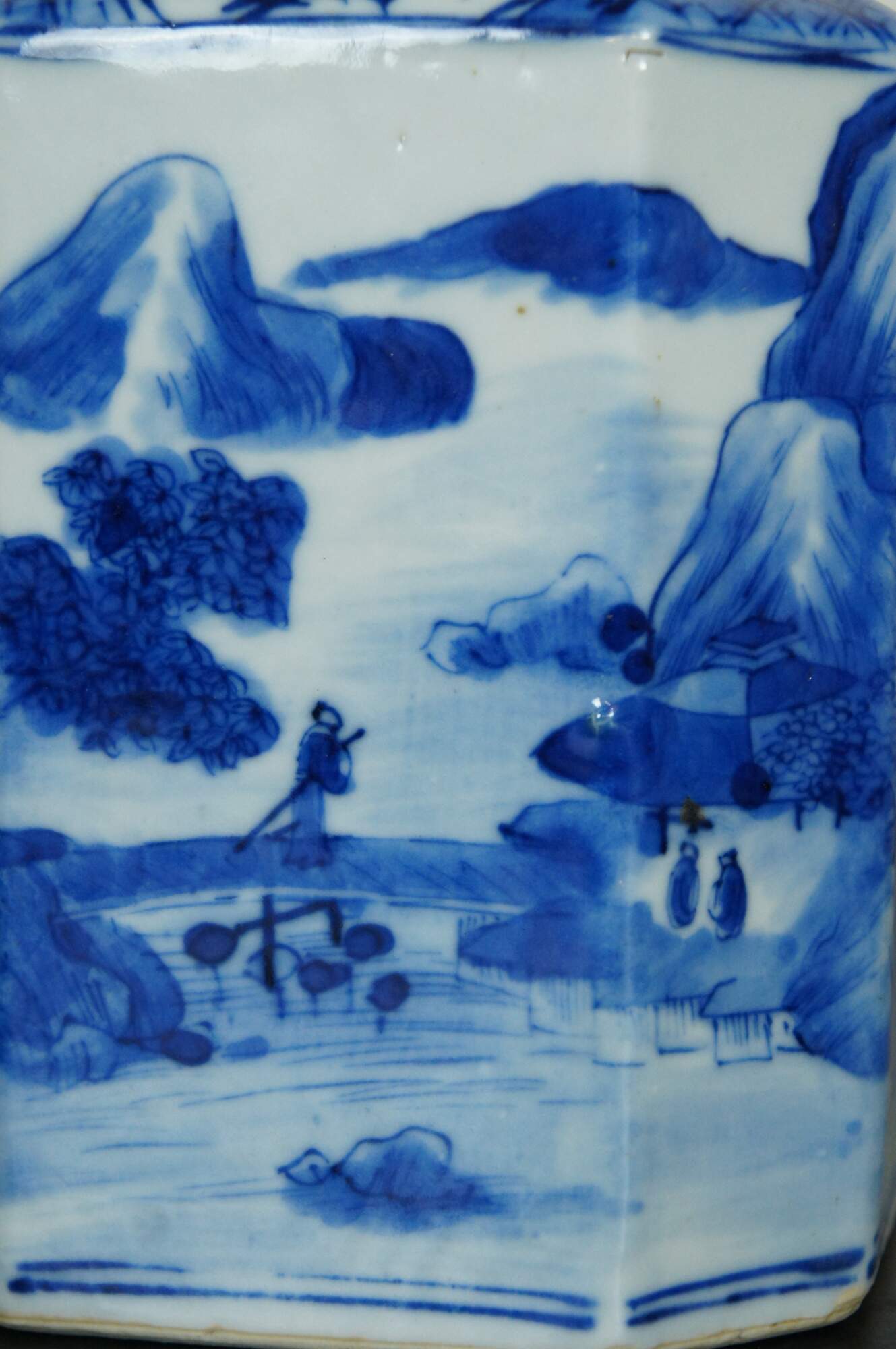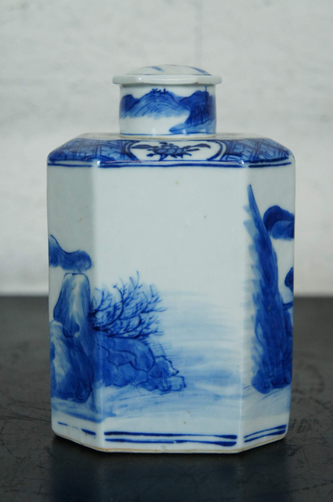 Blue and white Chinese porcelain octagonal tea caddy with round lid, painted with figures, boats and a village in a sweeping landscape surrounded by mountains, the top finished with a floral motif.