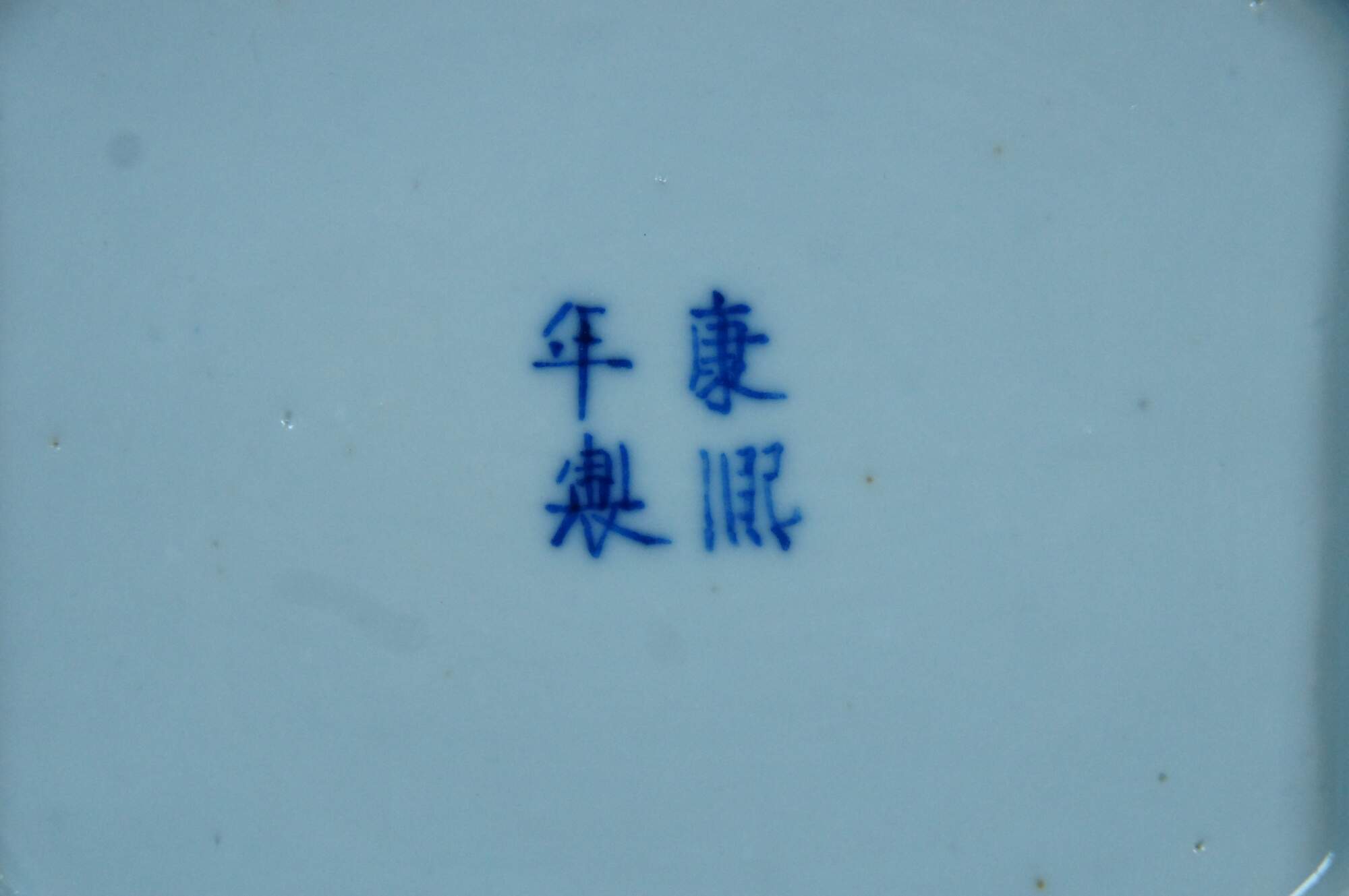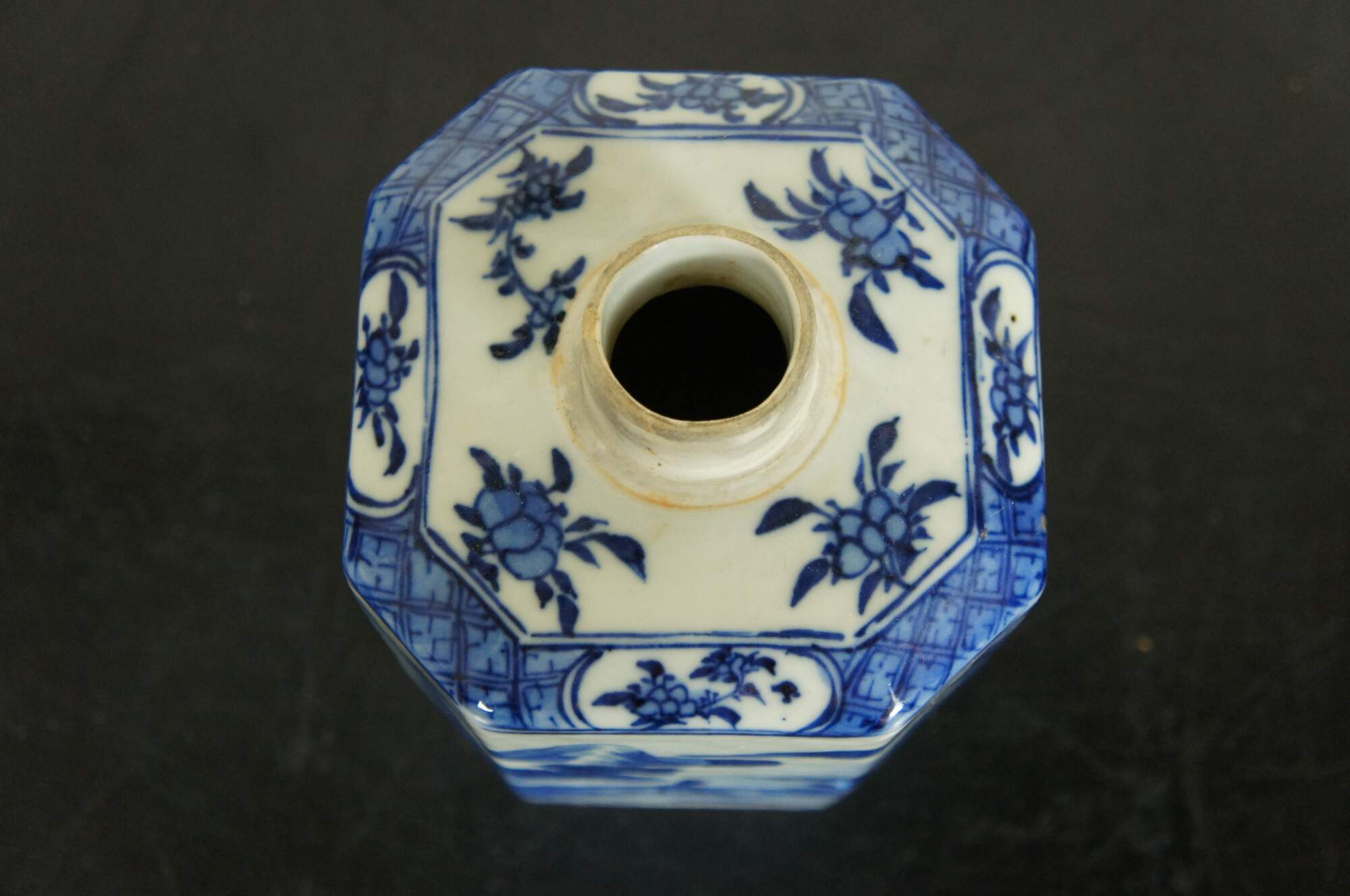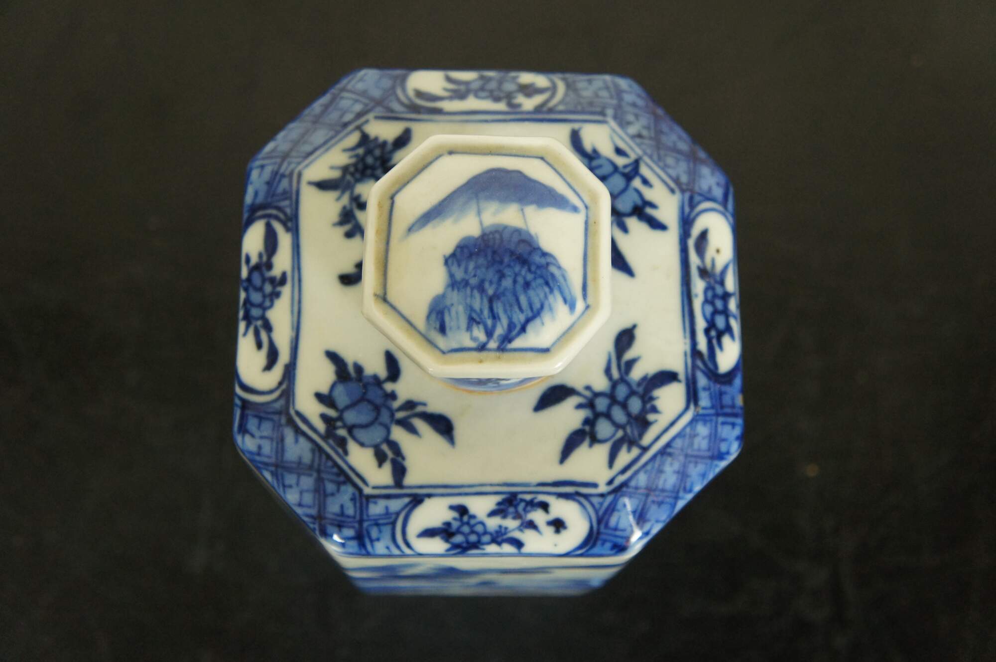 Blue and white Chinese porcelain octagonal tea caddy with round lid, painted with figures, boats and a village in a sweeping landscape surrounded by mountains, the top finished with a floral motif.