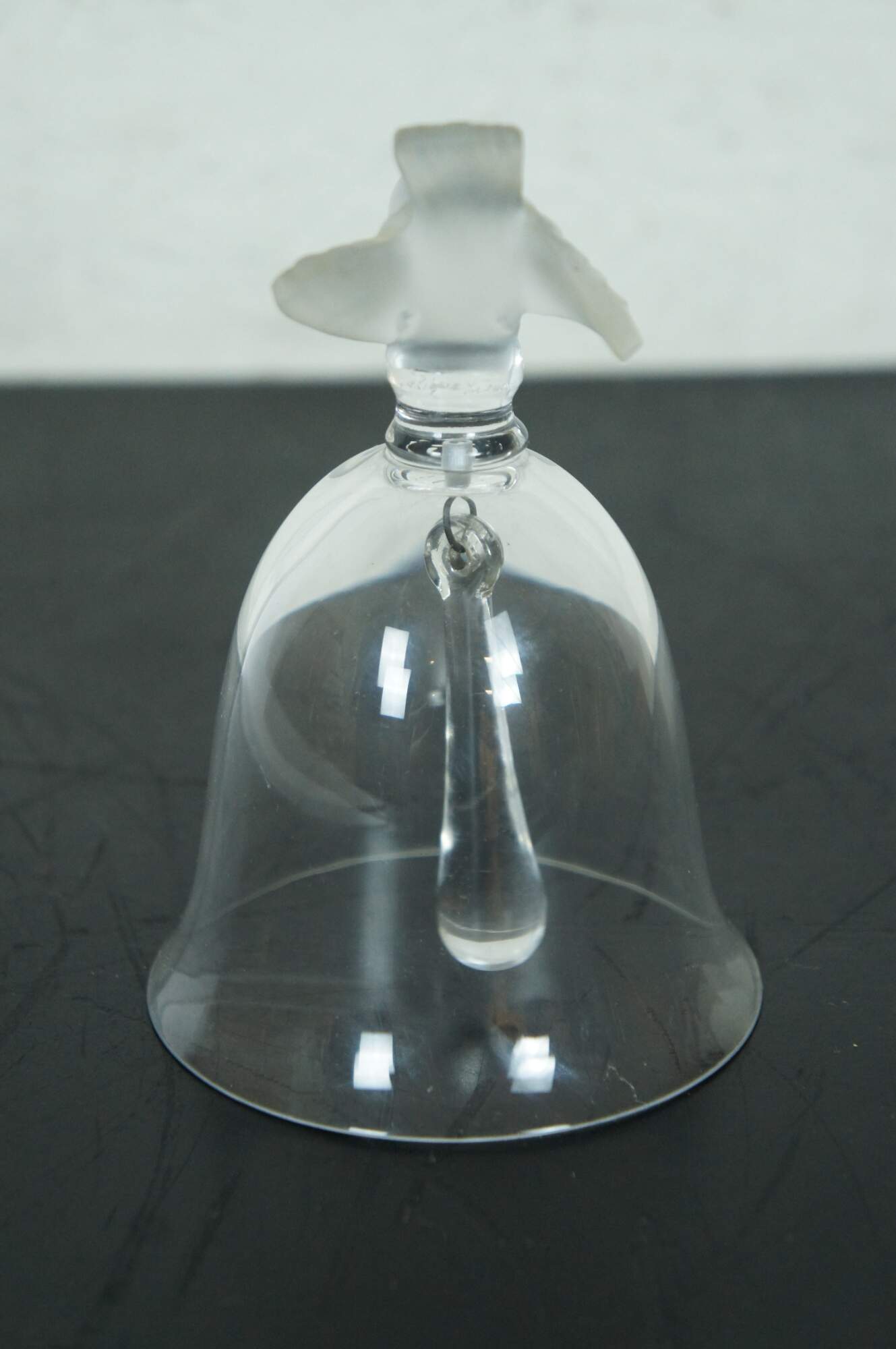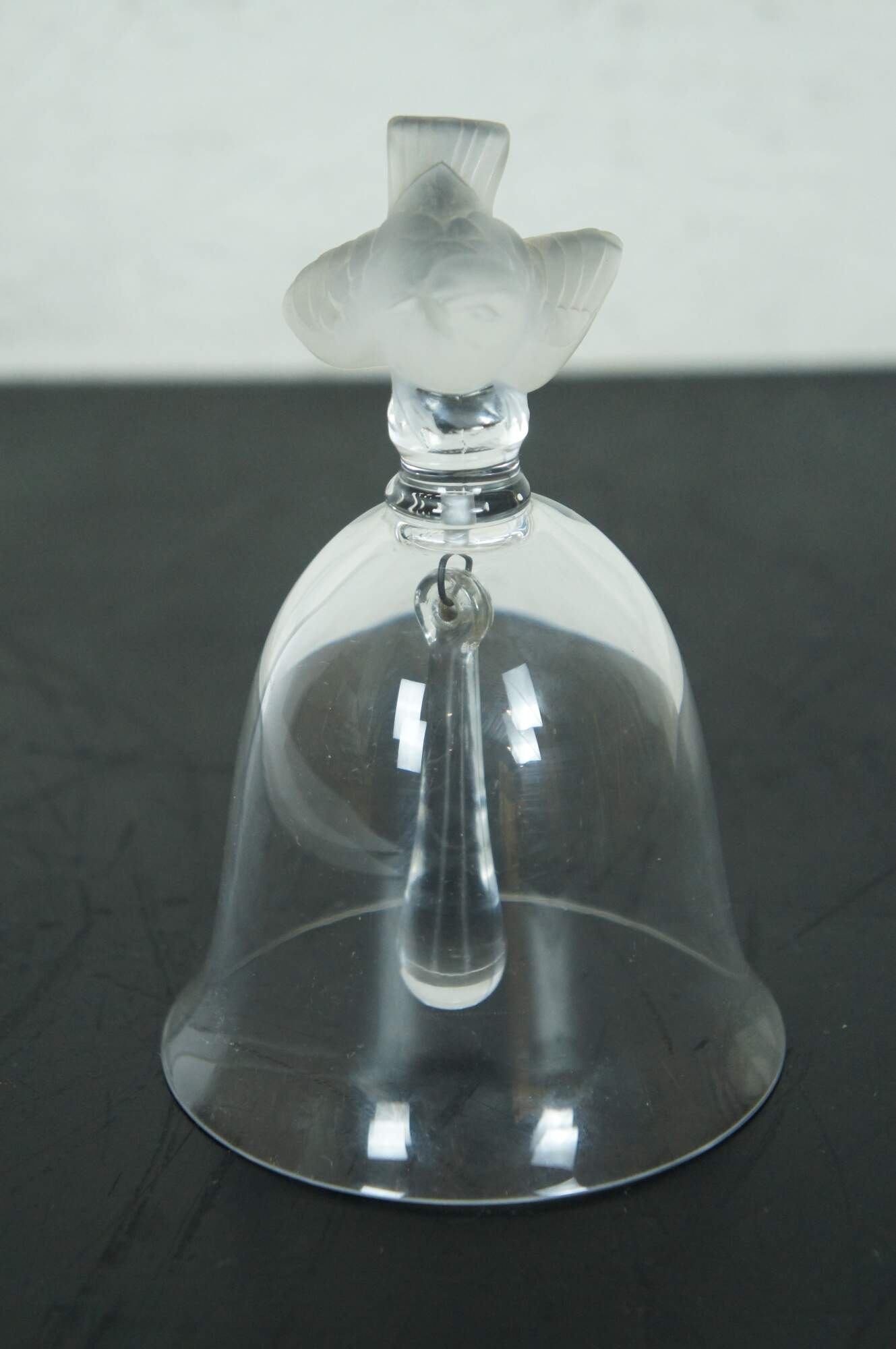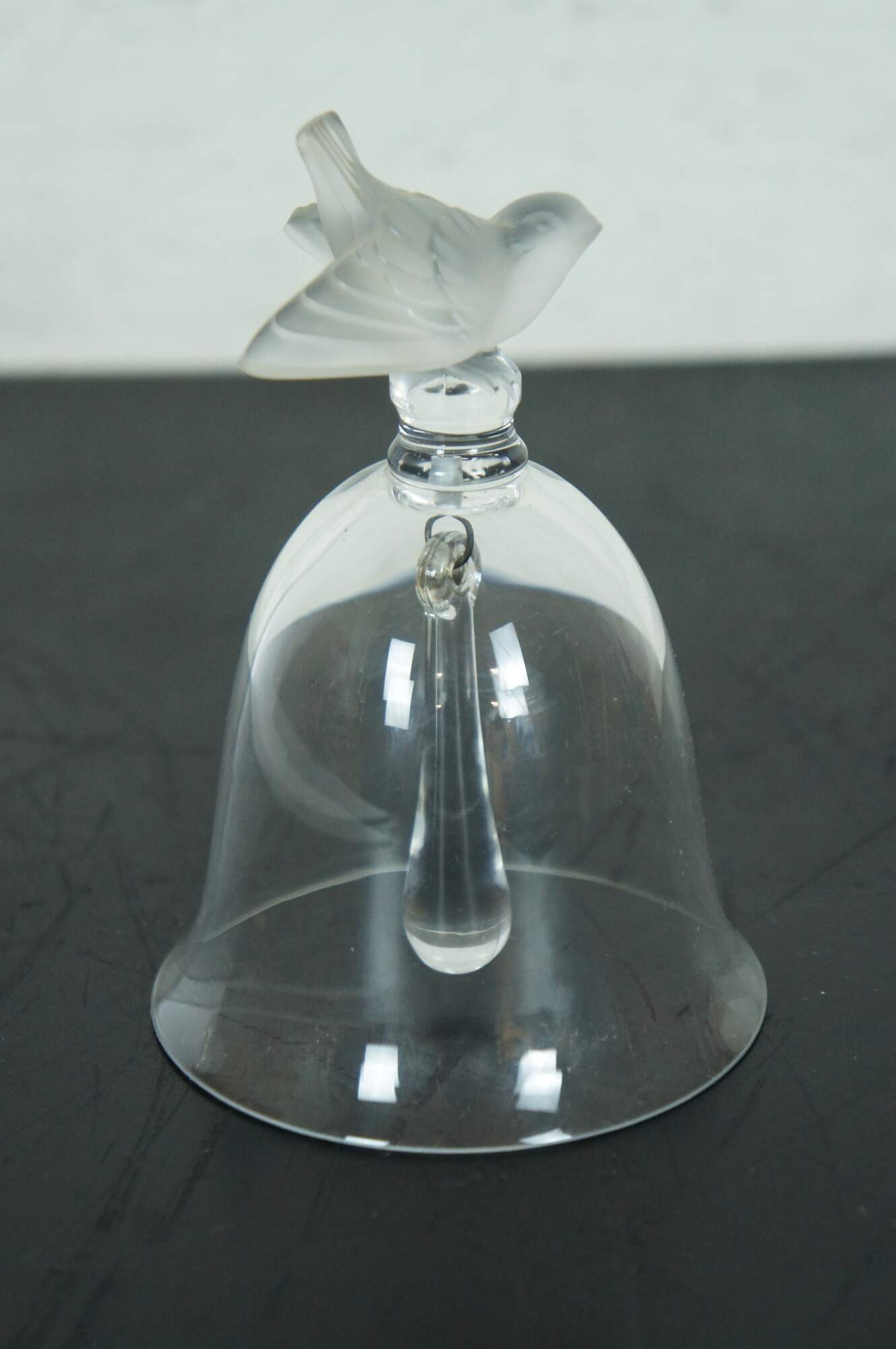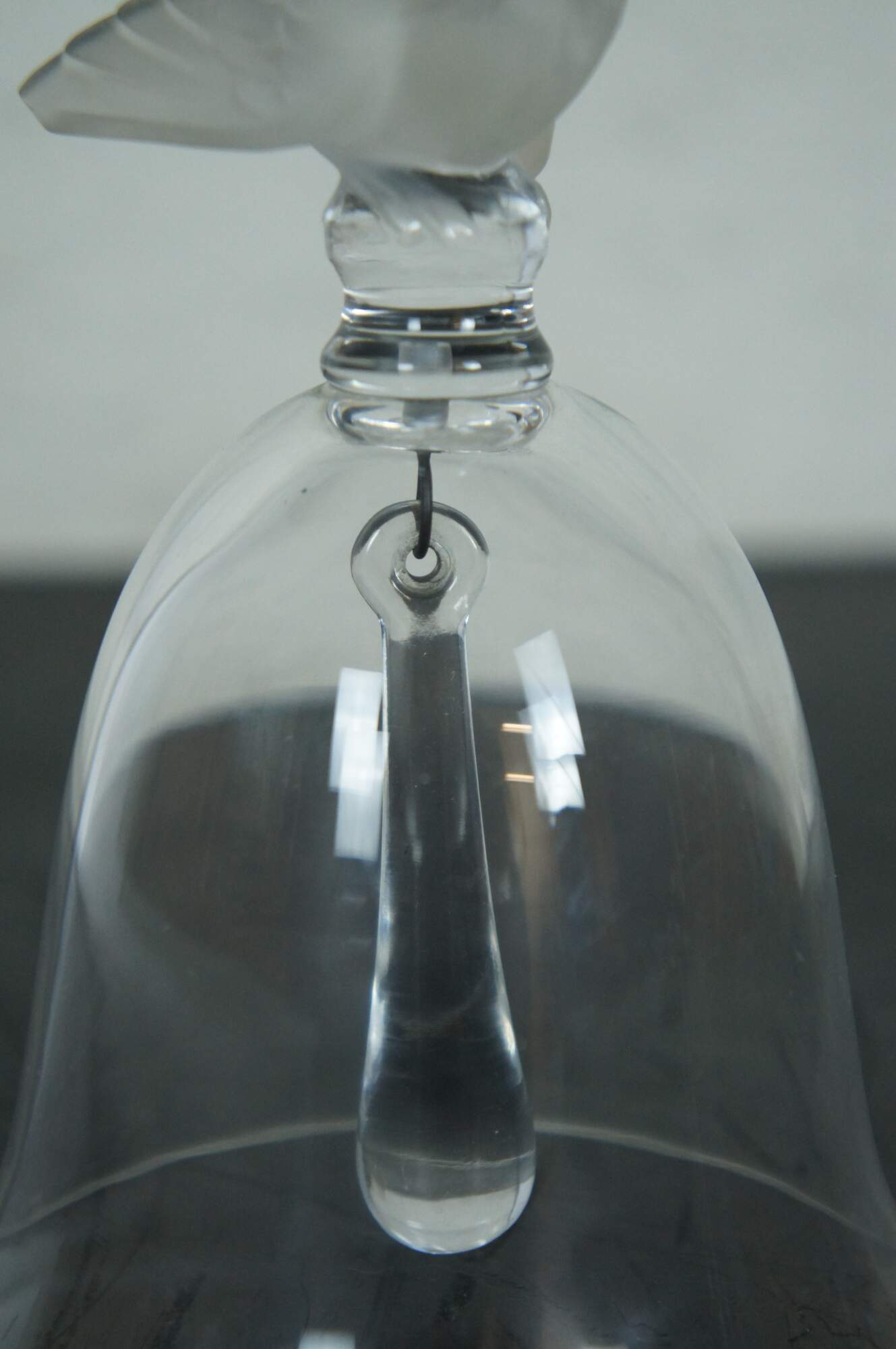 Late 20th century Lalique clear crystal hand bell with tear drop shaded clapper and frosted handle / finial in the shape of a small bird / sparrow with open wings. Signed at base of bird.
